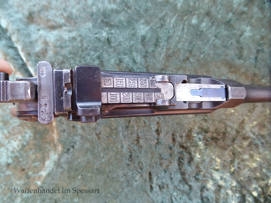 Kal.9mmLuger. Ser.Nr. 6722. Nummerngleich mit nummerngleichem Anschlagkasten. Scharfkantiges fast blankes Laufinnere. Sehr gute originale Brünierung. Gültiger kaiserlicher ziviler U unter Krone. Schiebevisier bis 500 Meter. Gute stramme Mechanik. Der nummerngleiche Anschlagkasten ist im identischen sehr gutem Zustand. Bei den Griffschalen wurden wuhl im Feld oder in einer kleinen Werstatt, die Nummer gestrichen und danach mit der 6722 geschlagen.
