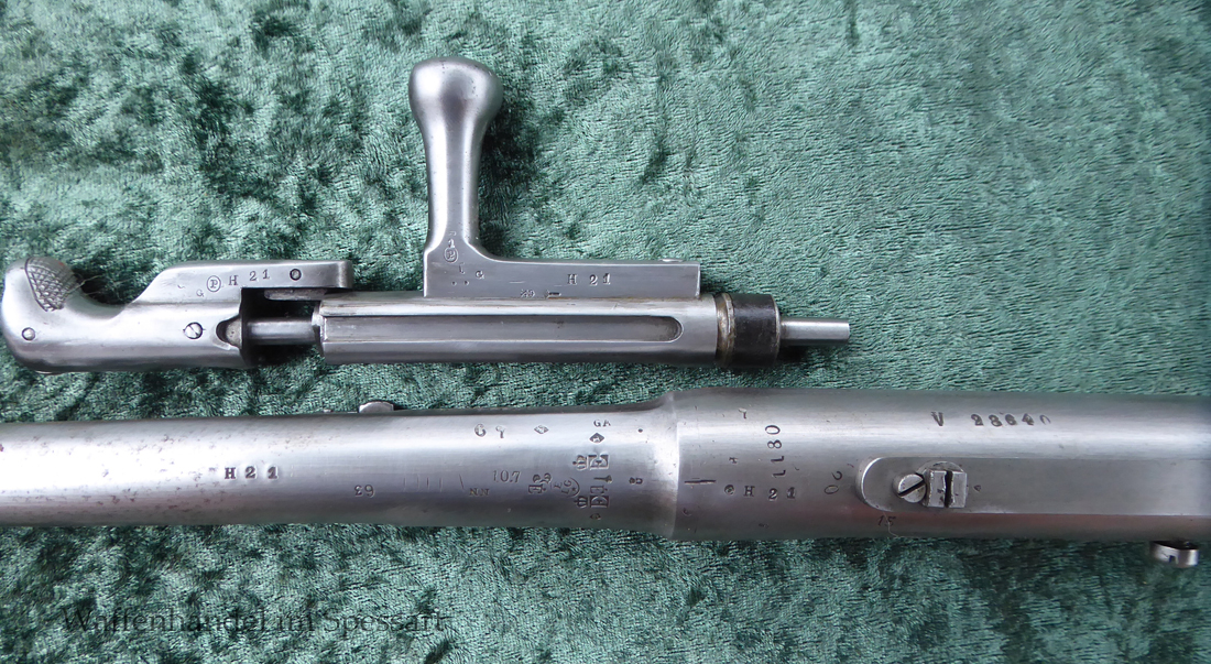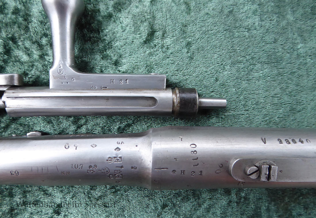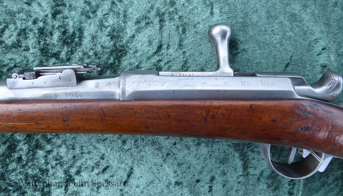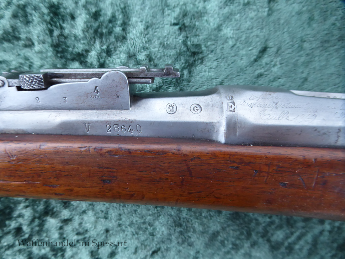 Kal.11mmChassepot Zündnadelpatrone. Baujahr 1868. Ser.Nr. V28640. Nummerngleich. Sogar der Entladestock hat die gleiche Nummer!. Das Laufinnere ist scharfkantig und blank. Die Metallteile haben äußerlich nur geringe Patina. Alle Stempel im Metall sind tief und deutlich. Der schöne Schaft mit sehr gut erhaltenen tiefen Abnahmen! Dieser 1871 gestempelt mit der gleichen Nummer. Dieser ist wohl im Krieg 1870/71 beschädigt und getauscht worden. Er hat auch mehere Abnahmen im Holz als die frühen Gewehre. Die Dichtung ist orignal. (Ich gebe neue Dichtung und noch eine Nadel mit dazu, sodass dem eventuellen Schießen nichts im Wege steht). Gut funktionierendes Schloß mit strammer Feder. Voll funktionsfähiges Gewehr.