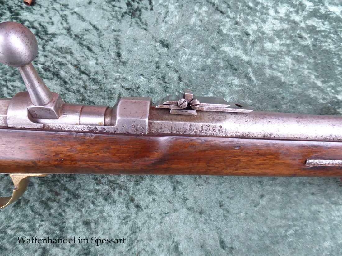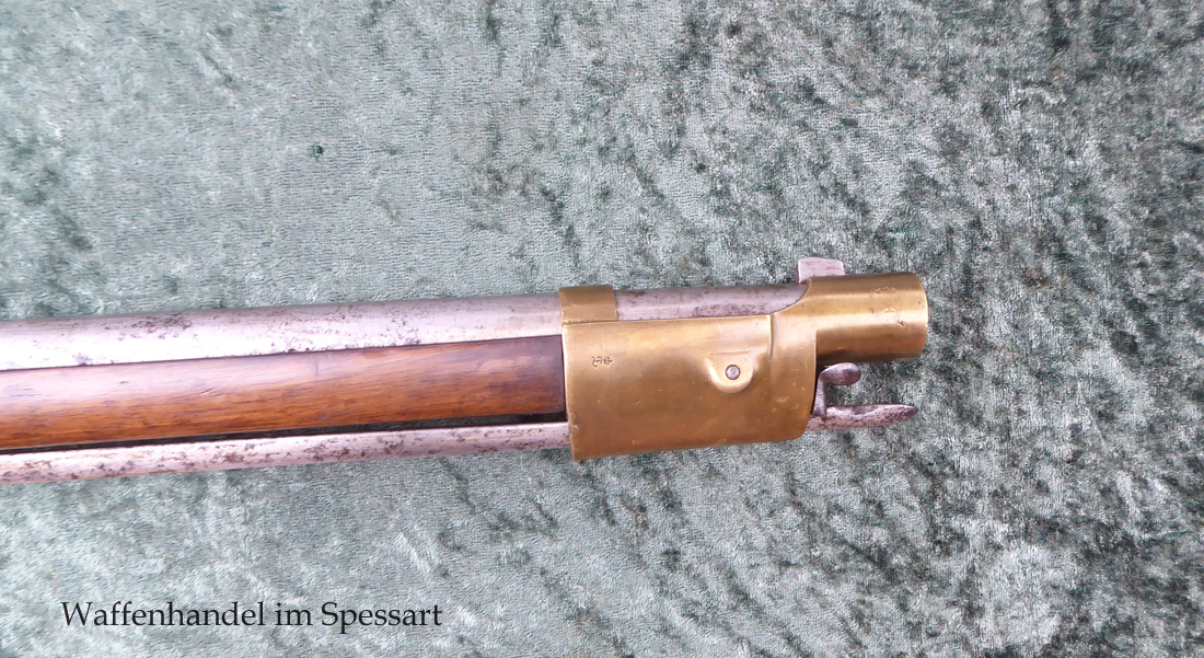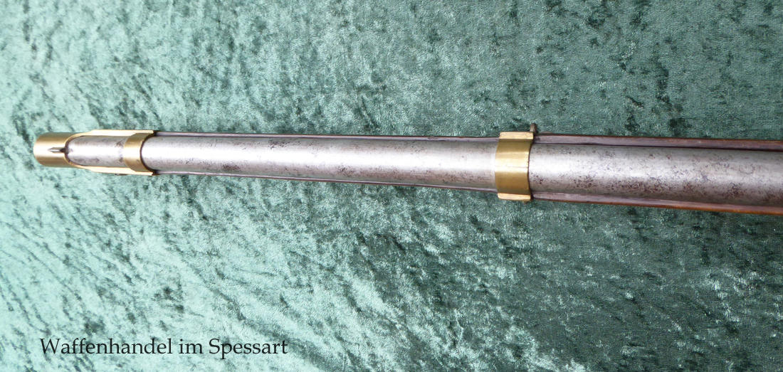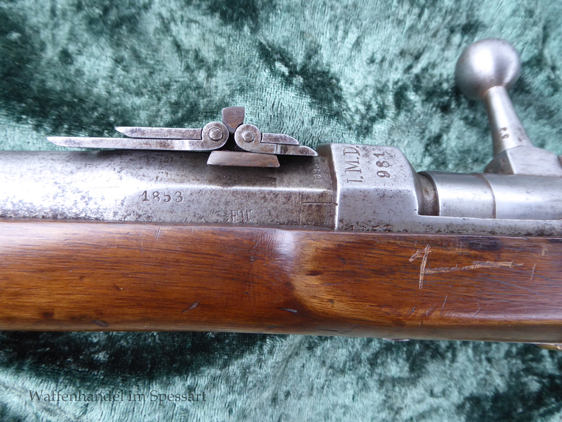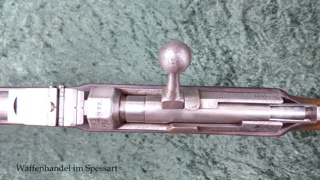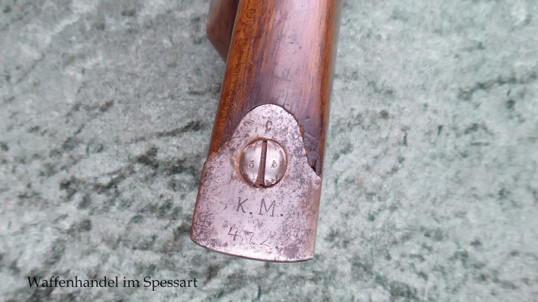 Hersteller Gewehrfabrik Spandau. Kal.15,4, Ser.Nr. 1853. Nummerngleich in allen Teilen. Baujahr 1857, Ausgabe 1859. Scharfkantiges gutes fast blankes Laufinnere (geringe Anhaftungen im Mündungsberich). Die Stahlteile haben sehr viel Patina, geringe Fugroststellen. Das Visier hat eine Standkimme und vier Klappen. Links am Hülsenkopf Truppenstempel I.M.D. 981 (1.Matrosendivision Waffe 981. Standort Kiel). Auf dem Hülsenkopf oben 472 und auf der Kolbenplatte KM 472. Gute und noch deutliche Abnahmestempel im Schaft inkl. KM für Königliche Marine. Das Herstellerzeichen Adler über Spandau ist noch sehr "dünn" erhalten (abgegriffen). Strammes gut schließendes Schloß.