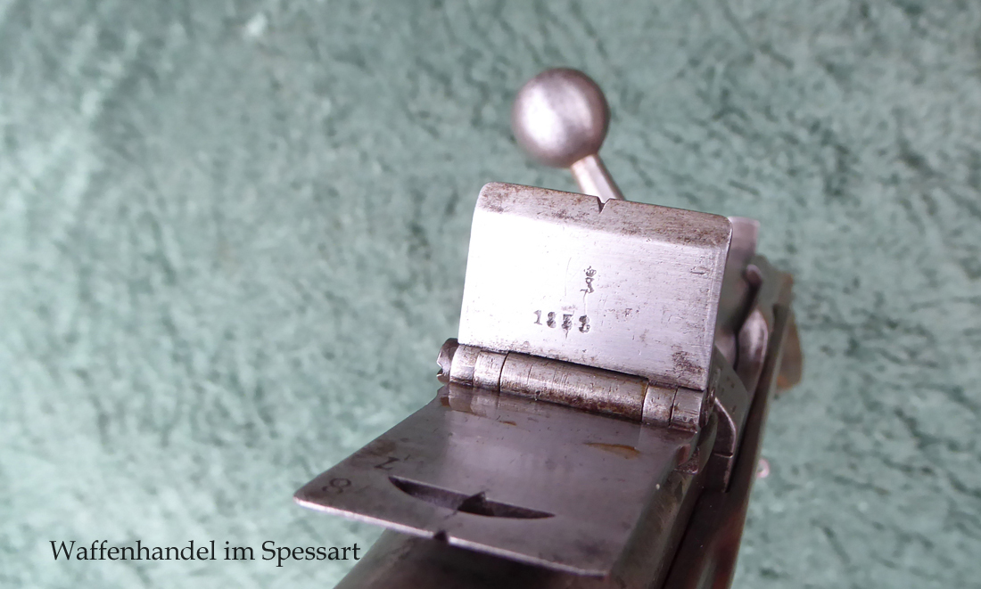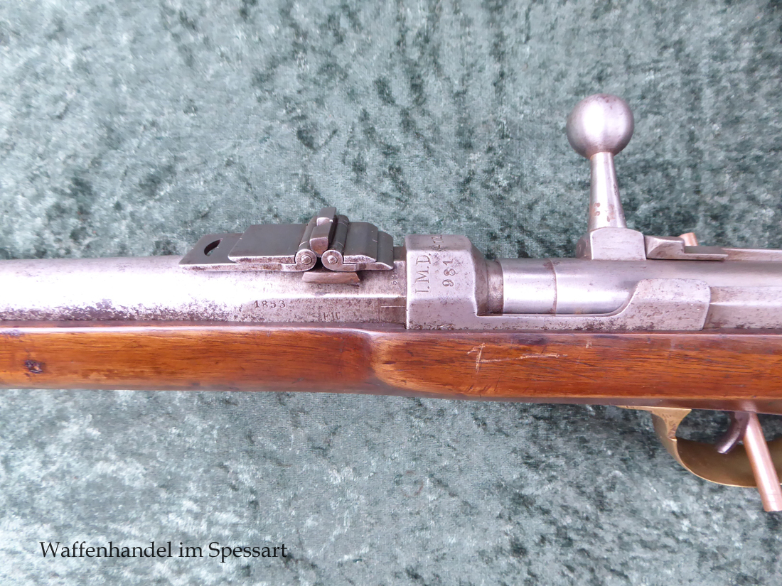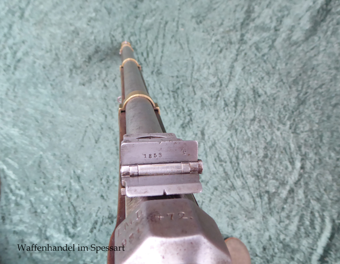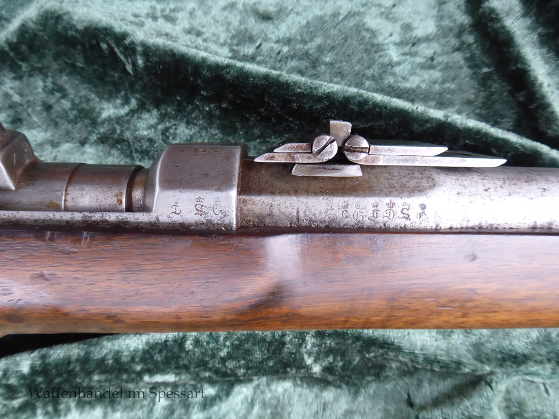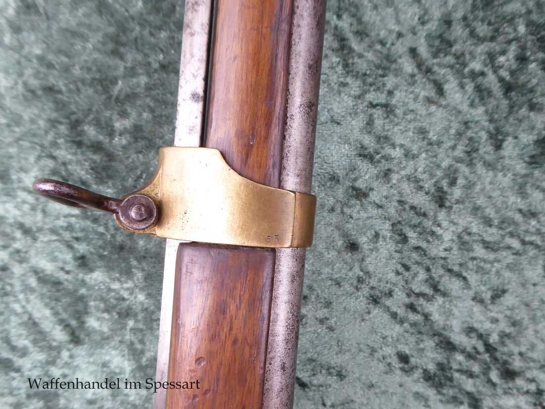 Hersteller Gewehrfabrik Spandau. Kal.15,4, Ser.Nr. 1853. Nummerngleich in allen Teilen. Baujahr 1857, Ausgabe 1859. Scharfkantiges gutes fast blankes Laufinnere (geringe Anhaftungen im Mündungsberich). Die Stahlteile haben sehr viel Patina, geringe Fugroststellen. Das Visier hat eine Standkimme und vier Klappen. Links am Hülsenkopf Truppenstempel I.M.D. 981 (1.Matrosendivision Waffe 981. Standort Kiel). Auf dem Hülsenkopf oben 472 und auf der Kolbenplatte KM 472. Gute und noch deutliche Abnahmestempel im Schaft inkl. KM für Königliche Marine. Das Herstellerzeichen Adler über Spandau ist noch sehr "dünn" erhalten (abgegriffen). Strammes gut schließendes Schloß.