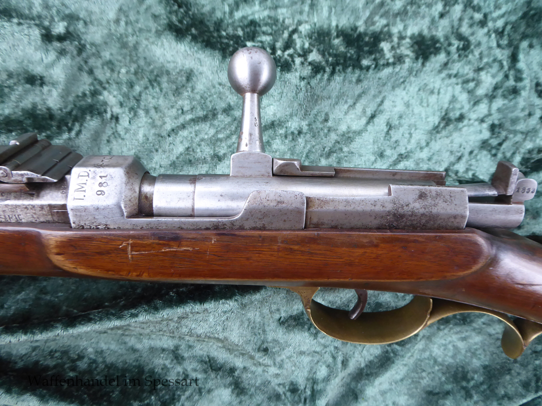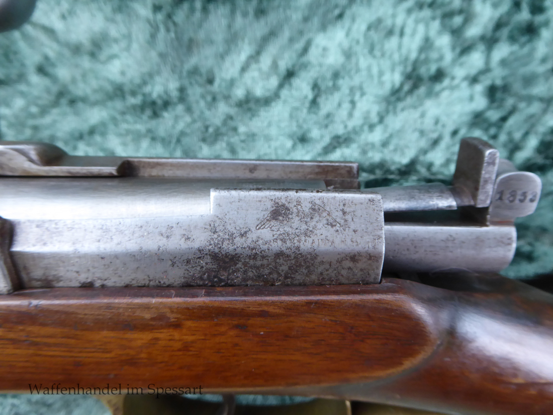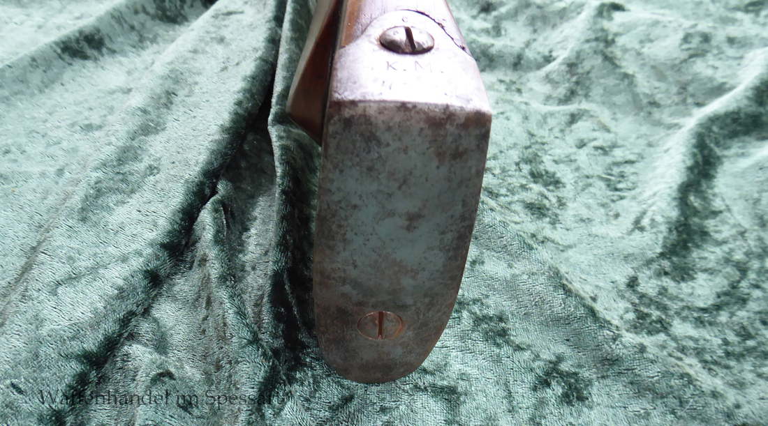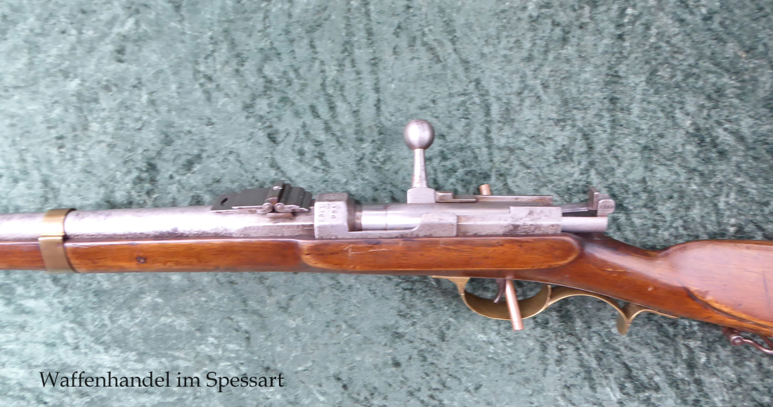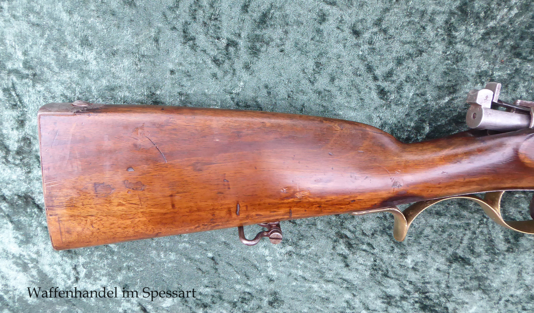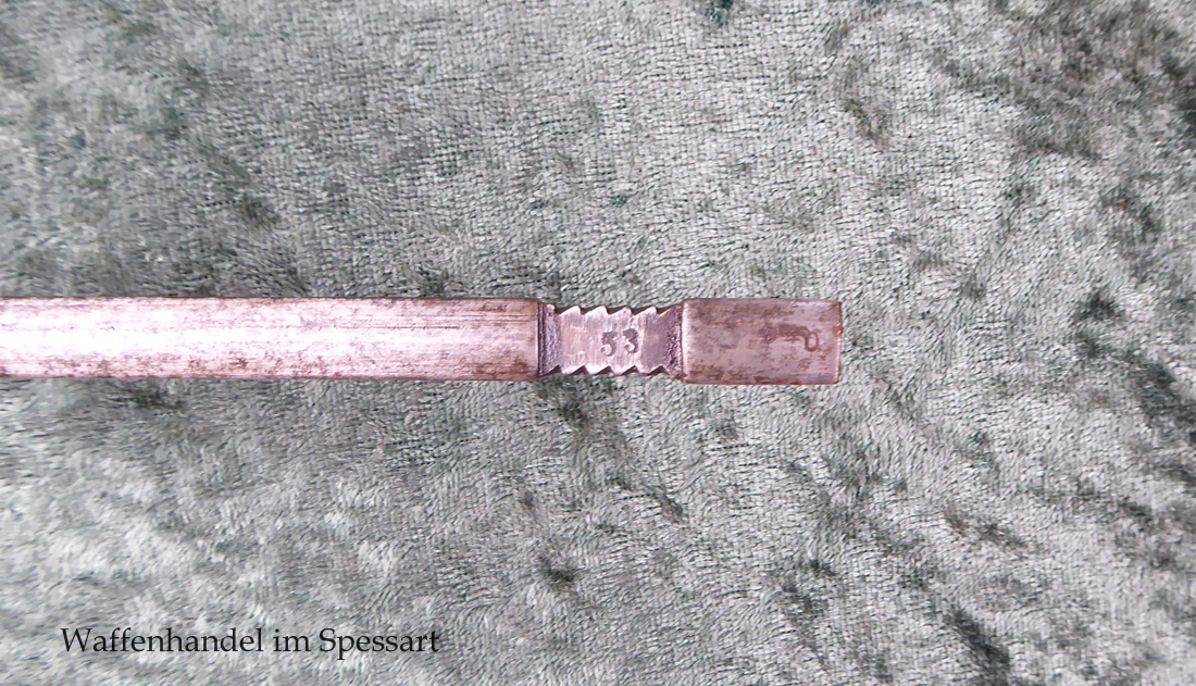 Hersteller Gewehrfabrik Spandau. Kal.15,4, Ser.Nr. 1853. Nummerngleich in allen Teilen. Baujahr 1857, Ausgabe 1859. Scharfkantiges gutes fast blankes Laufinnere (geringe Anhaftungen im Mündungsberich). Die Stahlteile haben sehr viel Patina, geringe Fugroststellen. Das Visier hat eine Standkimme und vier Klappen. Links am Hülsenkopf Truppenstempel I.M.D. 981 (1.Matrosendivision Waffe 981. Standort Kiel). Auf dem Hülsenkopf oben 472 und auf der Kolbenplatte KM 472. Gute und noch deutliche Abnahmestempel im Schaft inkl. KM für Königliche Marine. Das Herstellerzeichen Adler über Spandau ist noch sehr "dünn" erhalten (abgegriffen). Strammes gut schließendes Schloß.