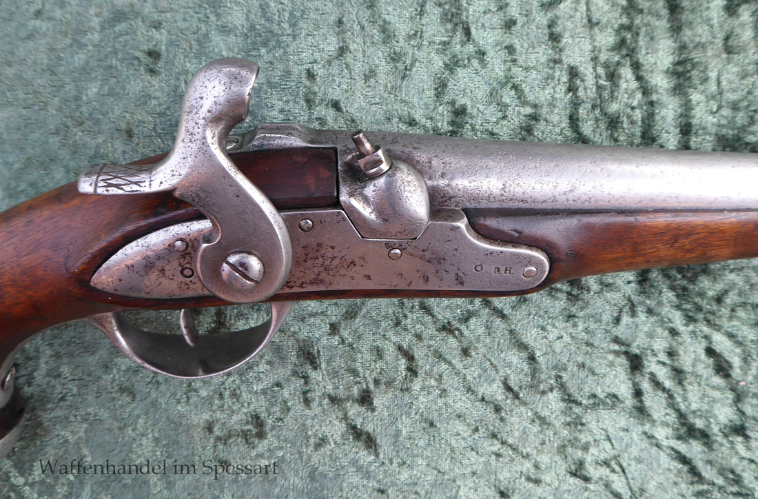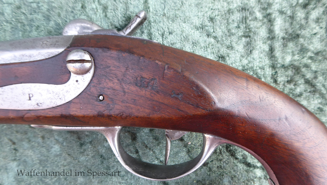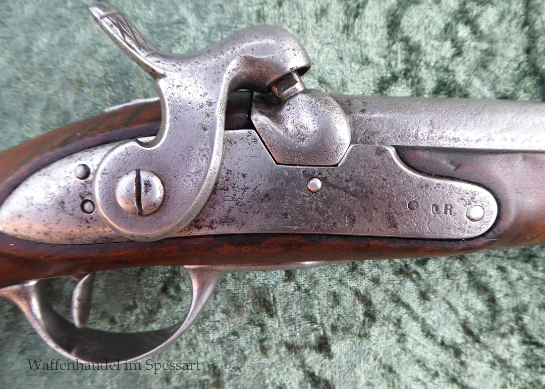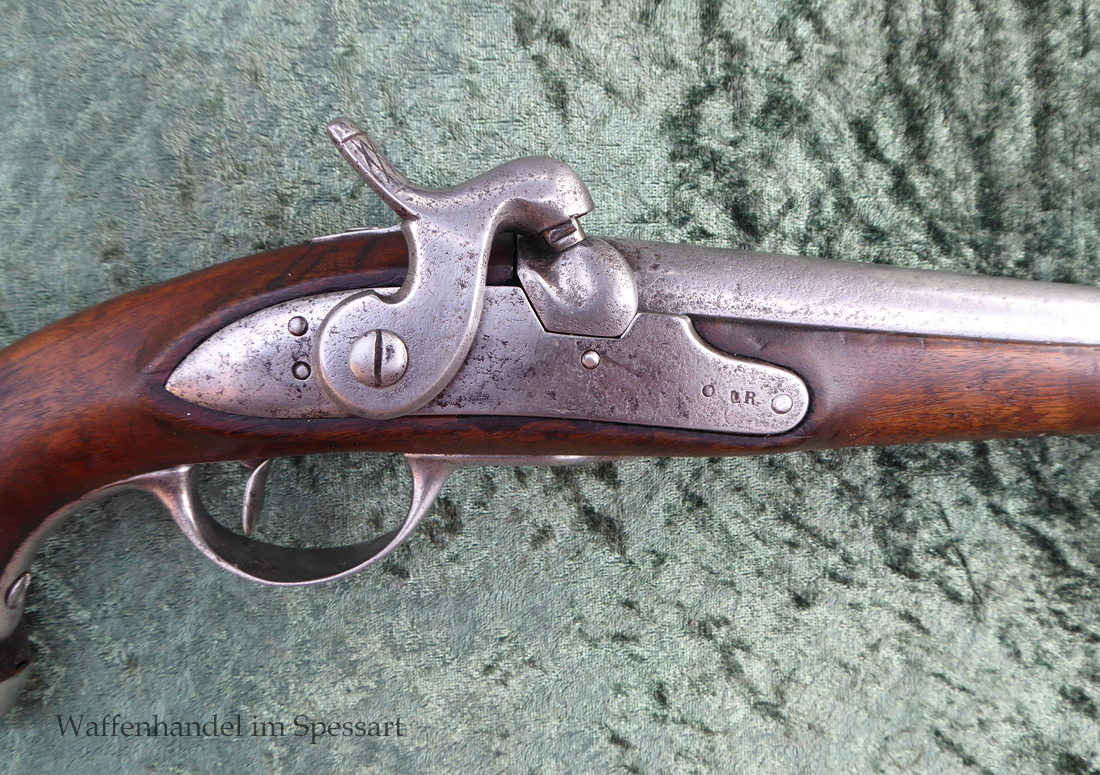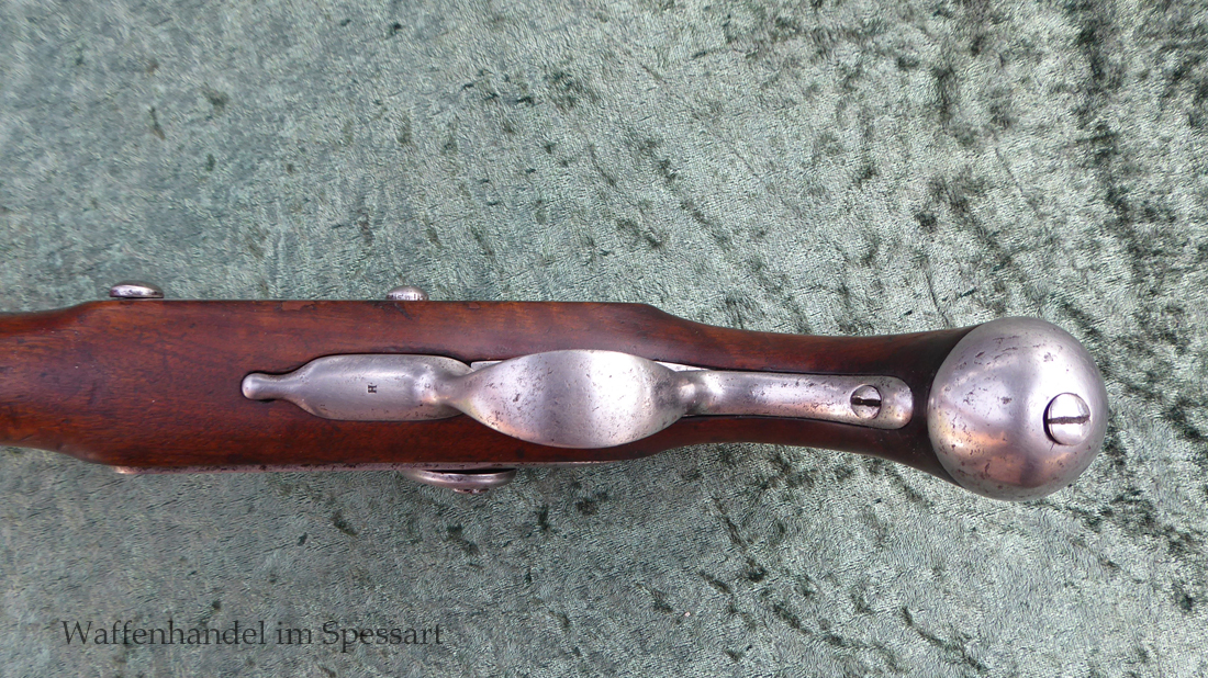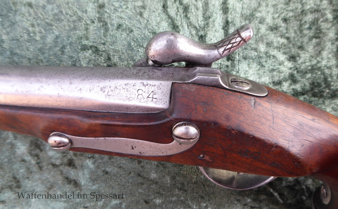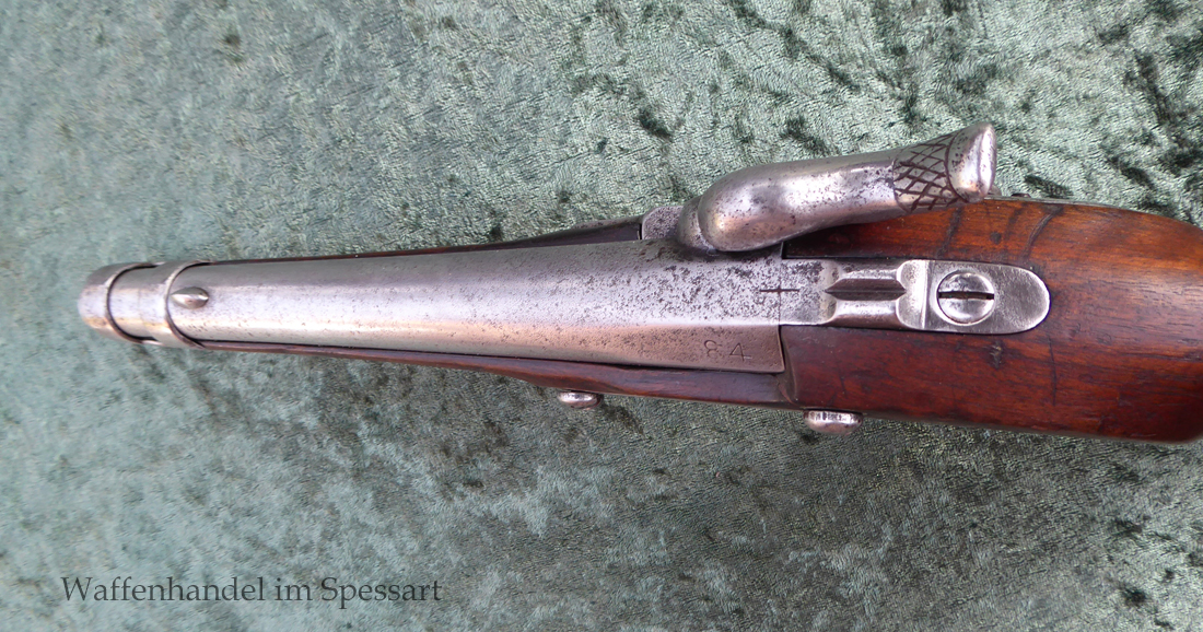 Ser.Nr. 84. Die auf der Laufwurzel und auf dem Schaft links geschlagen wurde. Strammes gut funktionierendes Perkussionsschloß. Unberührter orig. Zustand.