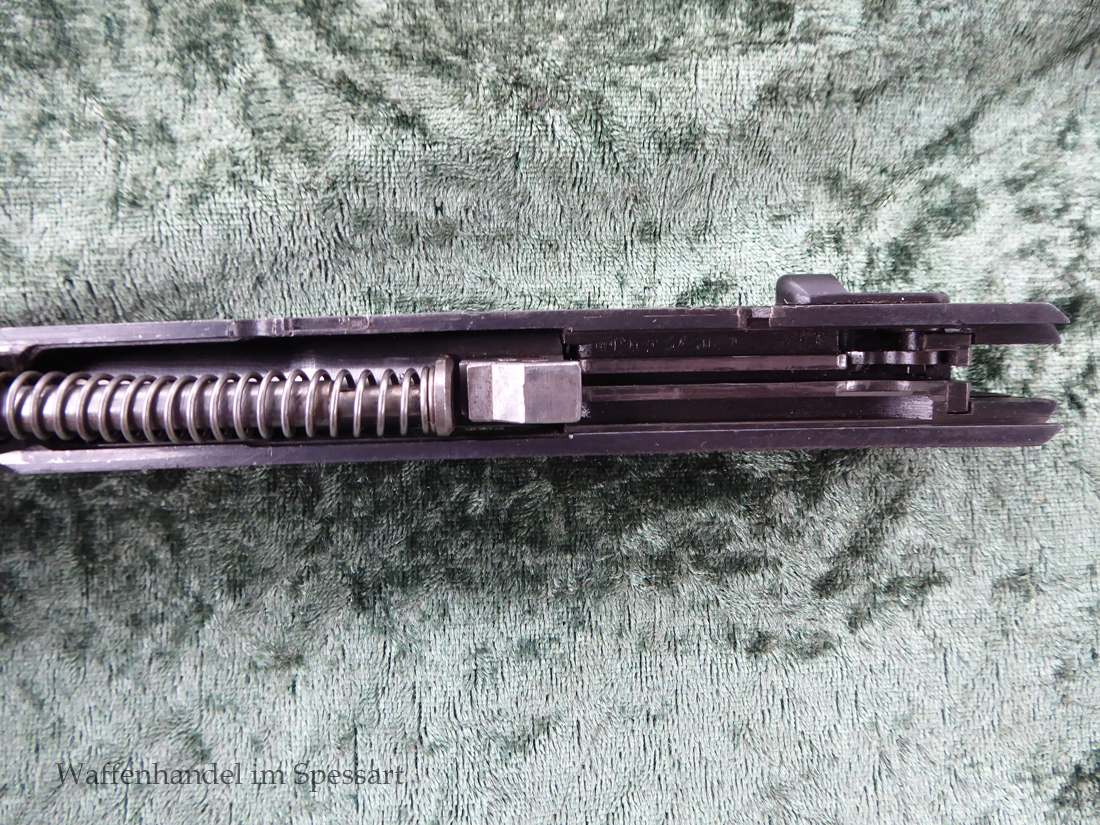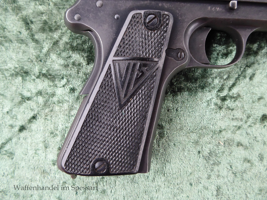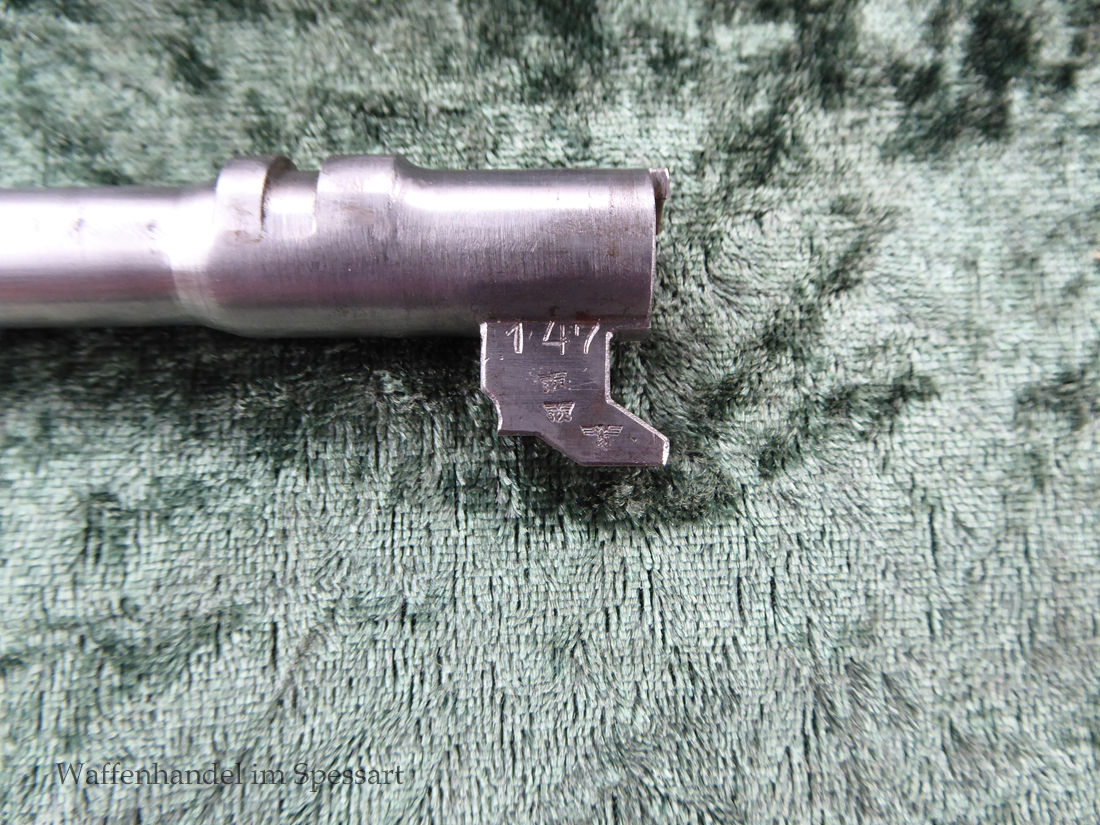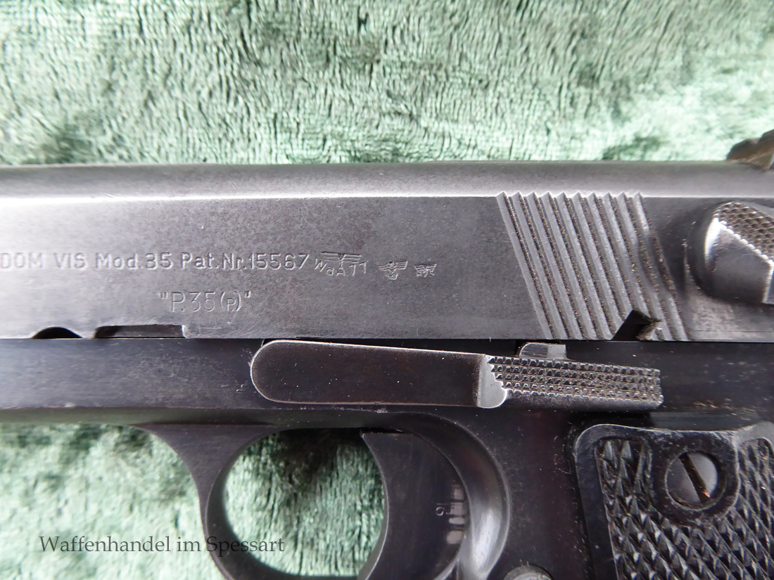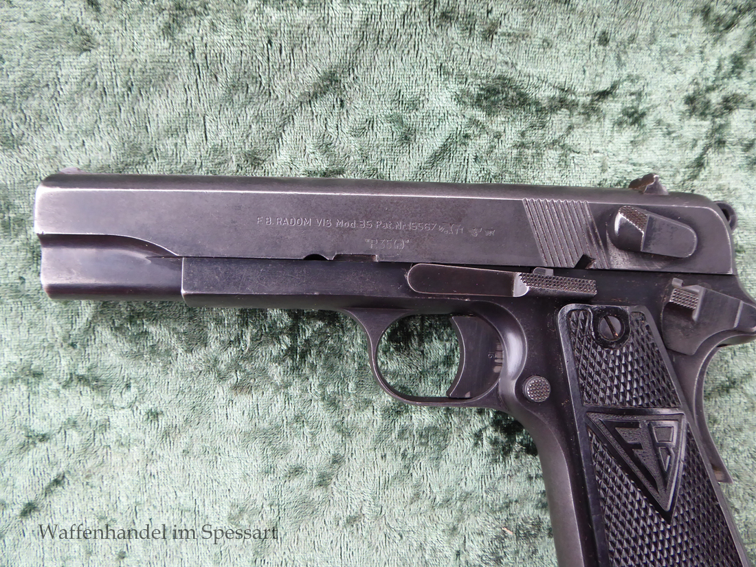 Kal.9mmLuger, Ser.Nr. 147. Baujahr 1939. Erste Serie die unter der deutschen Besetzung gefertigt wurde. Das Griffstück noch aus der polnischen Fertigung, die bei der Besetzung der Radom Werke vorgefunden wurden. Der Verschluß und Lauf wurde unter der deutschen Besetzung gefetigt und die Pistole zusammengebaut und ausgegeben. Deshalb das Griffstück ohne Waa und der Verschluß mit Waa 77. Nummerngleich, scharfkantiges fast blankes Laufinnere. Gute orig. Brünierung. Das Magazin in der Pistole ohne Waa wie es zu dieser Pistole sein muß und ein zweites mit Waa 189. Leichte Gebrauchspuren. Griffstück mit Nut für den Anschlagkasten.