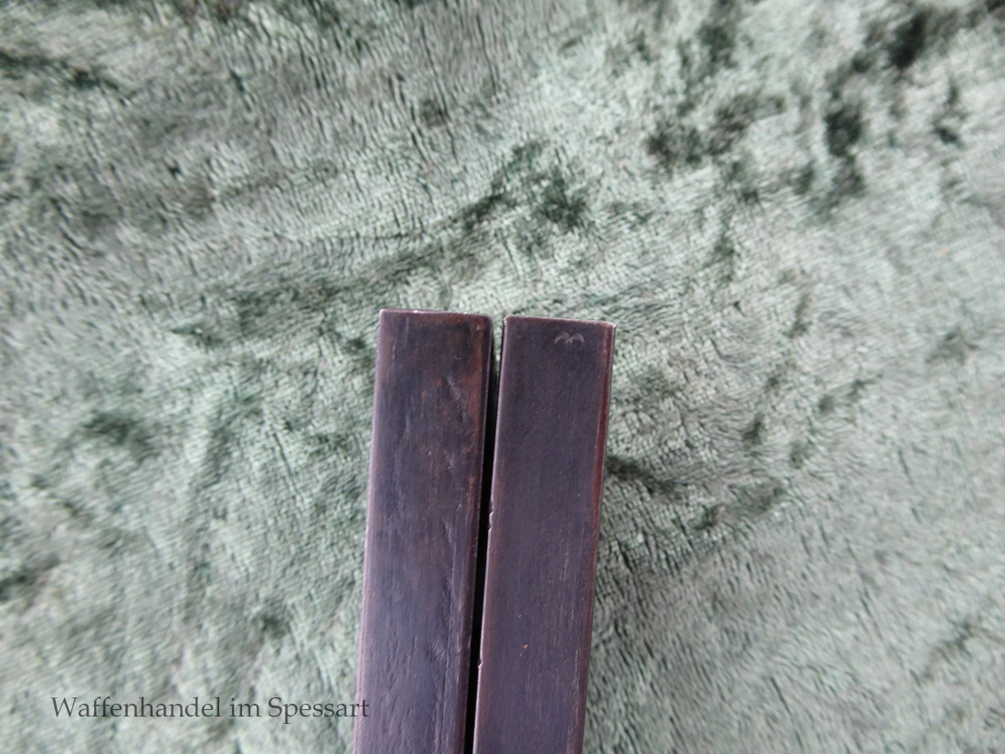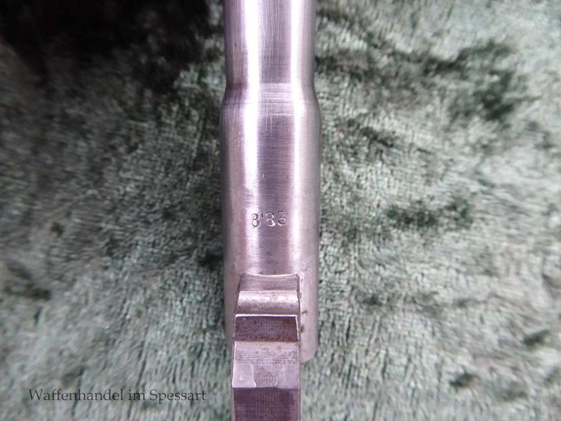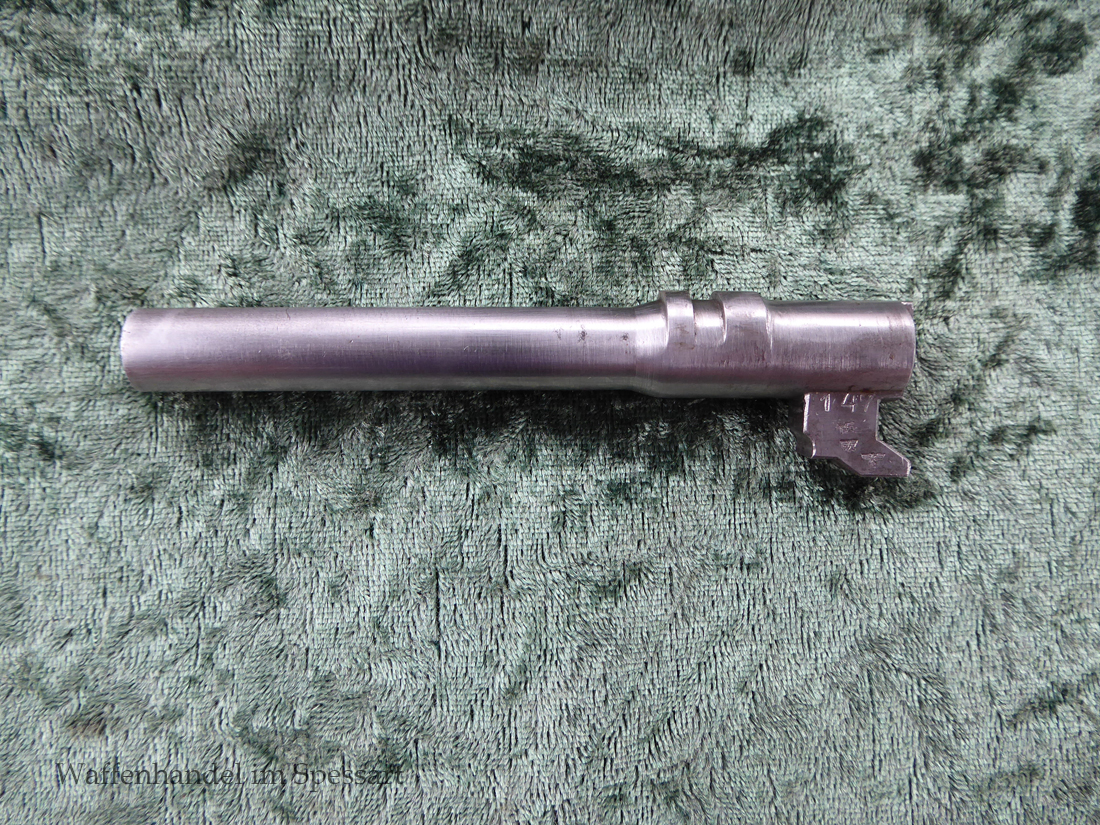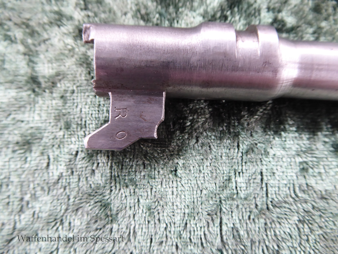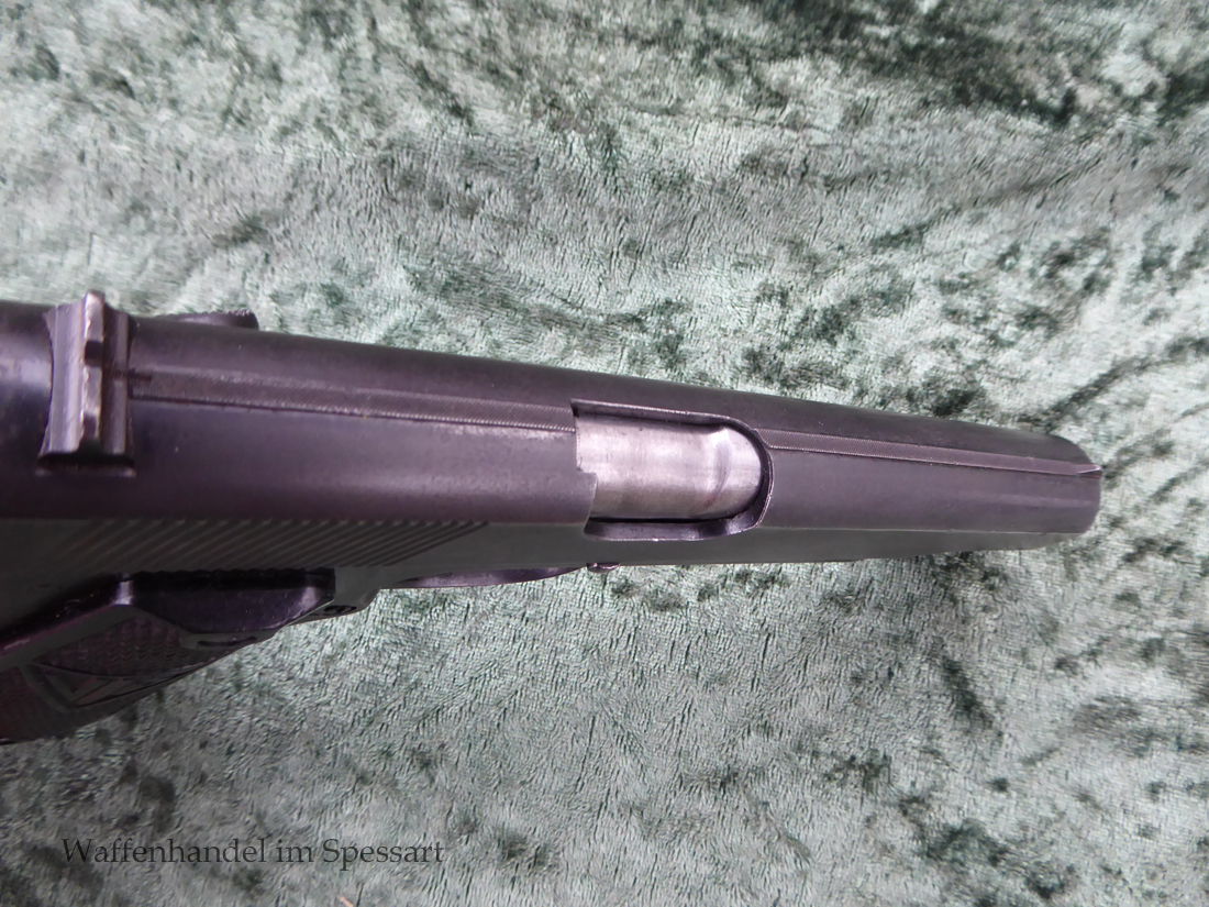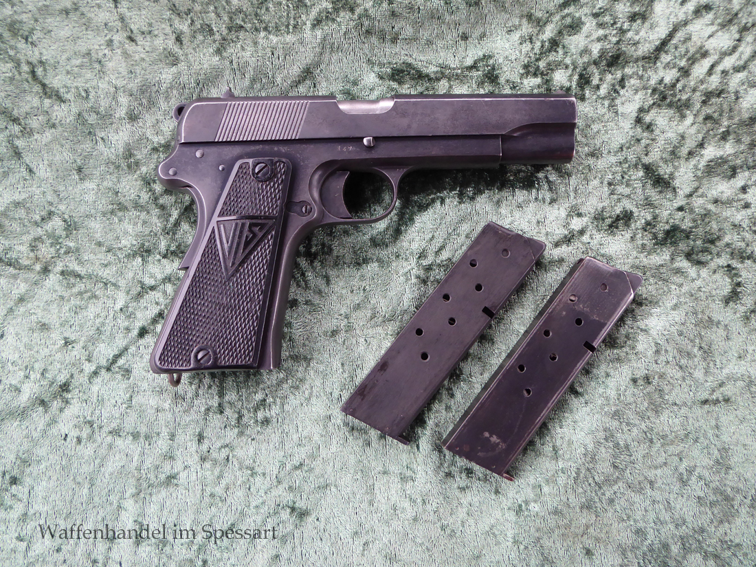 Kal.9mmLuger, Ser.Nr. 147. Baujahr 1939. Erste Serie die unter der deutschen Besetzung gefertigt wurde. Das Griffstück noch aus der polnischen Fertigung, die bei der Besetzung der Radom Werke vorgefunden wurden. Der Verschluß und Lauf wurde unter der deutschen Besetzung gefetigt und die Pistole zusammengebaut und ausgegeben. Deshalb das Griffstück ohne Waa und der Verschluß mit Waa 77. Nummerngleich, scharfkantiges fast blankes Laufinnere. Gute orig. Brünierung. Das Magazin in der Pistole ohne Waa wie es zu dieser Pistole sein muß und ein zweites mit Waa 189. Leichte Gebrauchspuren. Griffstück mit Nut für den Anschlagkasten.