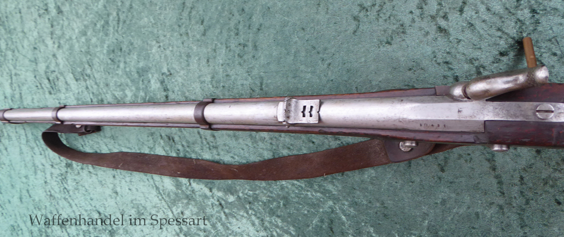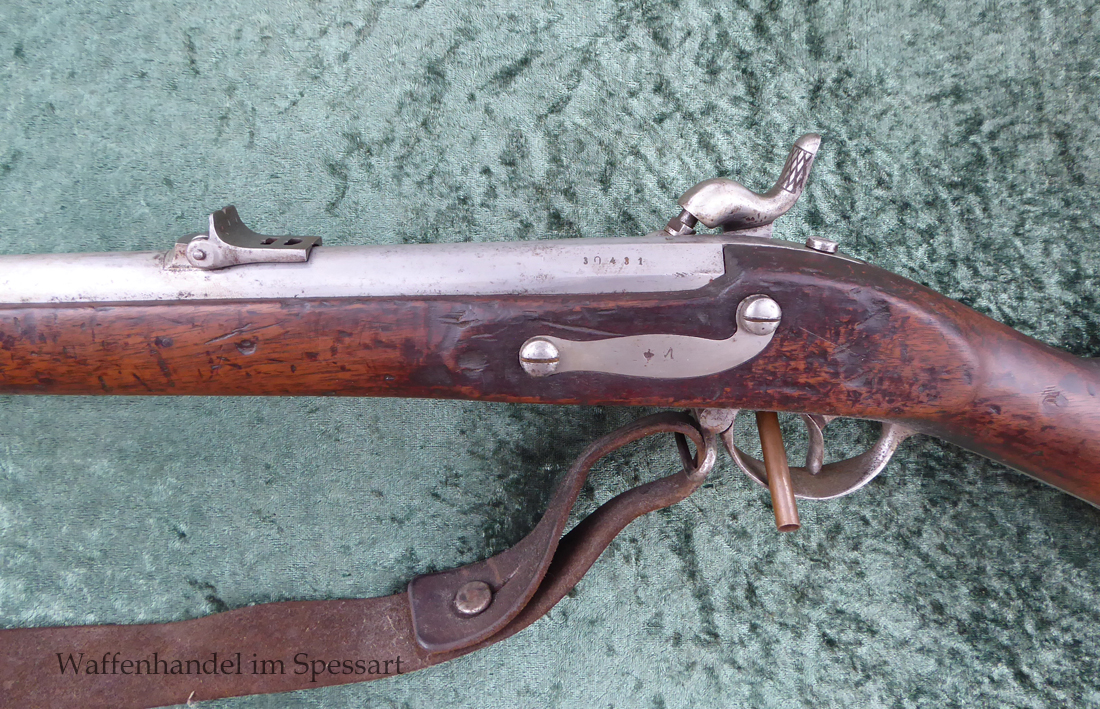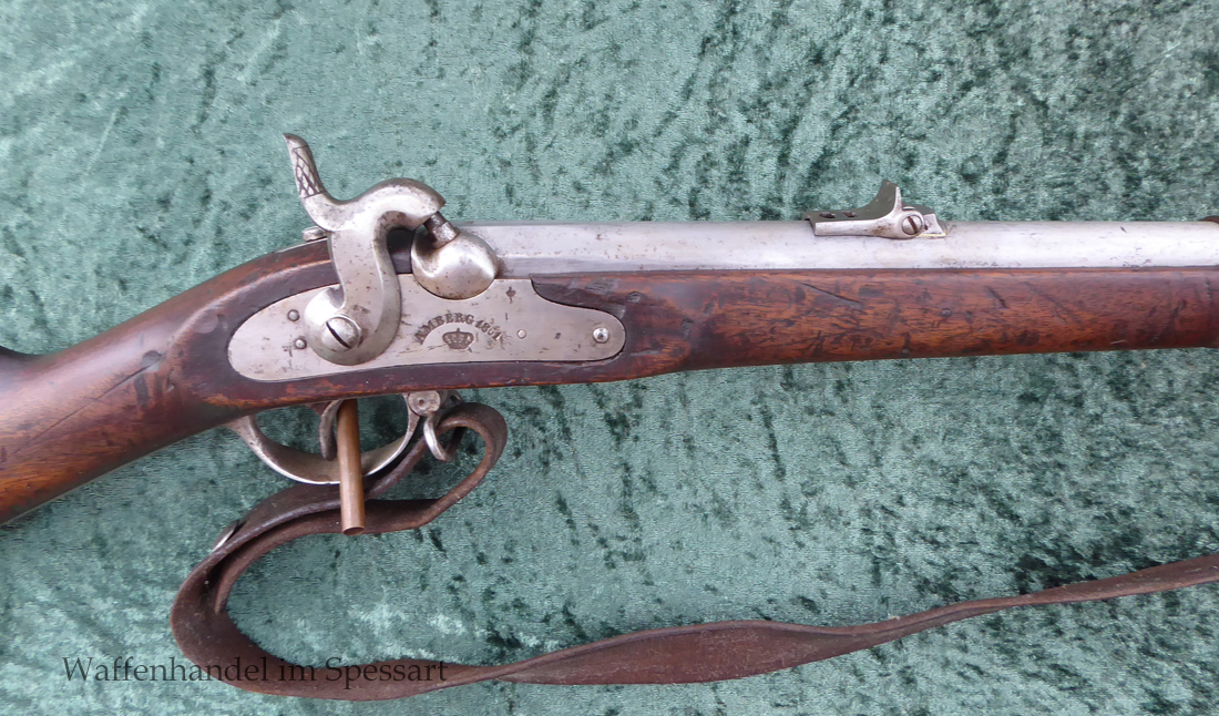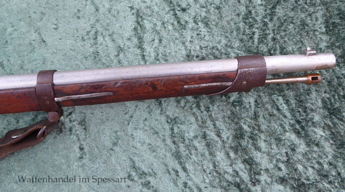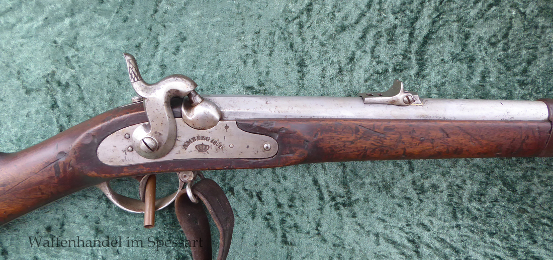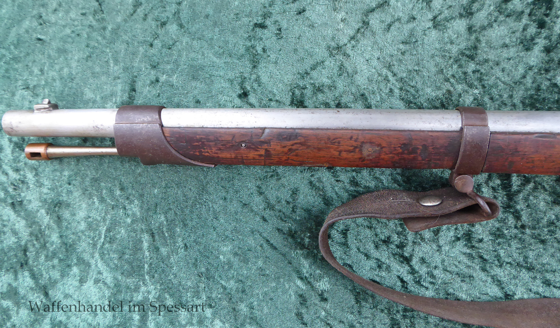 Hersteller Gewehrfabrik Amberg im Jahre 1861. Kal.13,9mm. Ser.Nr. 10431. Das vierfach gezogene Laufinnere hat sehr gute scharfkantige Felder und Züge. Die Schloßplatte ist tief und deutlich signiert. Schlossblech gemarkt "AMBERG / Krone / 1861". Das Schloß arbeute eiwandfrei.Die Bänder und der Oberring waren gebläut und sind in Patina, event. in geringen Flugrost übergegangen. Der Lauf, Abzugsbügel und Kolbenkappe sind blank mit geringer Patina. Mit dem darangewesenem originaler Riemen ohne Risse und Brüche. Durch sorgfältige Reinigung sicher zu verbessern.