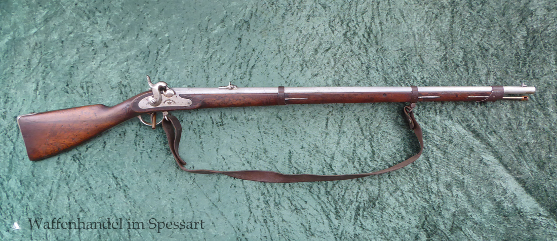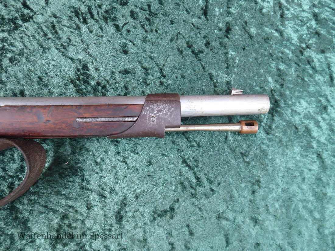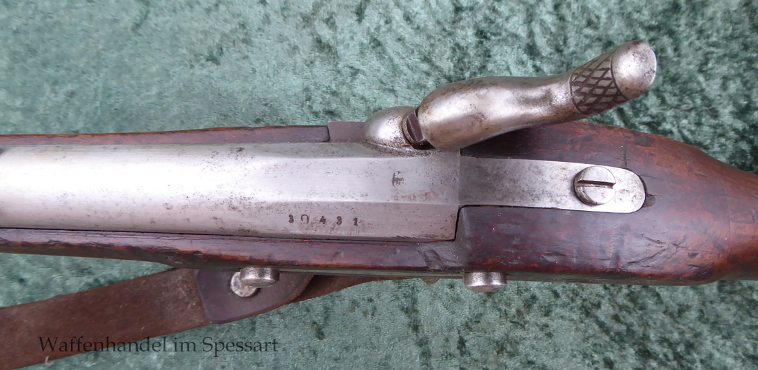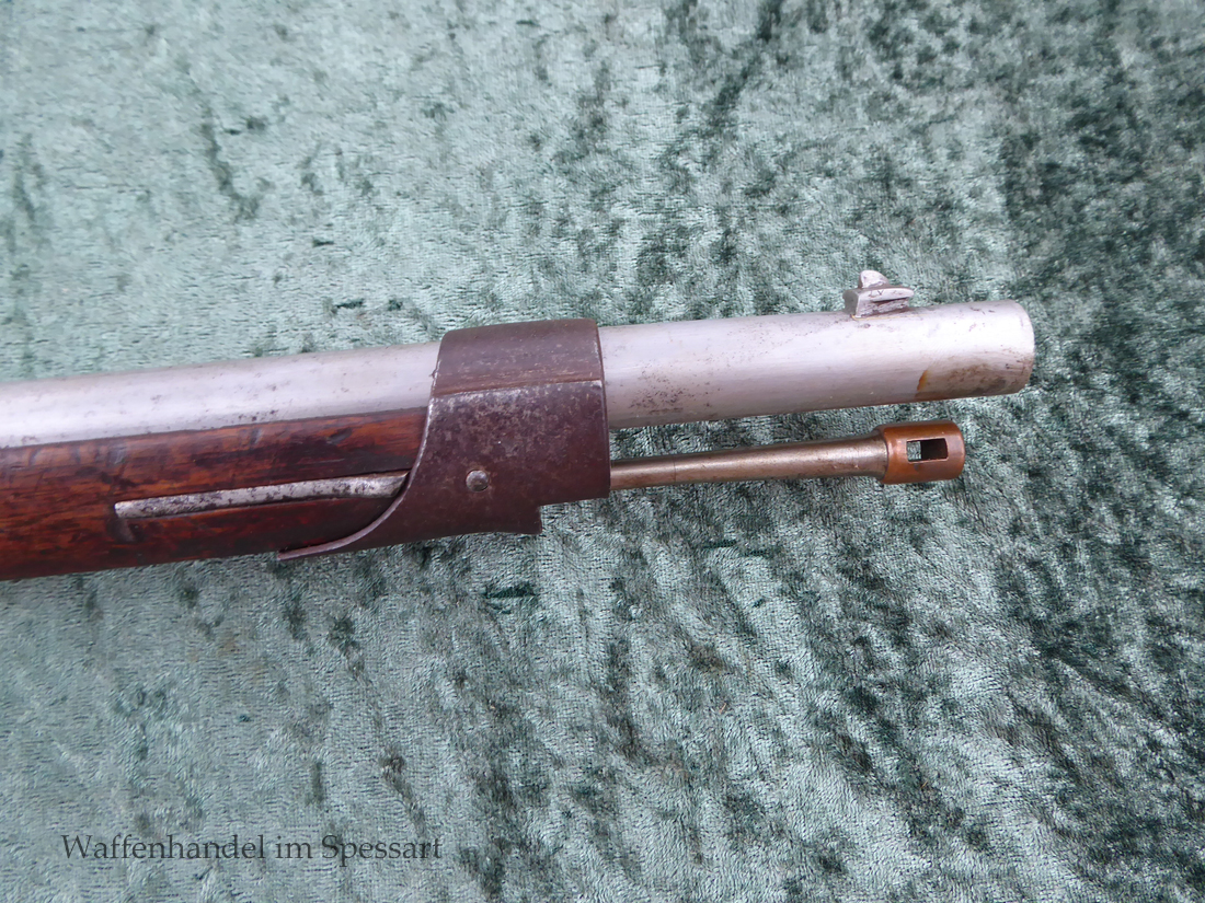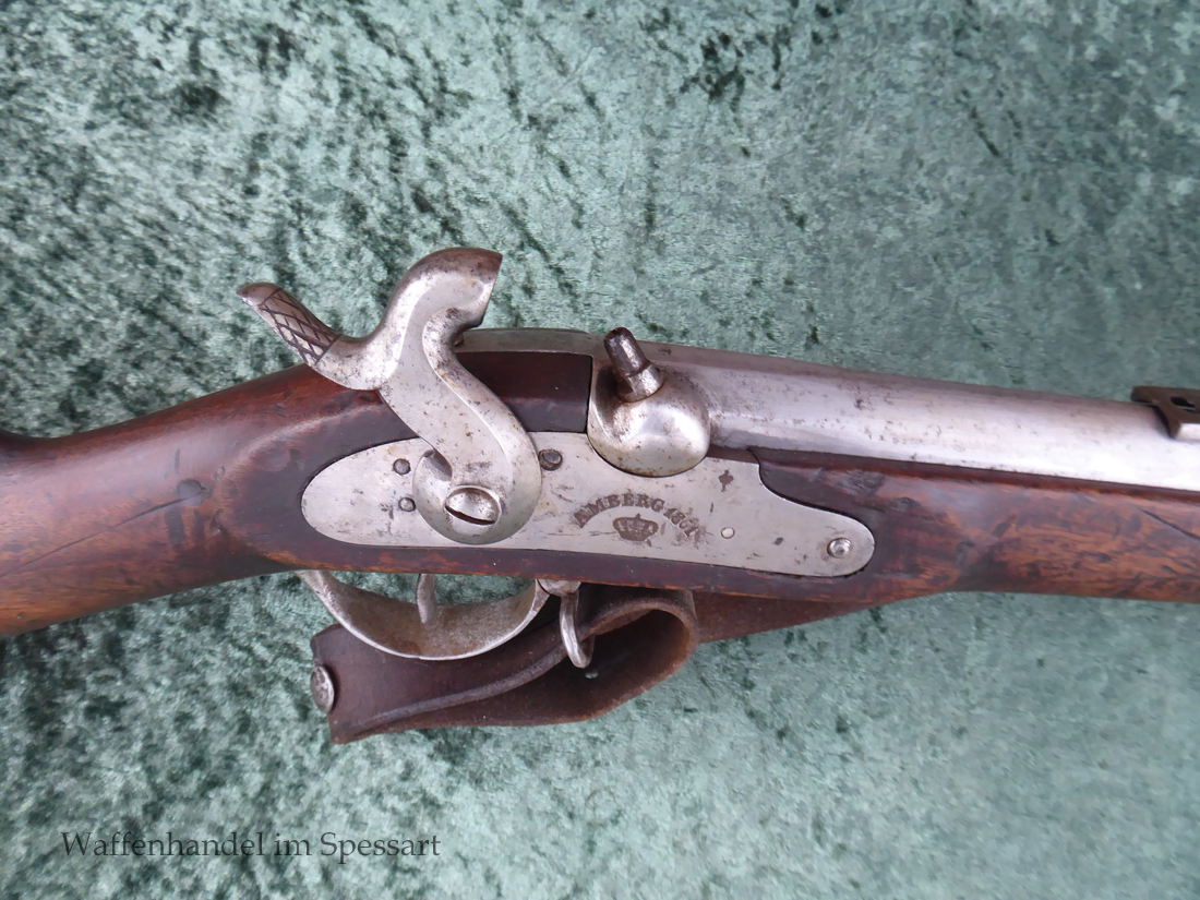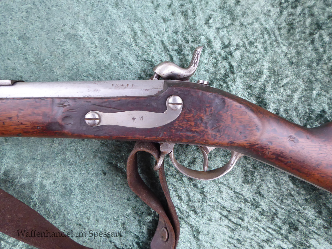 Hersteller Gewehrfabrik Amberg im Jahre 1861. Kal.13,9mm. Ser.Nr. 10431. Das vierfach gezogene Laufinnere hat sehr gute scharfkantige Felder und Züge. Die Schloßplatte ist tief und deutlich signiert. Schlossblech gemarkt "AMBERG / Krone / 1861". Das Schloß arbeute eiwandfrei.Die Bänder und der Oberring waren gebläut und sind in Patina, event. in geringen Flugrost übergegangen. Der Lauf, Abzugsbügel und Kolbenkappe sind blank mit geringer Patina. Mit dem darangewesenem originaler Riemen ohne Risse und Brüche. Durch sorgfältige Reinigung sicher zu verbessern.