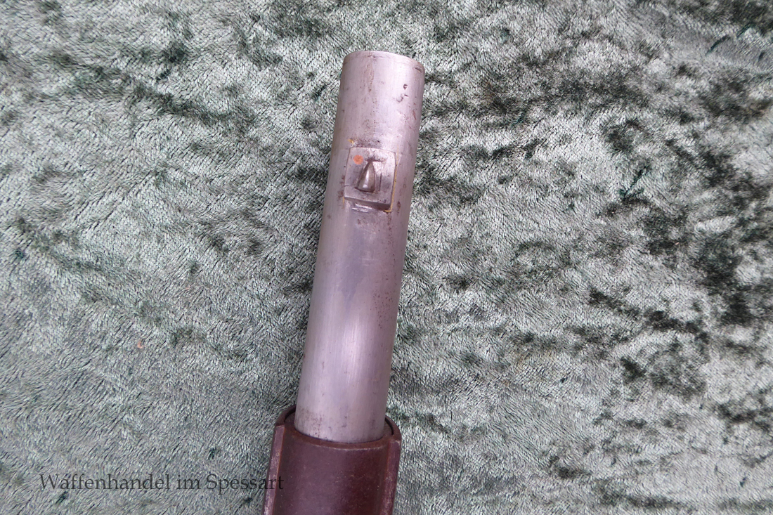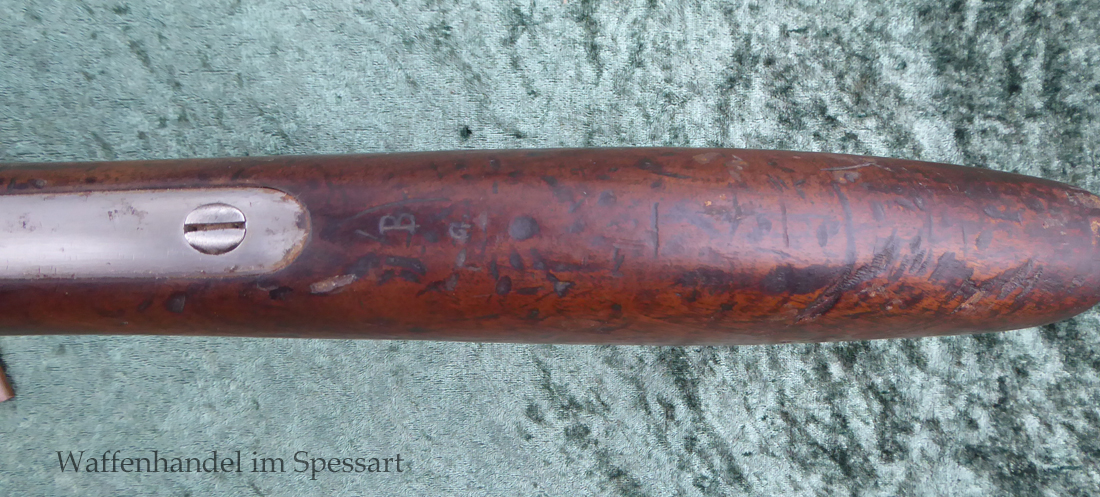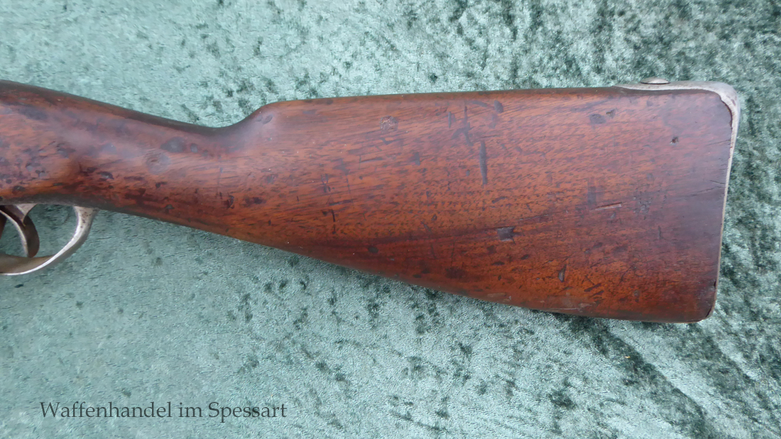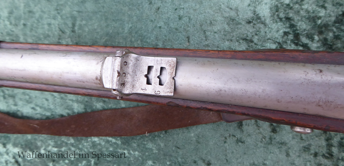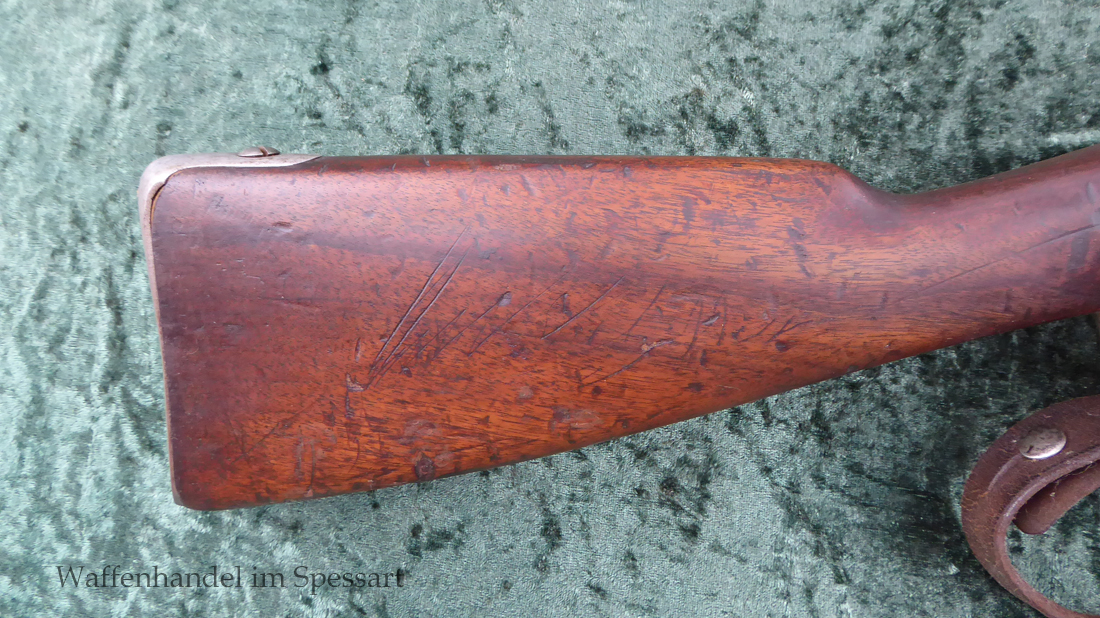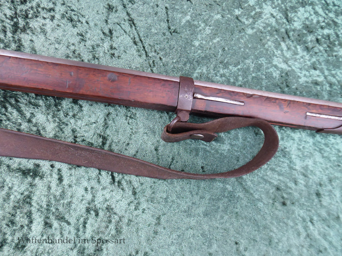 Hersteller Gewehrfabrik Amberg im Jahre 1861. Kal.13,9mm. Ser.Nr. 10431. Das vierfach gezogene Laufinnere hat sehr gute scharfkantige Felder und Züge. Die Schloßplatte ist tief und deutlich signiert. Schlossblech gemarkt "AMBERG / Krone / 1861". Das Schloß arbeute eiwandfrei.Die Bänder und der Oberring waren gebläut und sind in Patina, event. in geringen Flugrost übergegangen. Der Lauf, Abzugsbügel und Kolbenkappe sind blank mit geringer Patina. Mit dem darangewesenem originaler Riemen ohne Risse und Brüche. Durch sorgfältige Reinigung sicher zu verbessern.