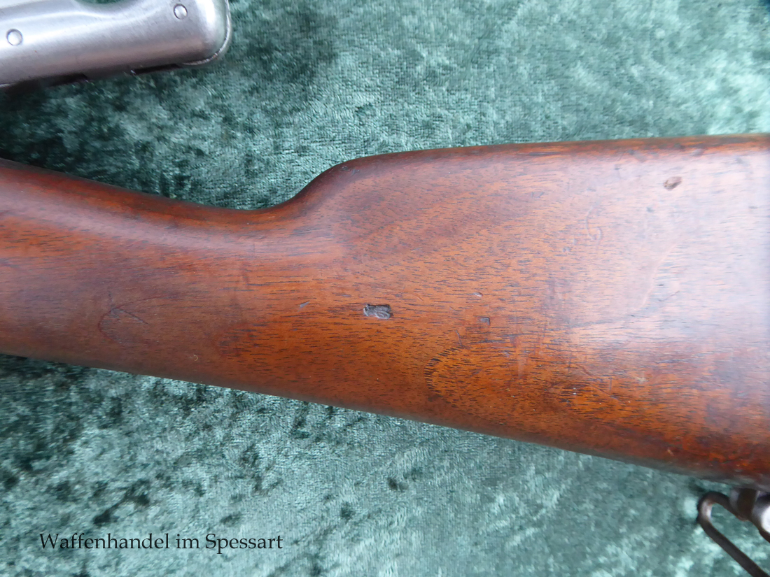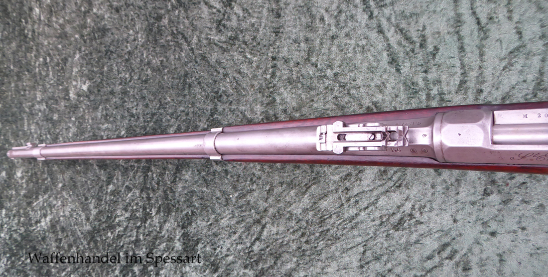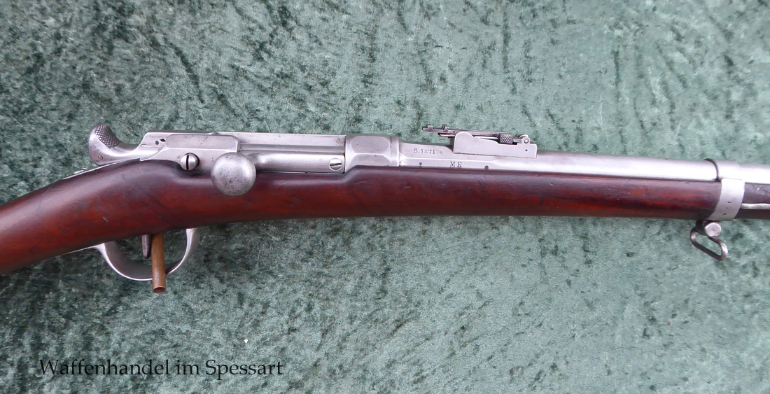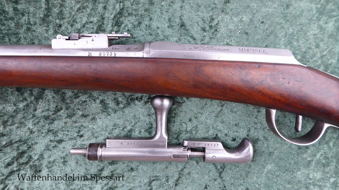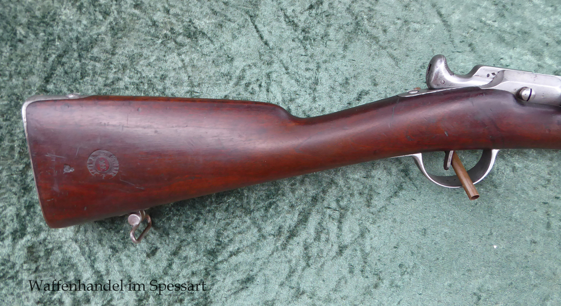 Hergestellt in St. Etienne 1871. Kal.11mm Chassepot Zündnadelpatrone. Baujahr 1871. Ser.Nr. M20739. Nummerngleich. Sogar der Entladestock hat die gleiche Nummer!. Das Laufinnere hat scharfkantige Felder und Züge und ist blank. Alle Stempel im Metall sind tief und deutlich. Der schöne Schaft mit sehr gut erhaltenen tiefen Abnahmen! Die Dichtung ist original. Die Nadel original. Mit dem langen Visier, das vornehmlich an Jägereinheiten ausgegeben wurde. Gut funktionierendes Schloß mit strammer Feder. Voll funktionsfähiges Gewehr. Keine verdrehten oder beschädigten Schrauben. Das Gewehr befindet sich in orig. Pflegezustand.