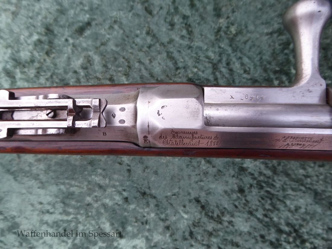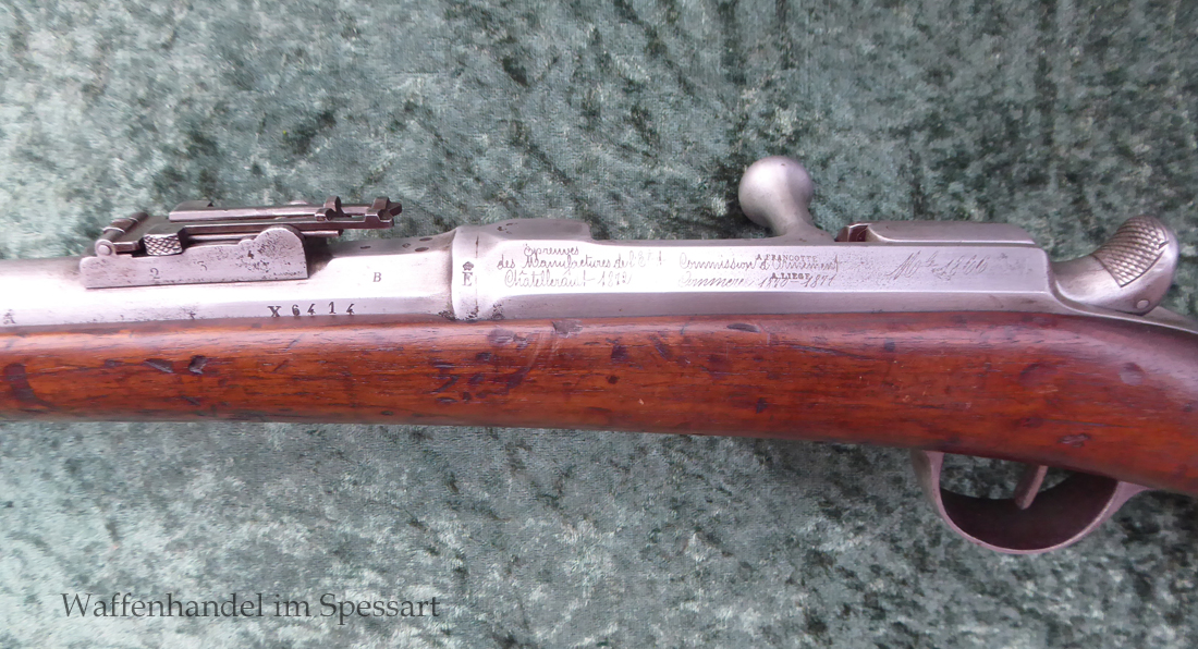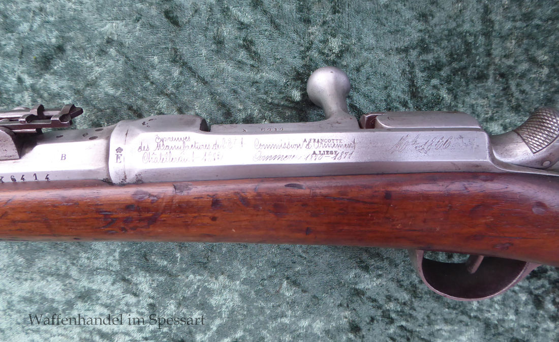 Hergestellt von A. Francotte in Liege. Die Signaturen auf der linkes Systemhülse: Es wurde in der Gewehrfabrik in Châtellerault 1872 überholt. (Epreuve de Etat Châtellerault 1872) Die Rüstungs Kommissions Beschrifftung die die ausländischen Waffen prüfte während des Konflikts von 1870-1871 (Commission d Armement Commerce 1870-1871).