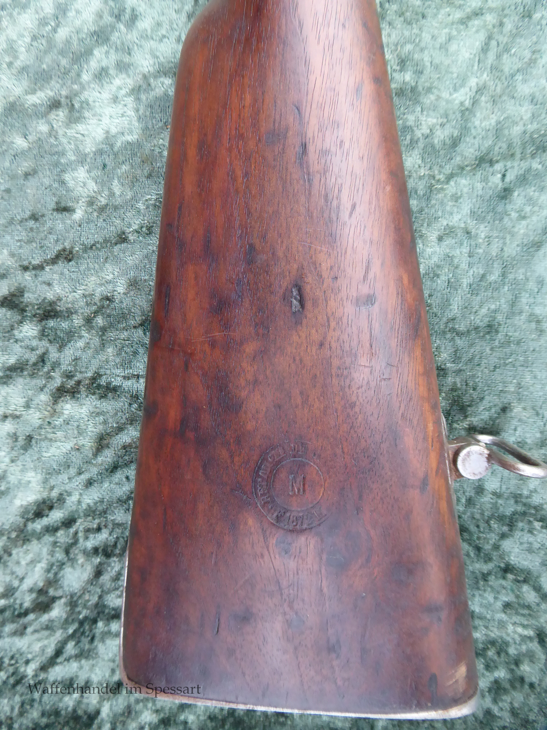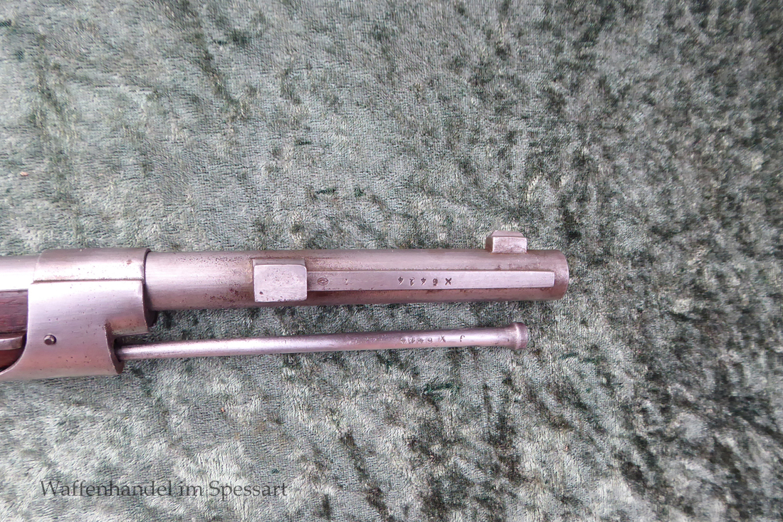 Kal.11mmChassepot Zündnadelpatrone. Ser.Nr. X6414. Nummerngleich. Sogar der Entladestock hat die gleiche Nummer!. Das Laufinnere ist scharfkantig und nur gering matt. Die Metallteile haben äußerlich nur geringe Patina. Alle Stempel im Metall sind tief und deutlich. Der schöne Schaft mit sehr gut erhaltenen tiefen Abnahmen! Dieser 1872 bei seiner Überholung gestempelt mit der gleichen Nummer. Er hat auch mehere Abnahmen im Holz. Auf der Kolbenkappe 4Z für das 4. Zuaven Regiment gestempelt. Es hat bei seiner Überholung 1872 ein langes Visier erhalten. Die Dichtung ist orignal. Die Dichtung ist neu. Gut funktionierendes Schloß mit strammer Feder. Voll funktionsfähiges Gewehr.