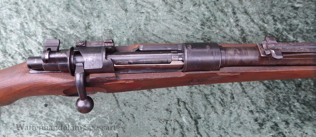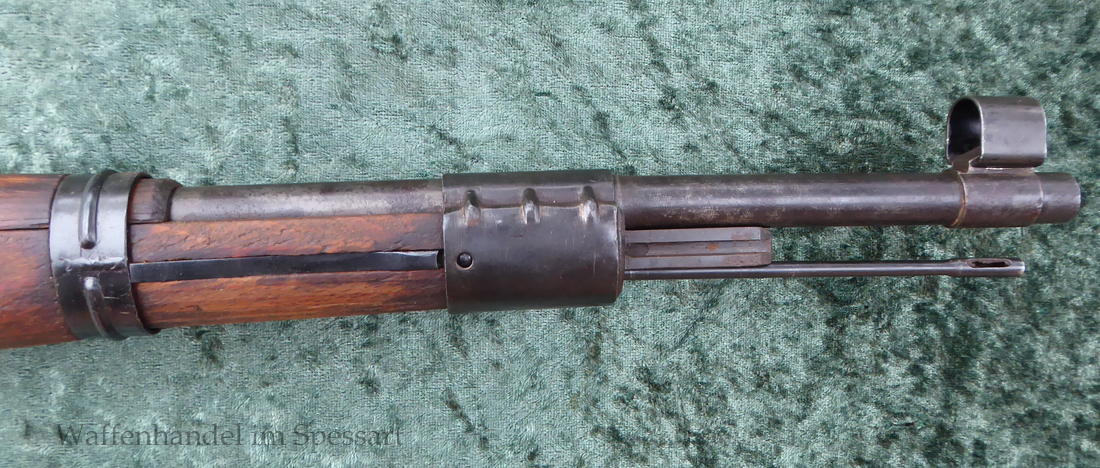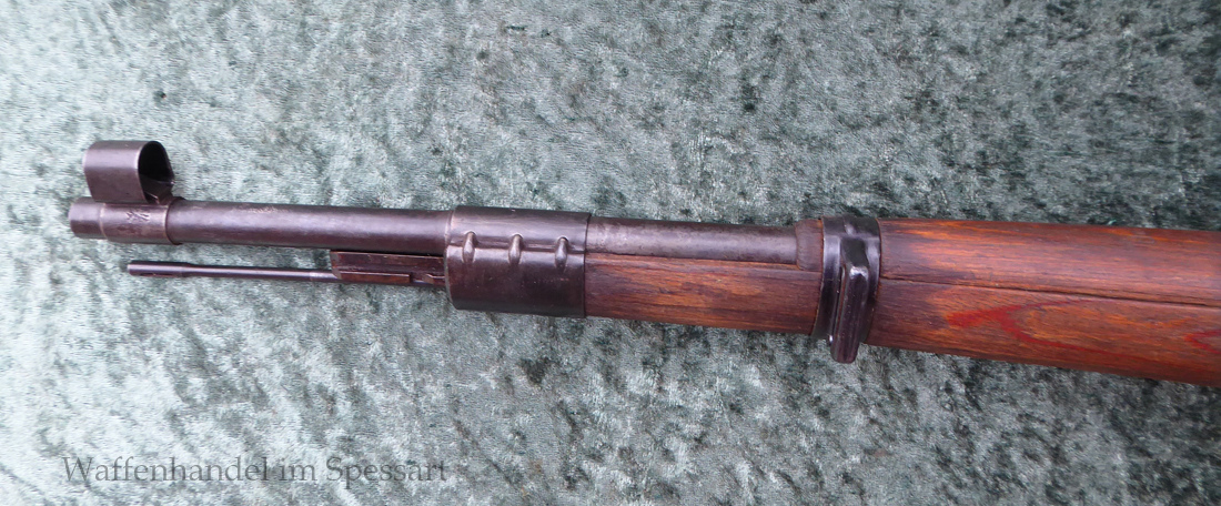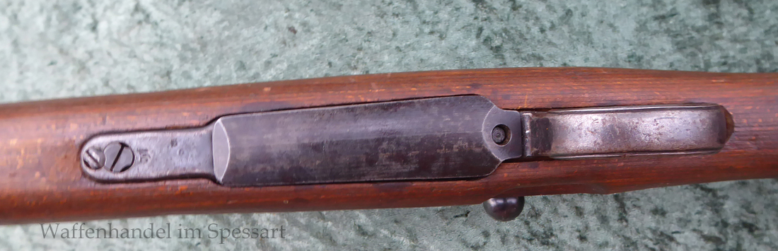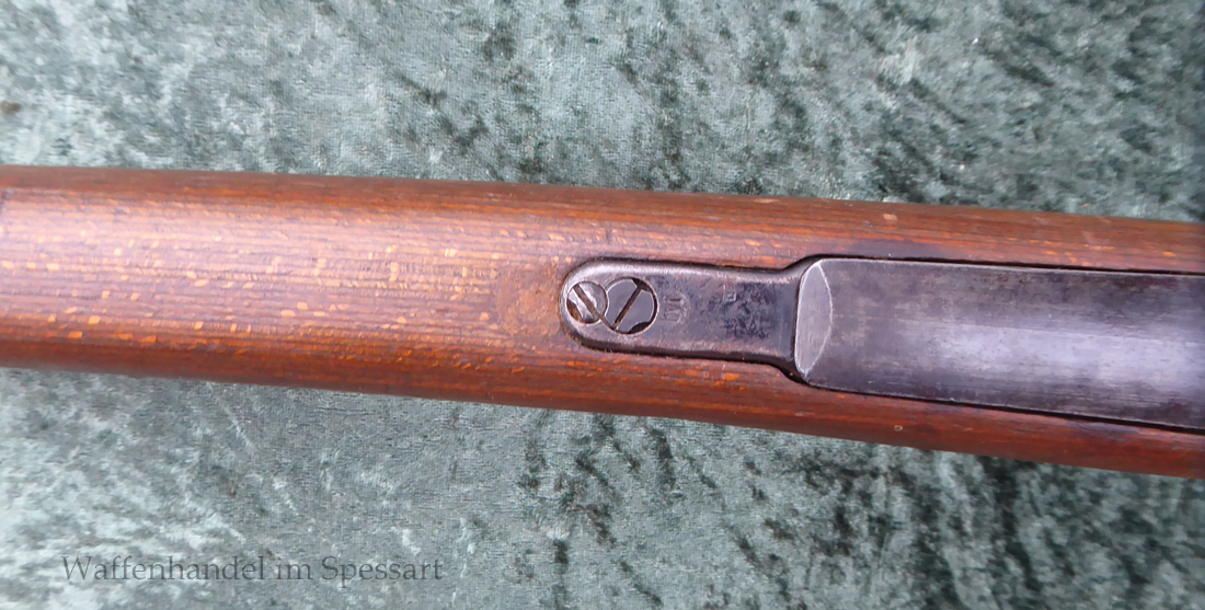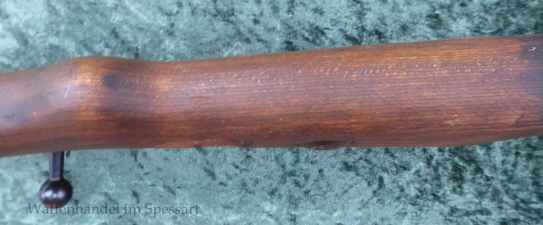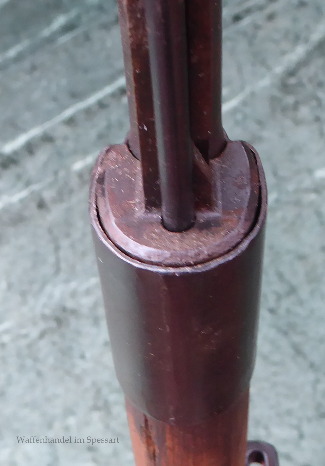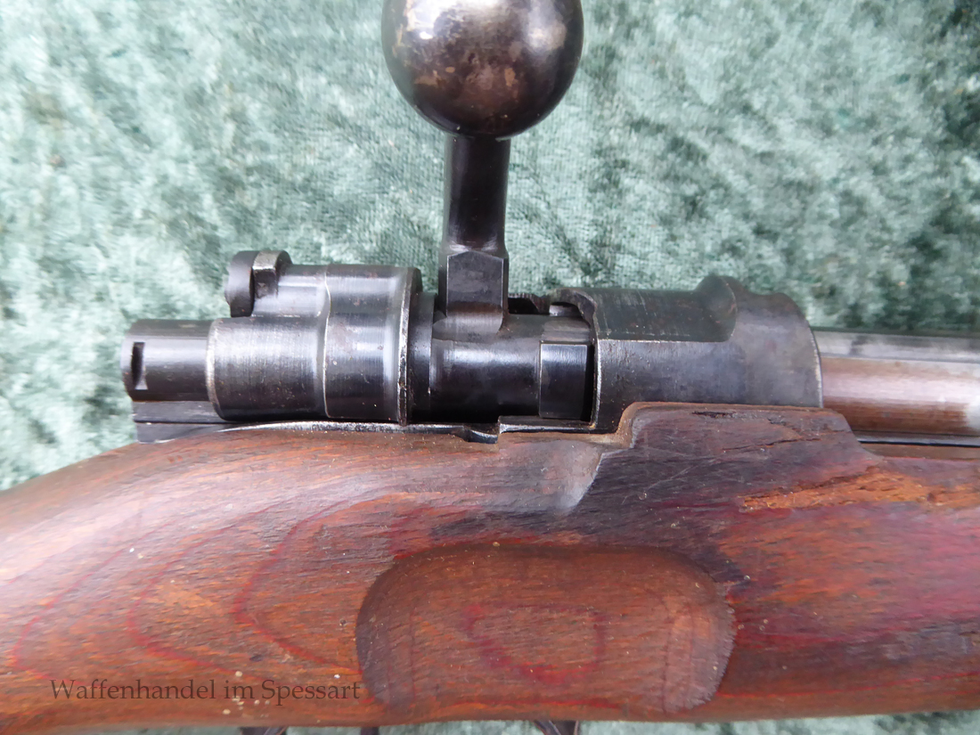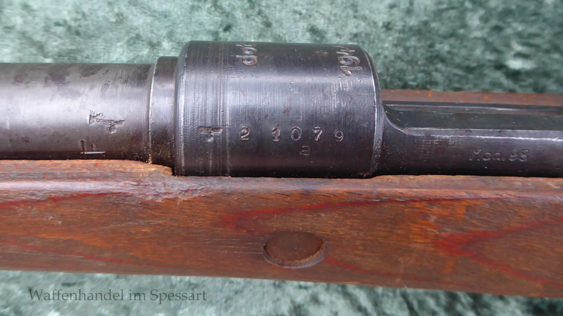 Kal.8x57is. Ser.Nr. 21079a. Nummerngleich. Das Laufinnere hat sehr gute scharfkantige Felder und Züge und ist fast blank (geringe Anhaftungen im Mündungsbereich). Gute orig. Brünierung mit geringen Alterspuren! Guter Schichtholzschaft, der innen nummeriert ist.
