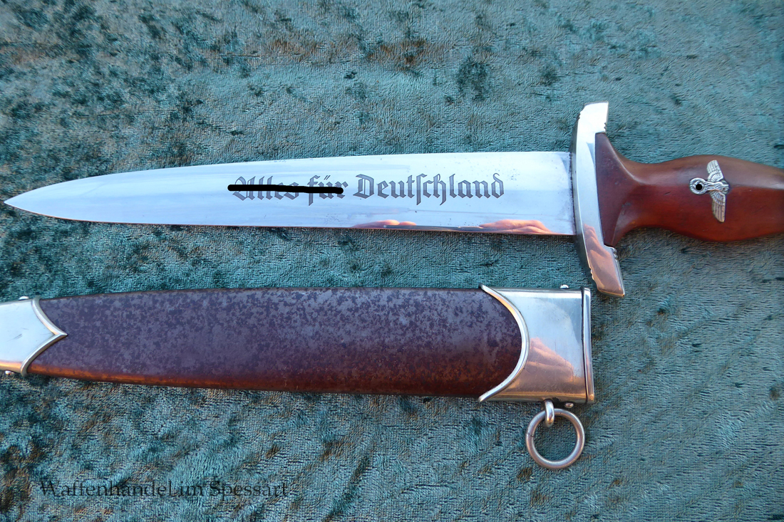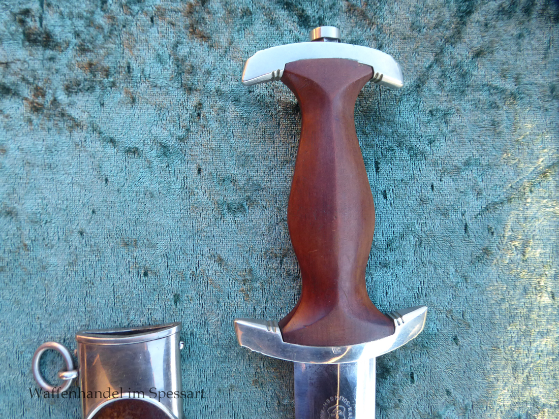Hersteller Kaufmann & Söhne Solingen. Gaustempel Wm für Gau Westmark auf der Parierstange geschlagen. Die Griff- und Scheidenbeschläge sind aus Neusilber. Der Adler ist in Neusilberausführung. Die Scheide ist original bräuniert und hat altersbedingt Flecken aber keine Rostnarben.. Die Klinge ist geätzter Devise Alles für Deutschland. Die Klinge ist orginal blank erhalten!. Der Dolch geht gleitend und saugend in die Scheide.