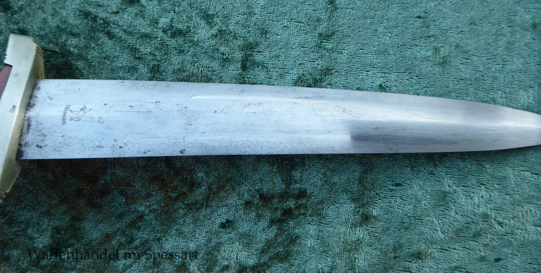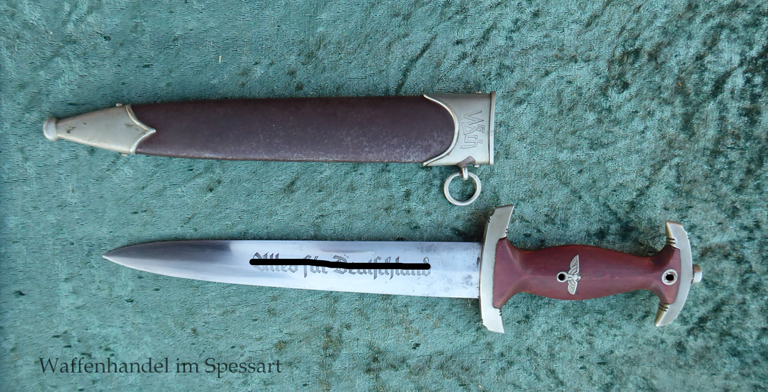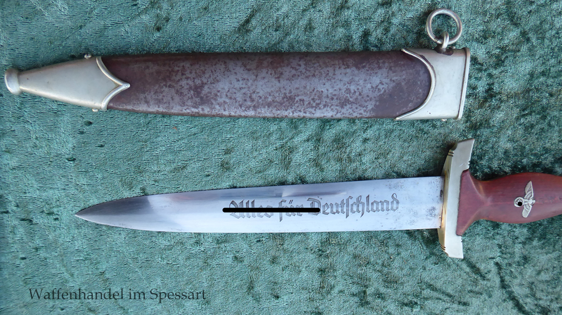 Hersteller Ernst Pack & Söhne Solingen (Ritterwerk). Gaustempel SW für Gau Südwest auf der Parierstange geschlagen. Auf dem oberen Beschlag der Scheide Trägerinitialen W Sch. Auf der Rückseite der Klinge wurde die Röhm Wittmung wie vorgeschrieben in den 30-er jahren entfernt. Die Griff- und Scheidenbeschläge sind aus Neusilber, der Ortbeschlag der Scheide aus vernickeltem Stahl, so orig. montiert!. Der Adler ist in Neusilberausführung. Die Scheide ist bräuniert, hat Patina und Tragespuren. Die Klinge ist geätzter Devise Alles für Deutschland. Die Klinge ist fast blank und hat geringe Fleckchen. Der Dolch geht gleitend und saugend in die Scheide.