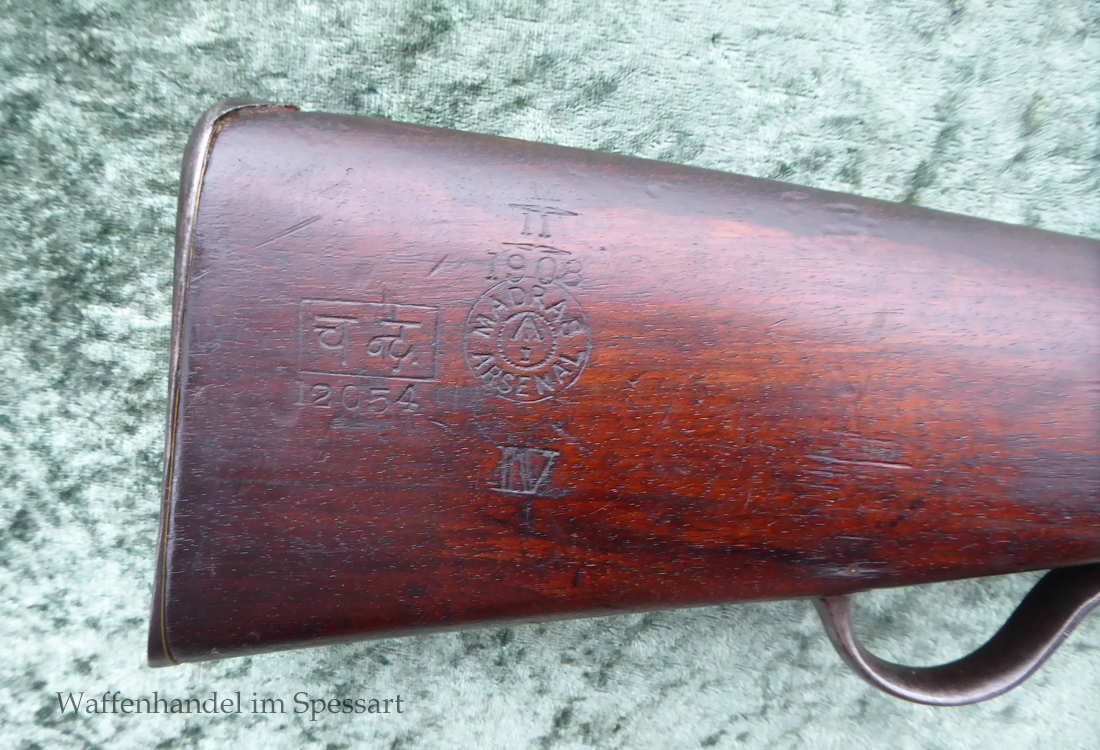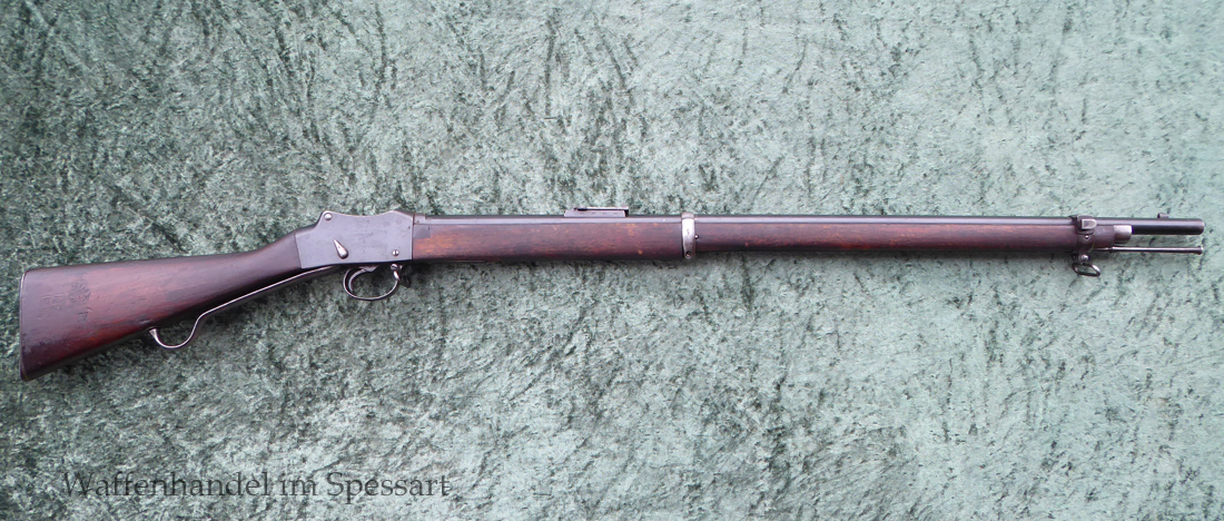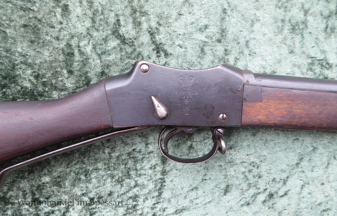 Hersteller Enfield. Kal..577/450Martini. Baujahr 1887. Ser.Nr. 579. Das Laufinnere hat klassische Felder und Züge für Bleigeschosse. Es ist fast blank. Sehr gut original brünierte Metallteile. Schöner Schaft mit deutlicher tiefer Bestempelungen.Unter anderem Matras Arsenal. Das Gewehr hat die britischen Beschußzeichen und auf vielen Teilen den Broad Arrow Stempel.