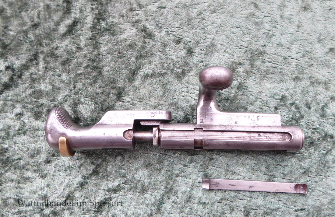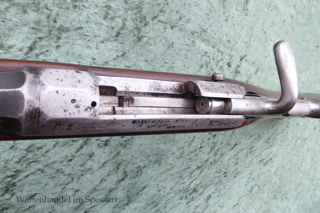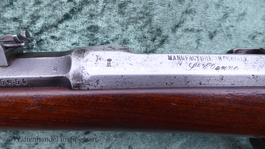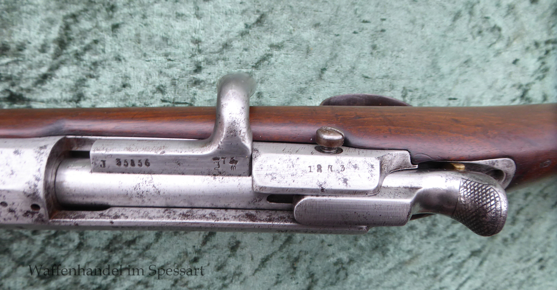 Ursprünglicher Hersteller Manufacture d’armes de Saint-Étienne (MAS). Kaliber 11,15x60RM71. Ser.Nr. J 35856. Nummerngleich. Scharfkantiges fast blankes Laufinnere. Am Lauf Reste der Bürnierung. Das System ist gering fleckig. Die preußischen Schaftabnahmen sind noch sichtbar. Baujahr der Änderung auf der Systemhülse 1873 gestempelt.