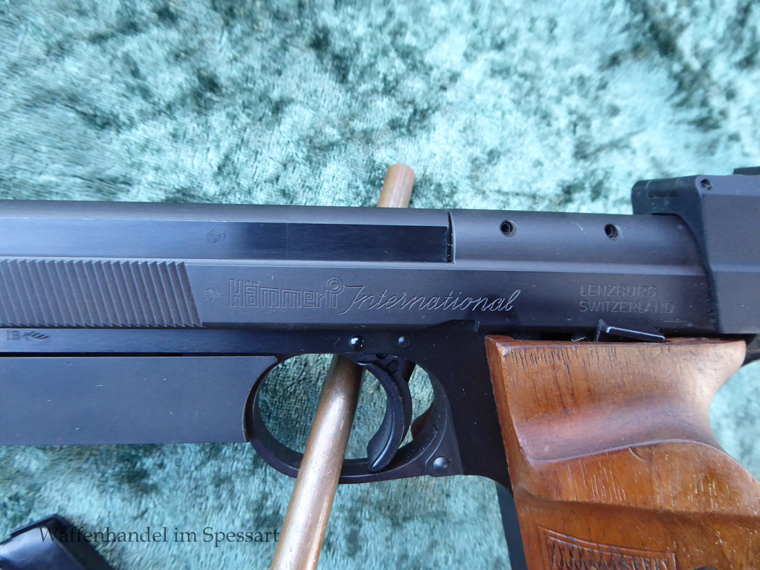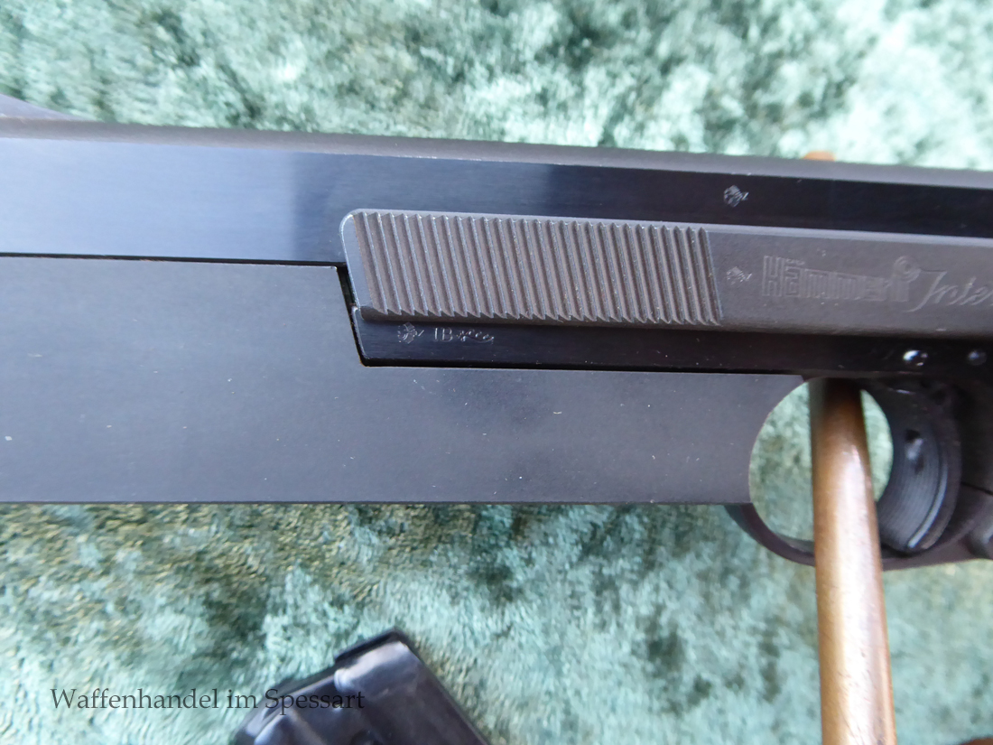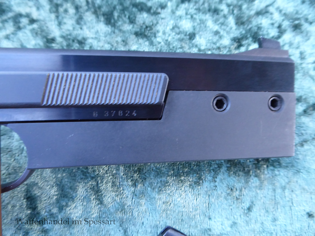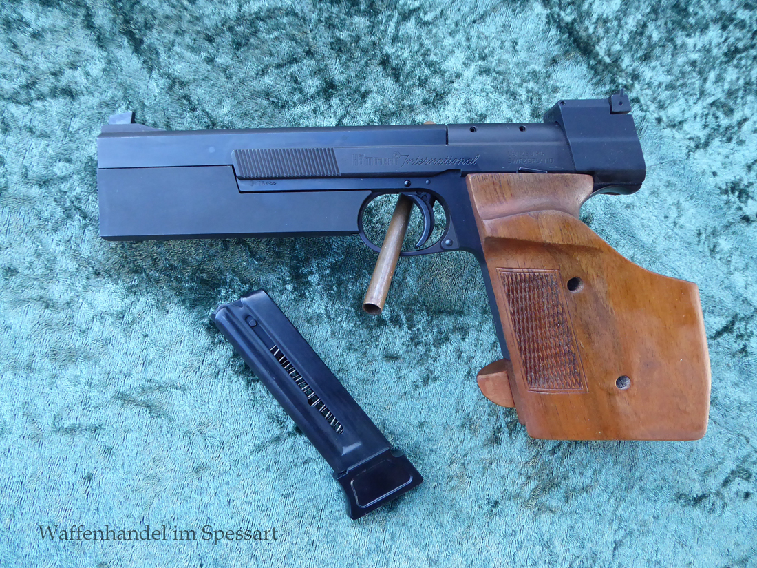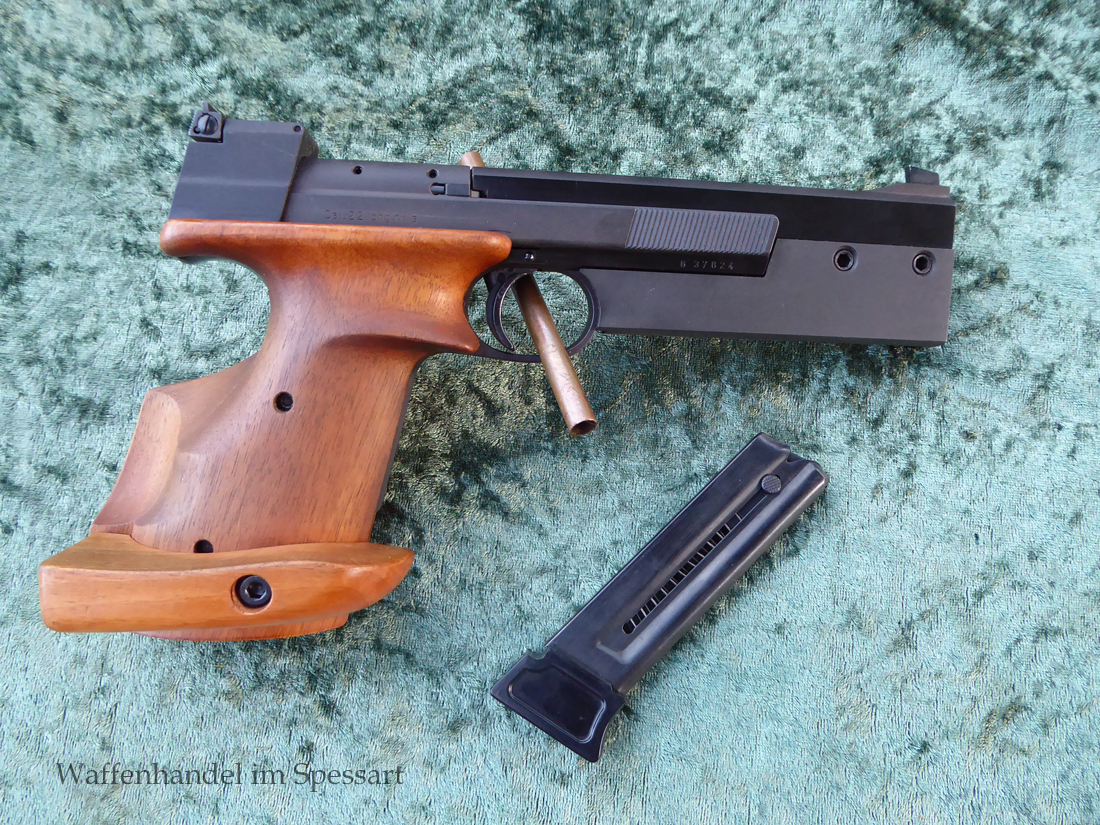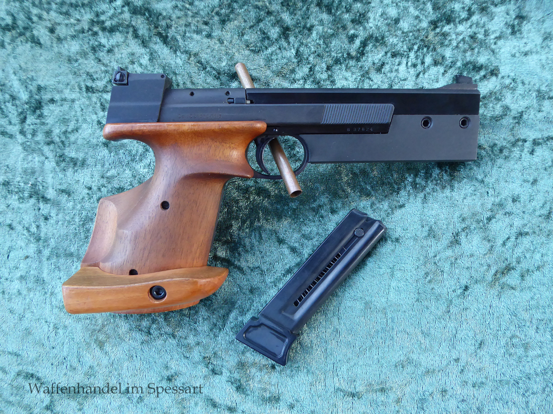Kal..22lr. Ser.Nr. G37624. Gültiger Beschuß von 1981. Scharfkantiges blankes Laufinnere. Schöne orig. Brünierung mit geringen Gebrauchsspuren. Mit zusätzlichem Laufgewicht. Es ist ein Magazin bei der Pistole.