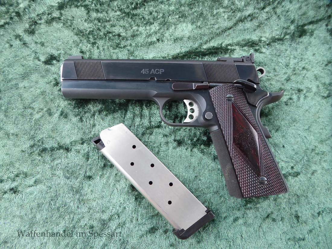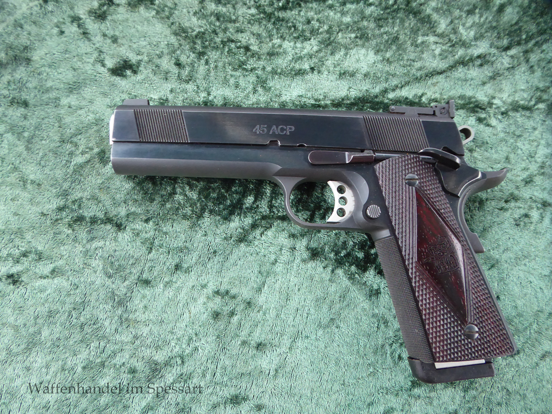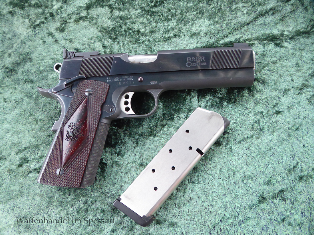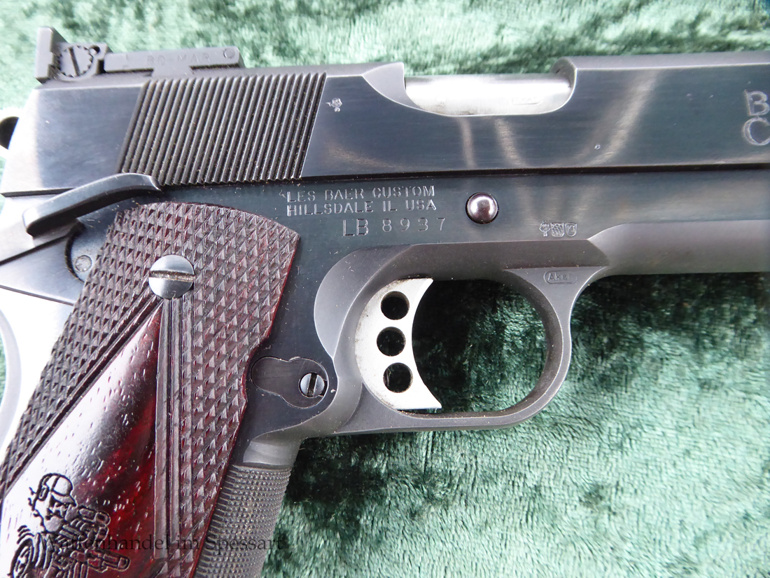 Kaliber.45Auto. Les Baer 5" Matchlauf, Match-Bushing. Les Baer Schlitten mit Front und Rear Griffrillen, Baer "Monolith" Griffstück mit Long Dust Cover, 30 LPI-Griffstückcheckering, vergrößertes Auswurffenster, Aluminium-Matchabzug, Bo-Mar-Visierung, Commander de Luxe Hammer und Sear, Baer-Beavertail, beidseitige Sicherung, gecheckerte Holzgriffschalen, 8-Schuß Magazin mit Abschluß.