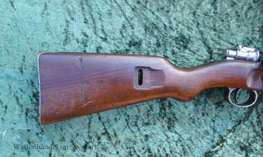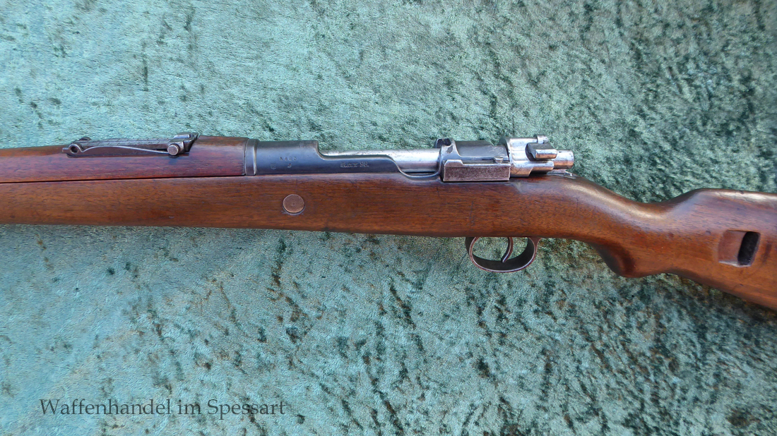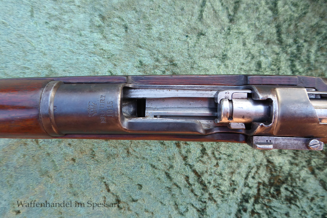 Hergestellt in der Gewehrfabrik in Erfurt 1915. Kal.8x57is. Ser.Nr.5483b. Nummerngleich. Das Laufinnere hat tiefe scharfkantige Felder und Züge. Es ist blank!!! Originale zum Teil abgegriffene Brünierung. Alle Schaftstempel deutlich erhalten.