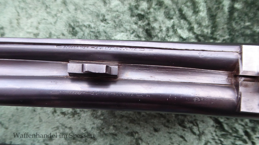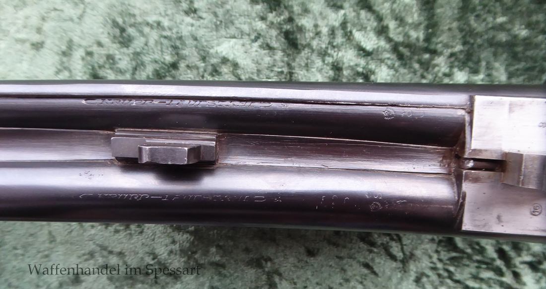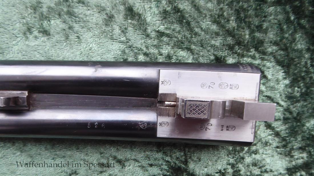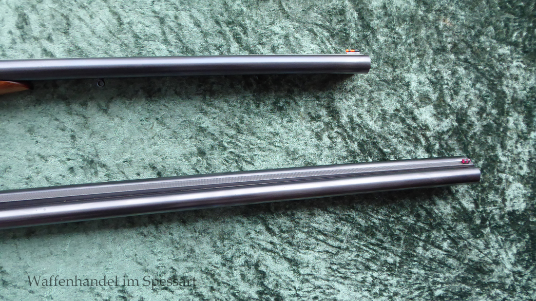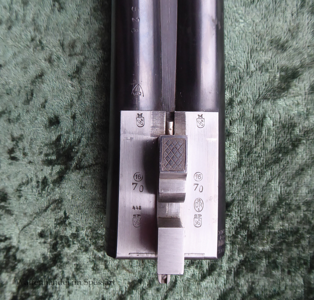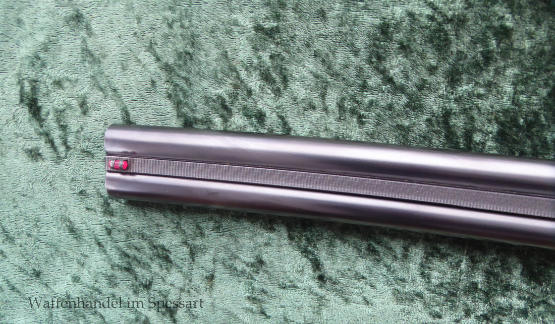 Der Doppelflinten Austauschlauf hat Kaliber 16/70. Ser.Nr. 526, Beschuß vom April 1948 in Suhl. Blanke Läufe. Länge 71 cm. Breite, sich nach vorne verjüngende, guillochierte Laufschiene mit rotem Fiberglaskorn.
