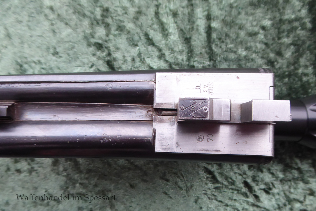 Kal. 8x57IRS, Kal. 16/70, Ser.Nr. 526, nummerngleich! Ansonsystem mit Signalstiften die anzeigen ob gespannt oder entspannt. Doppelte Laufhakenverriegelung mit einem Greener-Querriegel. Läufe aus Special Gewehrlaufstahl von Krupp Essen. Gültiger Beschuss aus 1948 aus Suhl. Stempel "S" Sonderklasse für ausgezeichnete Qualität. Guillochierte Laufschiene mit Standkimme und rotem Fiberglaskorn.Stahlbasküle mit flächendeckender Gravur. Rechts abstreichende Ente, links einfallende Ente.Auf dem Systemboden Auerhahn. Doppelabzug ohne Stecherfunktion. Schiebesicherung auf dem Kolbenhals. Schaft aus wertigem Nussbaummaserholz mit Pistolengriff und deutscher Backe. Schwarze Hornkappe als Schaftabschluss. Im Vorderschaft und am Kolbenhals seitlich Horneinlagen. ZF Schmidt und Bender 1,5-6 x 42, Abs. 4. Dieses ist mit einer Schwenkmontage montiert. Gesamtlänge Büchsflinte 103 cm. Lauflänge Büchsflinte 60cm. Schaftmaß 37,5cm. Gesamtlänge Flinte 114,5cm. Länge der Flintenläufe 72cm.