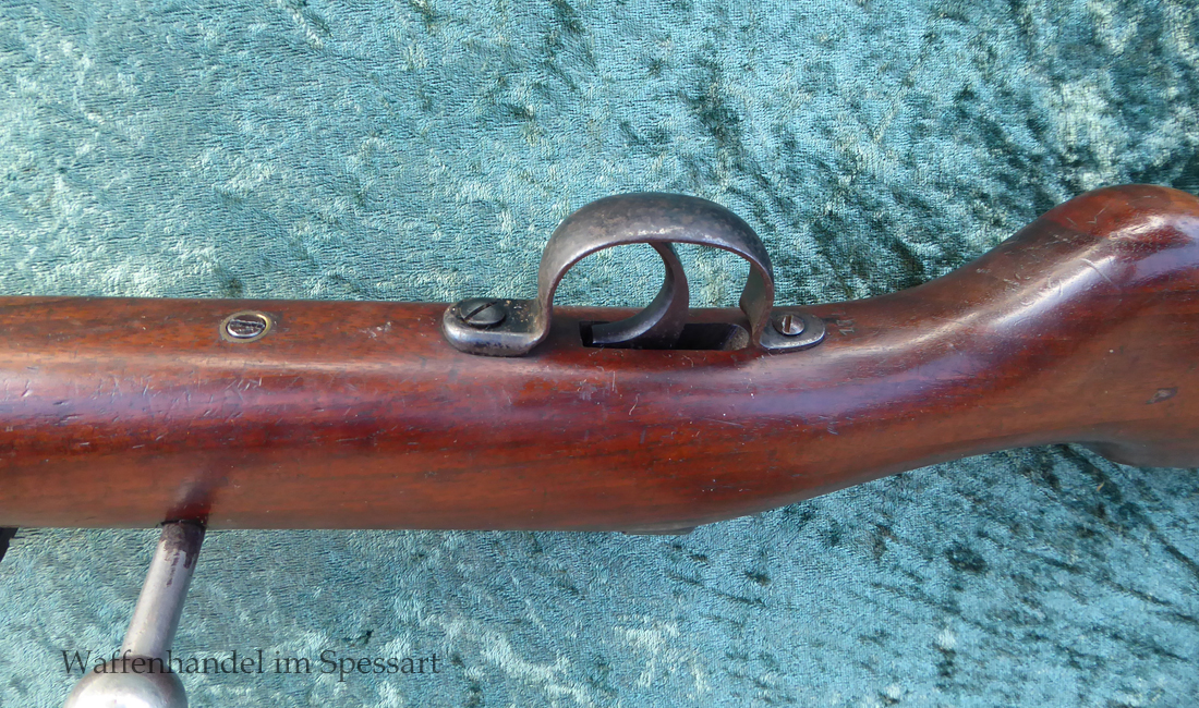 Hersteller Venus Waffenwerk Zella - Mehlis, Mod 1708, Kal.4,4mm Rundkugel. Sehr frühes Repetierluftgewehr im Art des Gewehr 98 mit einer Nachempfindung an das "hohe Visier" der Gewehres. Originale grieselige Brünierung. Das Magazin ist der Laufmantel, der vorne durch drehen unter der Laufmündung geöffnet und geschlossen werden kann. Inhalt 500 Kugeln! Repetiersystem mit guter strammer Feder. Dichtung schwächer.