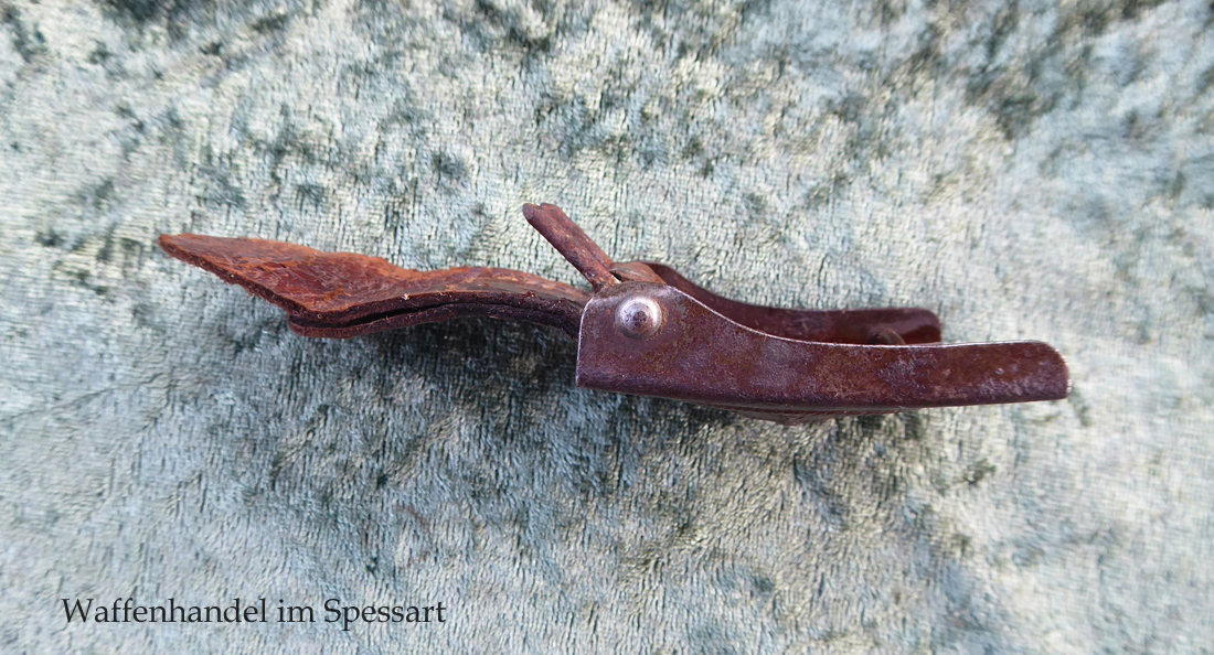 Aus Stahl / Eisen. Mit Lederzunge. Diese mit Hersteller (undeutlich) von 1916. Unberührter Dachbodenfund mit Patina und Flugrost.