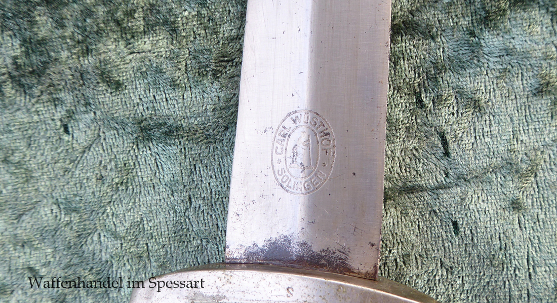 Hersteller Carl Wüsthof Solingen. Gaustempel S für Gau Schlesien auf der Parierstange geschlagen. Die Griff- und Scheidenbeschläge sind aus Neusilber mit Ihren Alters- und Gebrauchsspuren (viel Patina). Der Adler ist in Neusilberausführung. Die Scheide hat schwarze Farbe, die blättrich und viel Alterspuren hat. Sie hat abplatzunegen, Patina und stellenweise geringe Rostflecken. Die Klinge ist geätzter Devise Alles für Deutschland. Die Klinge hat ihre Alters- und Gebrauchspuren. Sie hat Spuren vom gebraucht, Kratzer, alte Reinigungsspuren. Der Dolch geht gleitend und saugend in die Scheide.