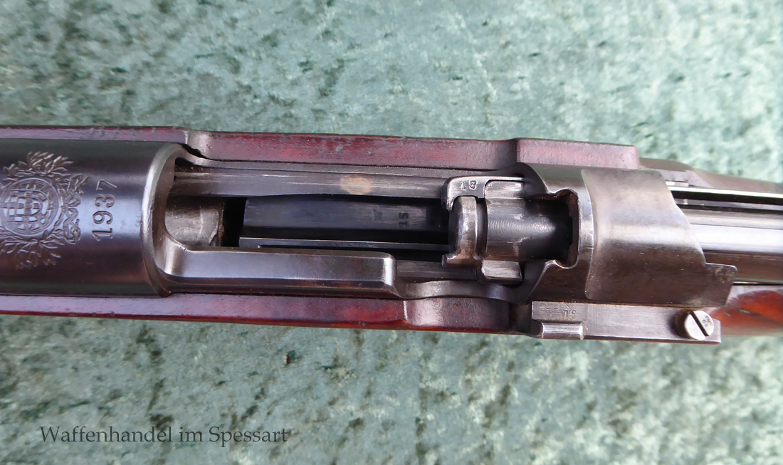 Hersteller Mauser Oberndorf. Kal.8x57is. Ser.Nr. C18515. Nummerngleich. Mit nummerngleichem Bajonett. Das Laufinnere hat scharfkantige Felder und Züge und ist blank. Gute und schöne originale Brünierung mit Spuren des Gebrauches. Der Nußbaum Schaft mit geringen Gebrauchspuren und allen tief erhaltenen Abnahmen. Durch die frühe Fertigung für Portugal bedingt haben alle Teile die Abnahme Waa 63. Diese Serie hat original ein Balkenkorn und eine Kimme mit U Ausschnitt für besseres Zielen!