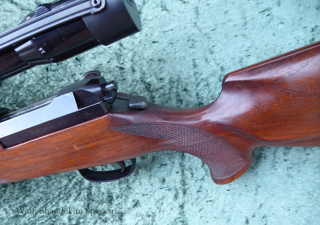 Hersteller Mauser Oberndorf. Kal.8x68S. Ser.Nr. SG59443. Beschuß in Ulm 1994. Die Besonderheit dieser Mauser 66SL ist das diese die modernere Sicherung zum Schieben nach Vorne und Hinten hat, sowie den Stecher auf dem Kolbenhals. Einstellbarer Direktabzug macht diese zur "modernen" Büchse! Scharfkantiges blankes Laufinnere. Fast vollständige Hochglanzbrünierung. Nußbaumschaft mit geringen Gebrauchspuren (leichte Kratzer durch das Stellen im Tresor).
