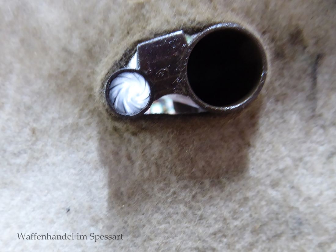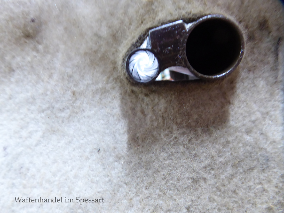 Das Laufinnere des Schrotlaufes ist leicht matt. Der Kugellauf hat scharfkantige Felder und Züge. Er ist blank. Das System ist fest und dicht. Das Laufbündel ist original streichbrüniert und das System hat Reste von Bunthärtung.Die Hahnschlosse haben Sicherheitsrückspringschlosse die tadellos rasten. Origenale Hornkappe.