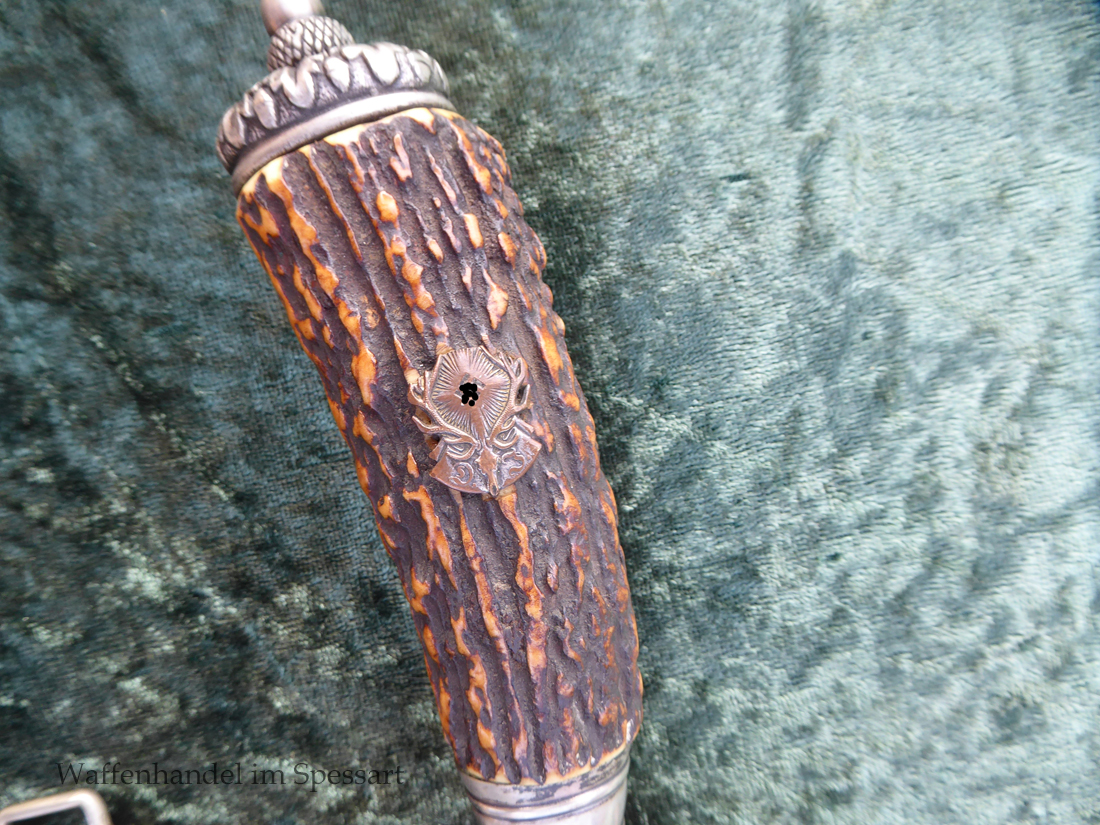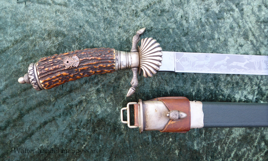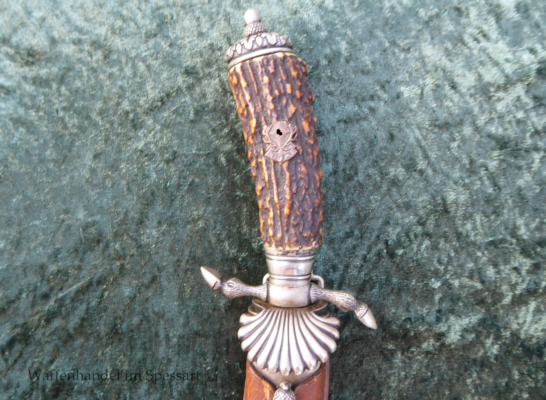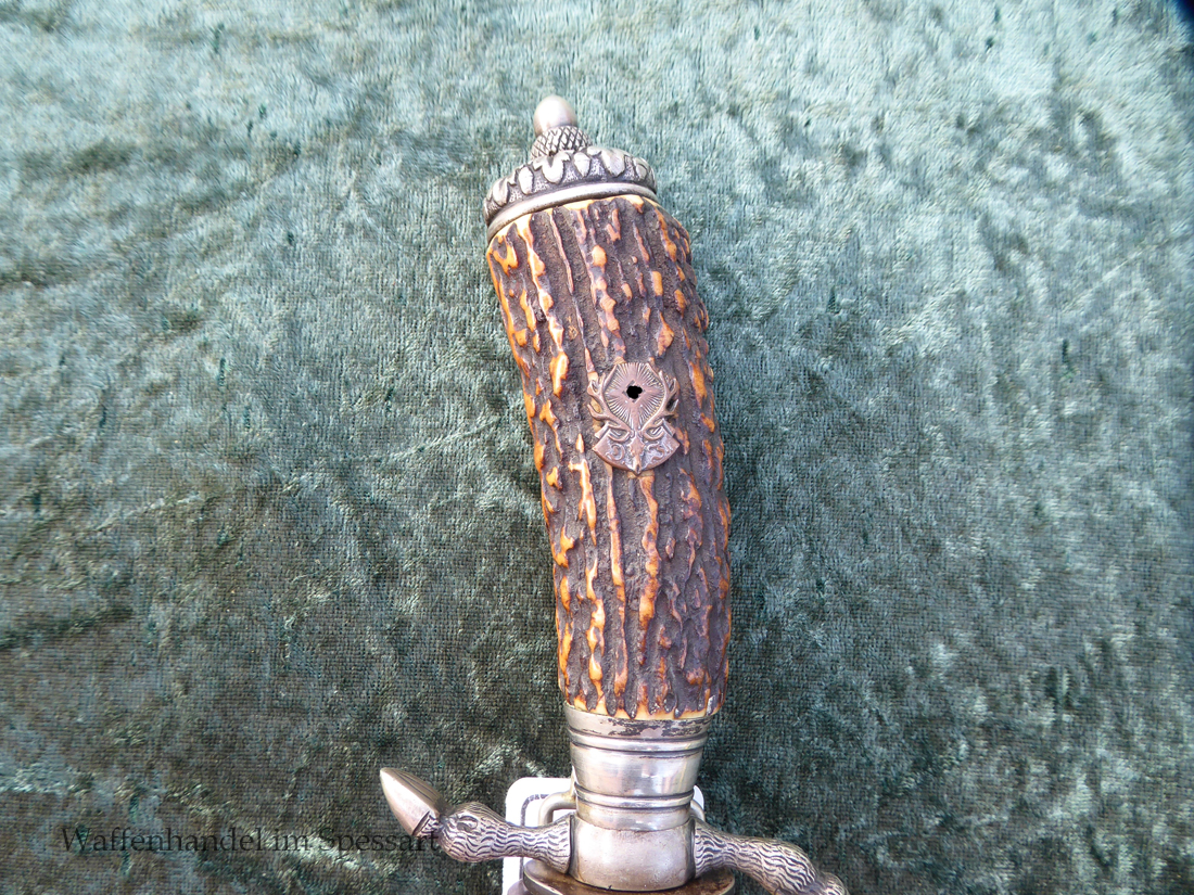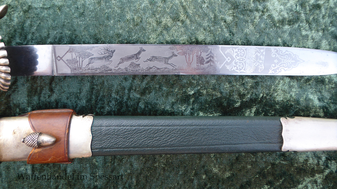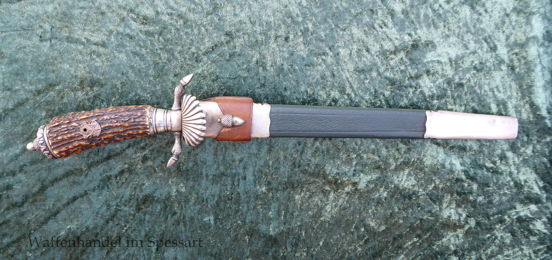 Hergestellt in Solingen ohne Herstellermarkierung. Echter schön geperlter Hirschhorngriff. Fein geätzte fast perfekt erhaltene Klinge. Originales Abzeichen der deutschen Jägerschaft! Es ist magnetisch, Trägeschicht Kupfer und hat keine Versilberung mehr (abgegriffen) mit Patina. Grüne Saffian Lederscheide die geklammert ist. Versilberte Montur. Sehr schön plastisch gearbeiteter Griffabschluß mit Eichenlaub und Eichel.