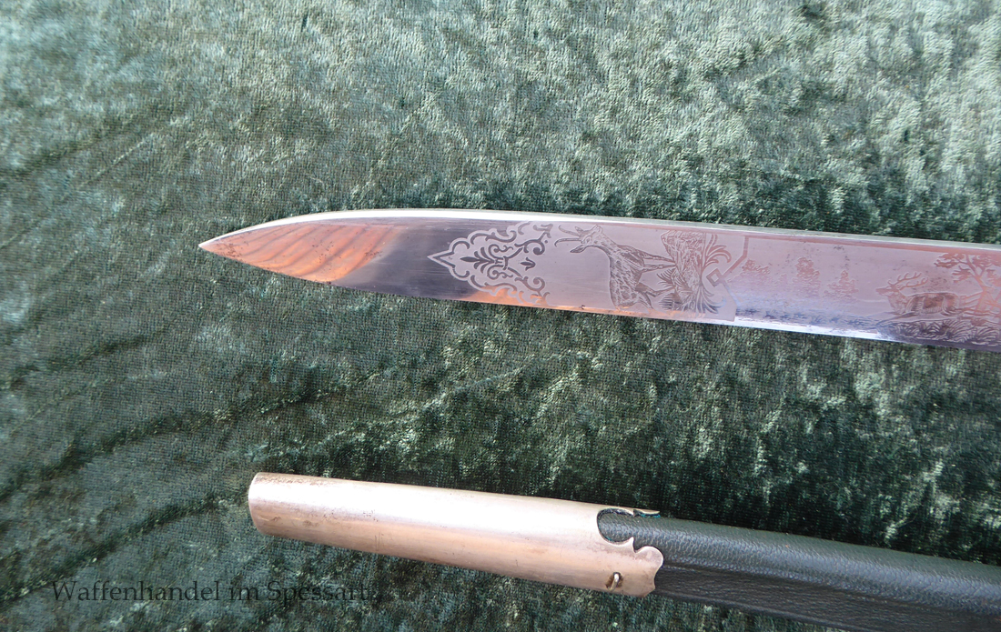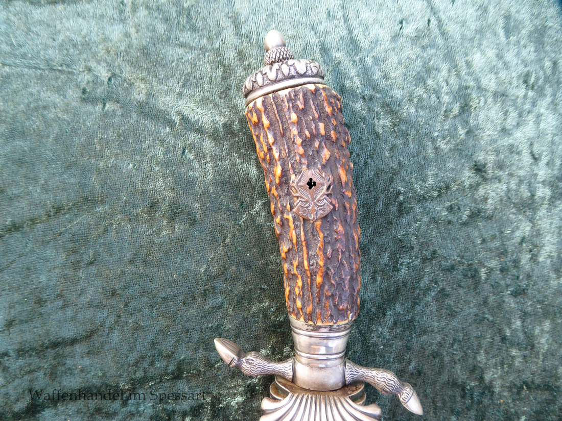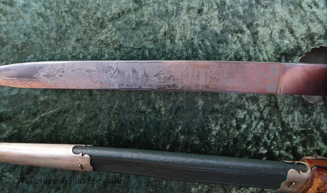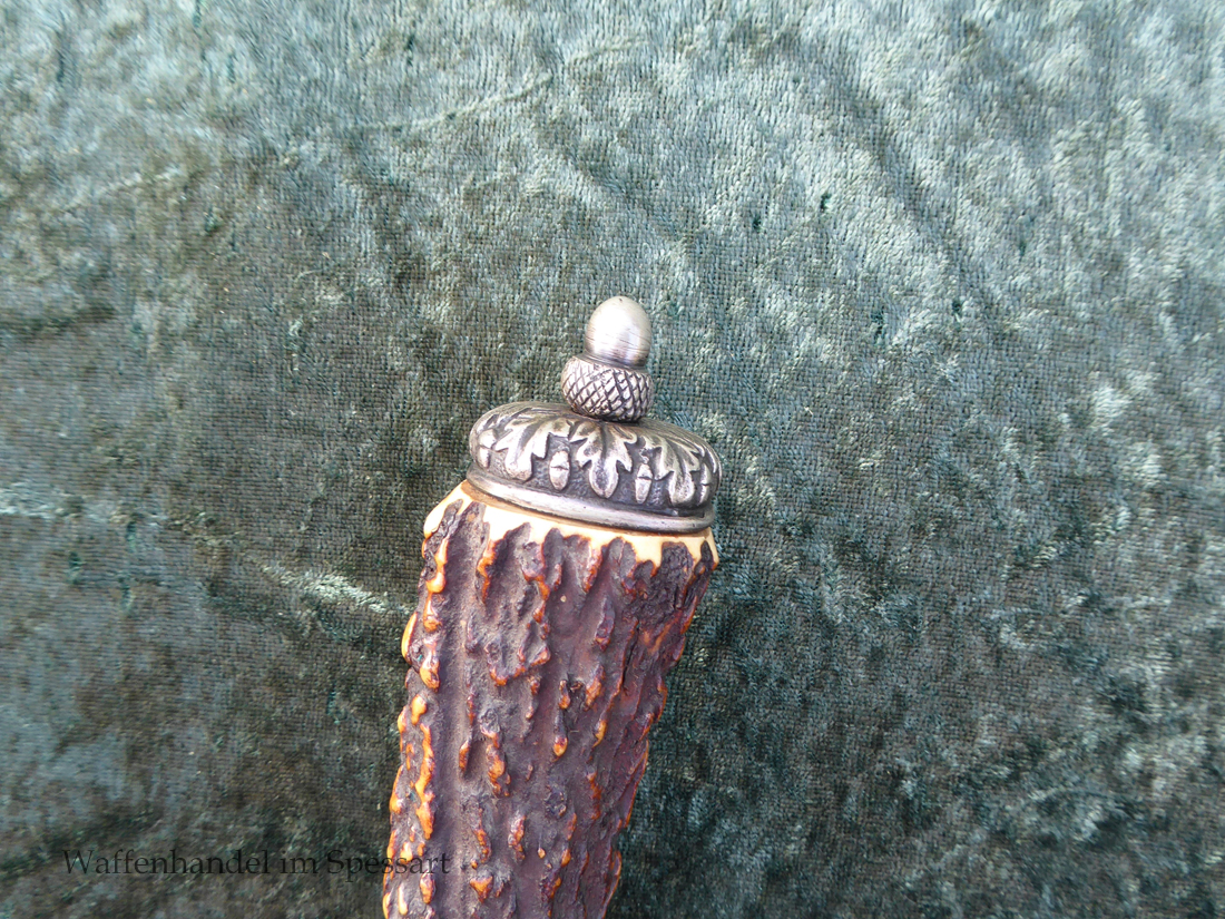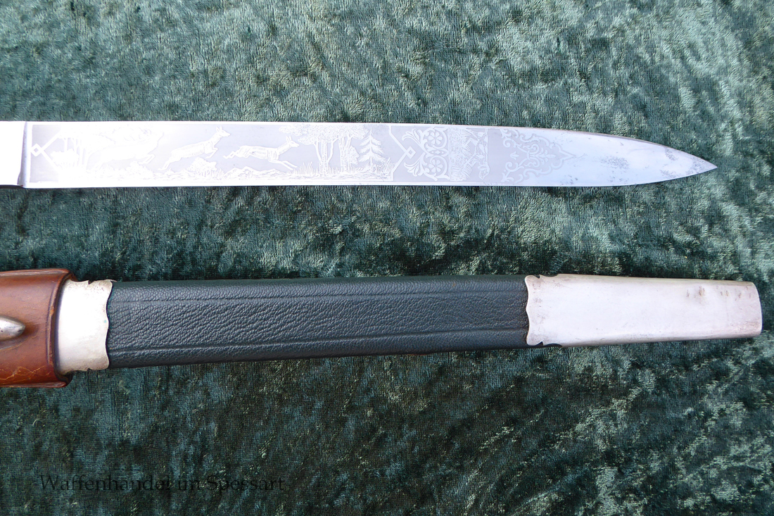 Hergestellt in Solingen ohne Herstellermarkierung. Echter schön geperlter Hirschhorngriff. Fein geätzte fast perfekt erhaltene Klinge. Originales Abzeichen der deutschen Jägerschaft! Es ist magnetisch, Trägeschicht Kupfer und hat keine Versilberung mehr (abgegriffen) mit Patina. Grüne Saffian Lederscheide die geklammert ist. Versilberte Montur. Sehr schön plastisch gearbeiteter Griffabschluß mit Eichenlaub und Eichel.