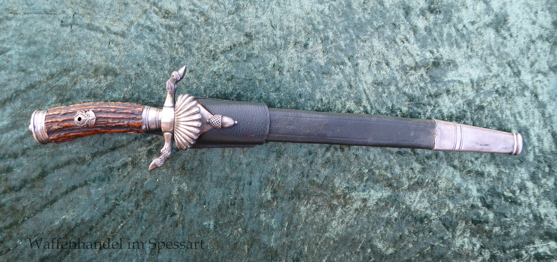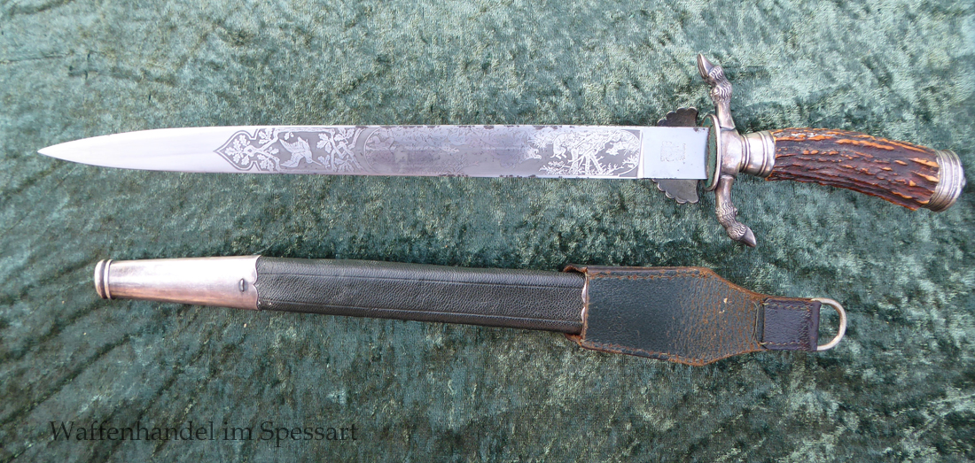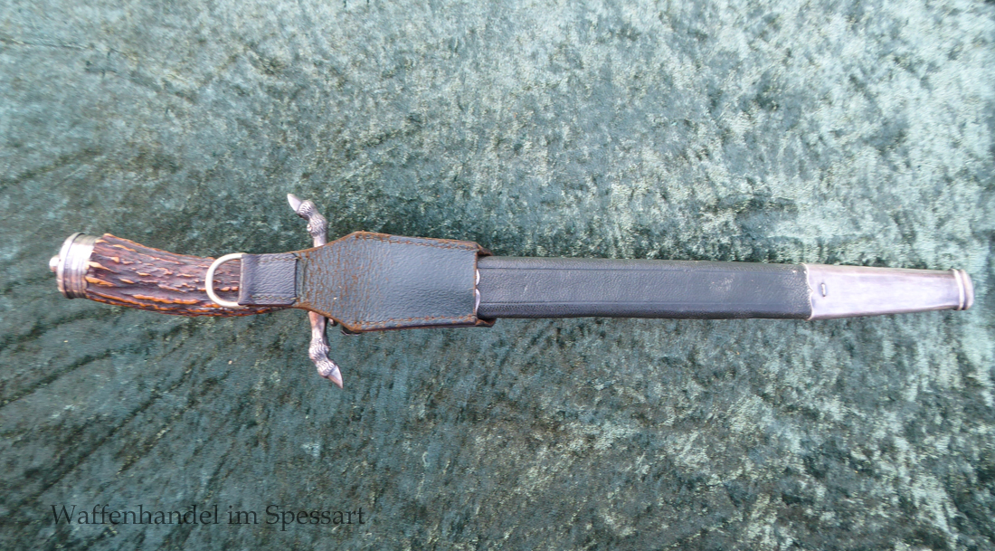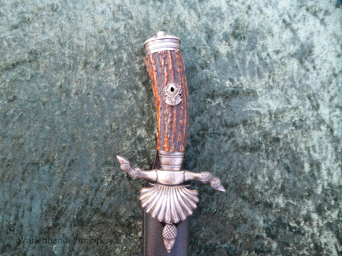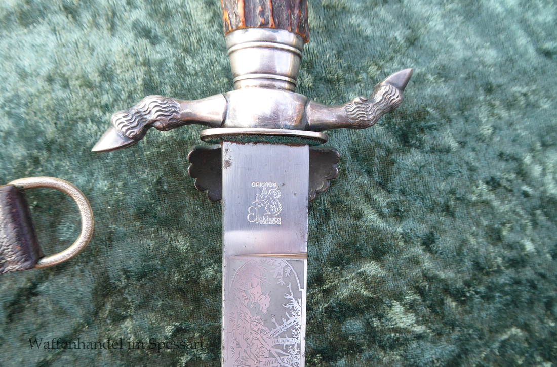 Hergestellt von Eickhorn in Solingen. Echter schöner Hirschhorngriff. Fein geätzte fast perfekt erhaltene Klinge (geringe Fleckchen an den Kanten). Originales Abzeichen der deutschen Jägerschaft! Es ist magnetisch, Trägeschicht Kupfer und hat keine Versilberung mehr (abgegriffen) mit Patina. Grüne Saffian Lederscheide die geklammert ist. Versilberte Montur.