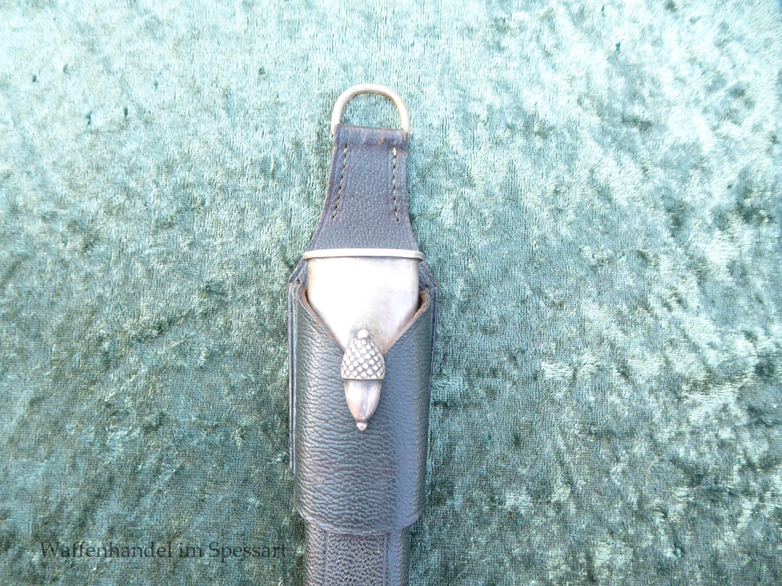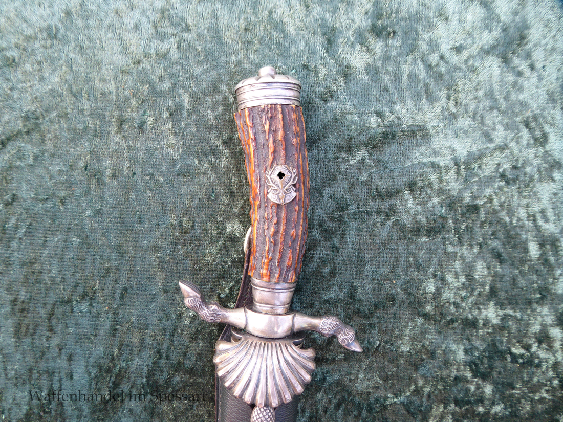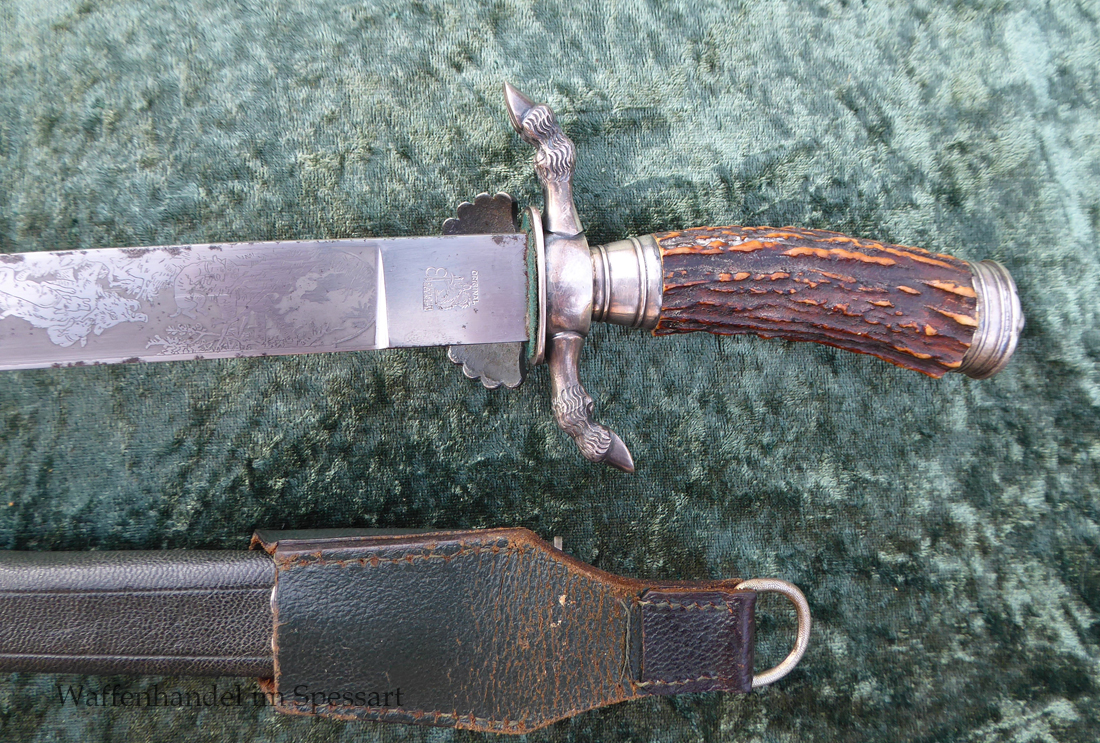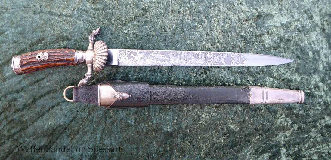 Hergestellt von Eickhorn in Solingen. Echter schöner Hirschhorngriff. Fein geätzte fast perfekt erhaltene Klinge (geringe Fleckchen an den Kanten). Originales Abzeichen der deutschen Jägerschaft! Es ist magnetisch, Trägeschicht Kupfer und hat keine Versilberung mehr (abgegriffen) mit Patina. Grüne Saffian Lederscheide die geklammert ist. Versilberte Montur.