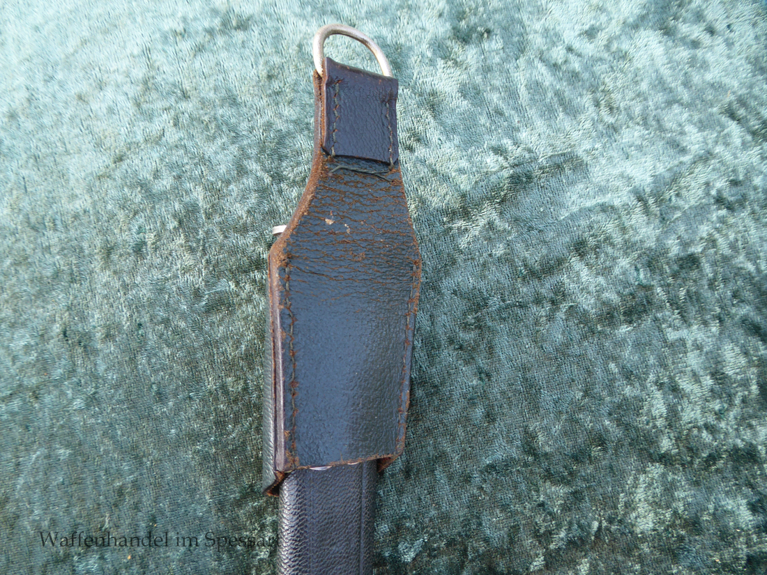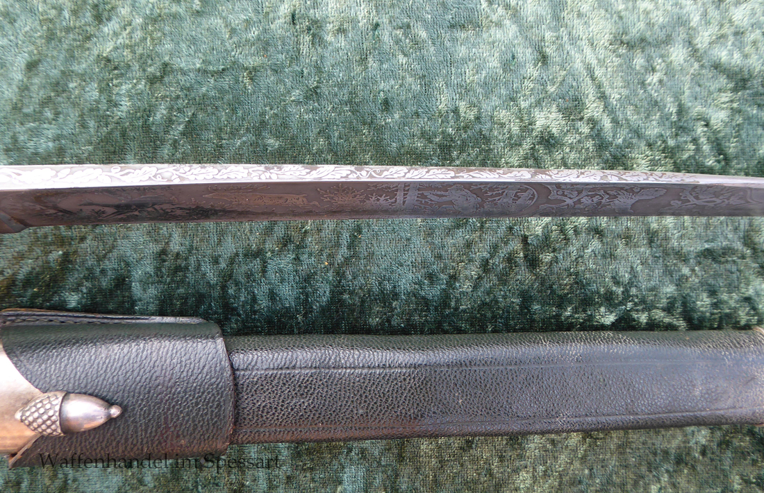Gesamtlänge mit Scheide 48,5cm. Hirschfängerlänge 46,5cm, Klingenlänge 33cm, Klingenbreite 27mm. Mit orig. dazu gehörigem Koppelschuh.