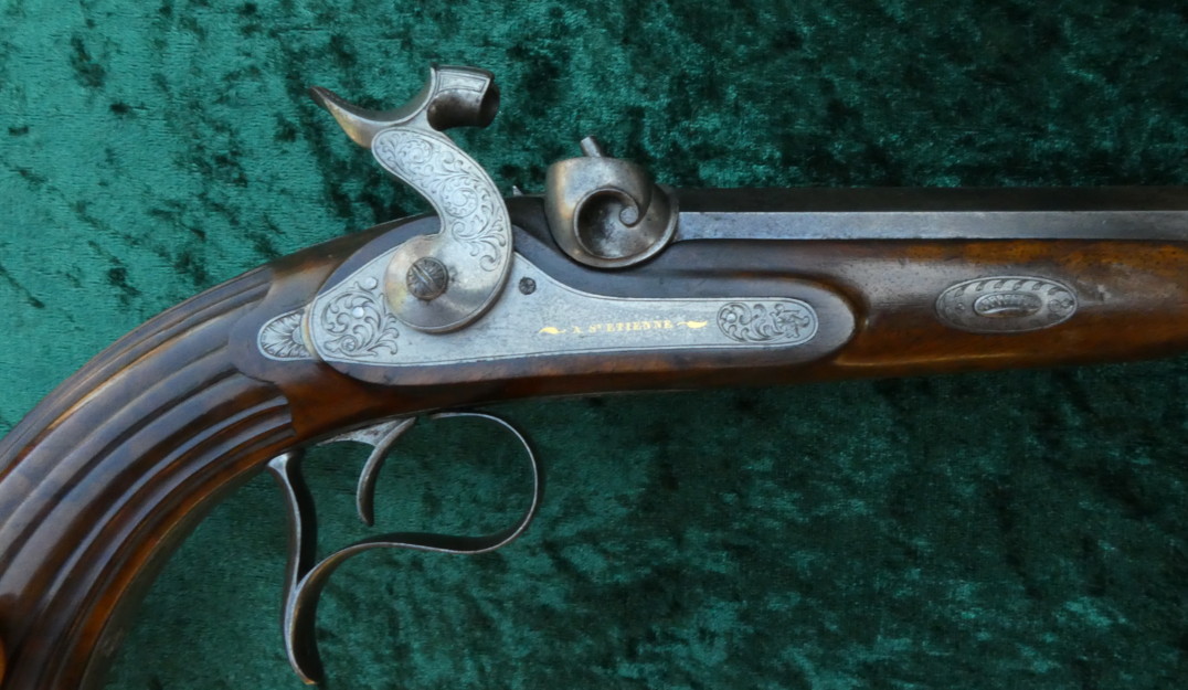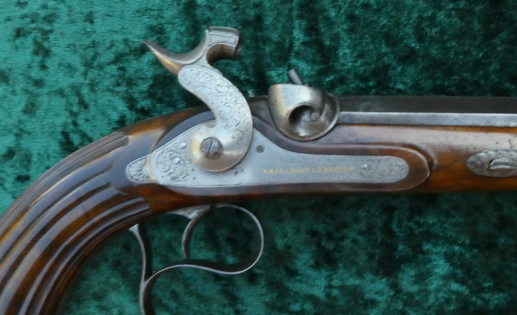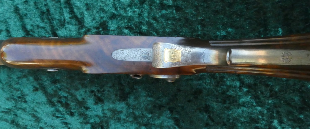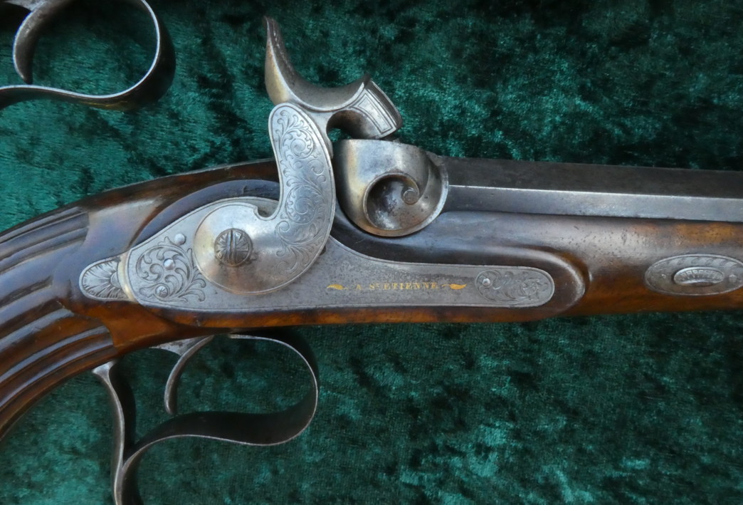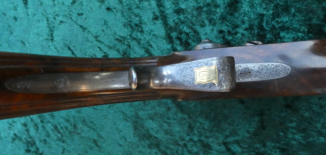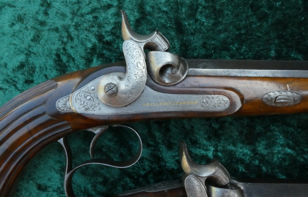Galabert La Motte aus St. Etienne, gebläute Läufe in Achtkantform und 12 fach gezogenen Laufseelen im Kal 12mm. Die Läufe sind innen blank. Die Schlösser sind signiert. Auf den Patentschwanzschrauben sind verstellbare Visiere eingelassen. Die Abzugsbügel und die Knaufkappen, Hähne und Seitenschlosse sind mit Ornamenten graviert. Fein in zwei Rasten spannende Schlosse. Abzüge mit feinem Direktabzug. Halbschäftung aus Nußbaum mit kanneliertem Kolben.