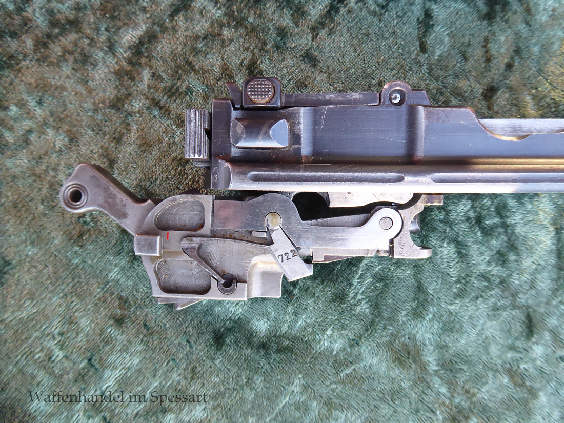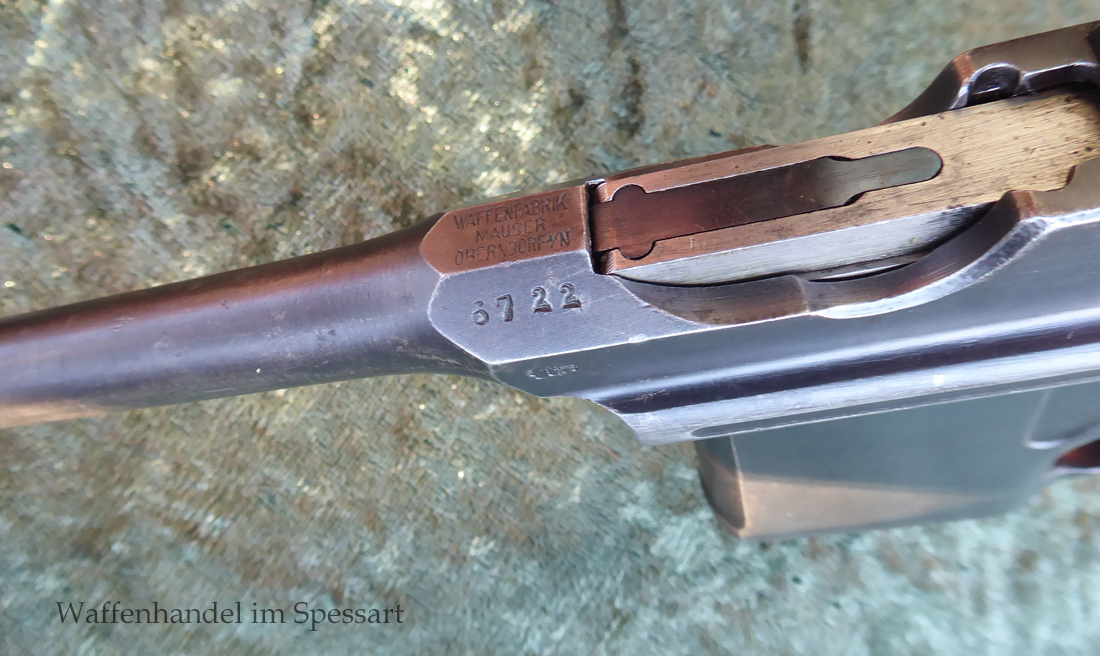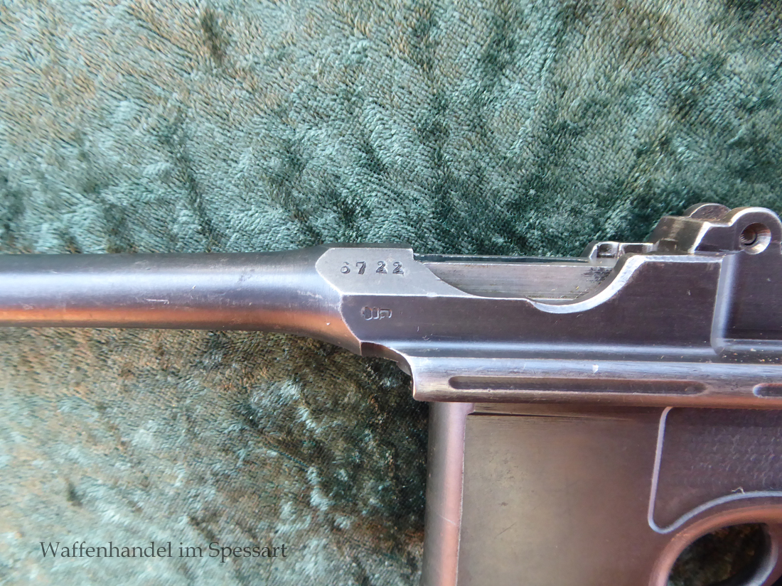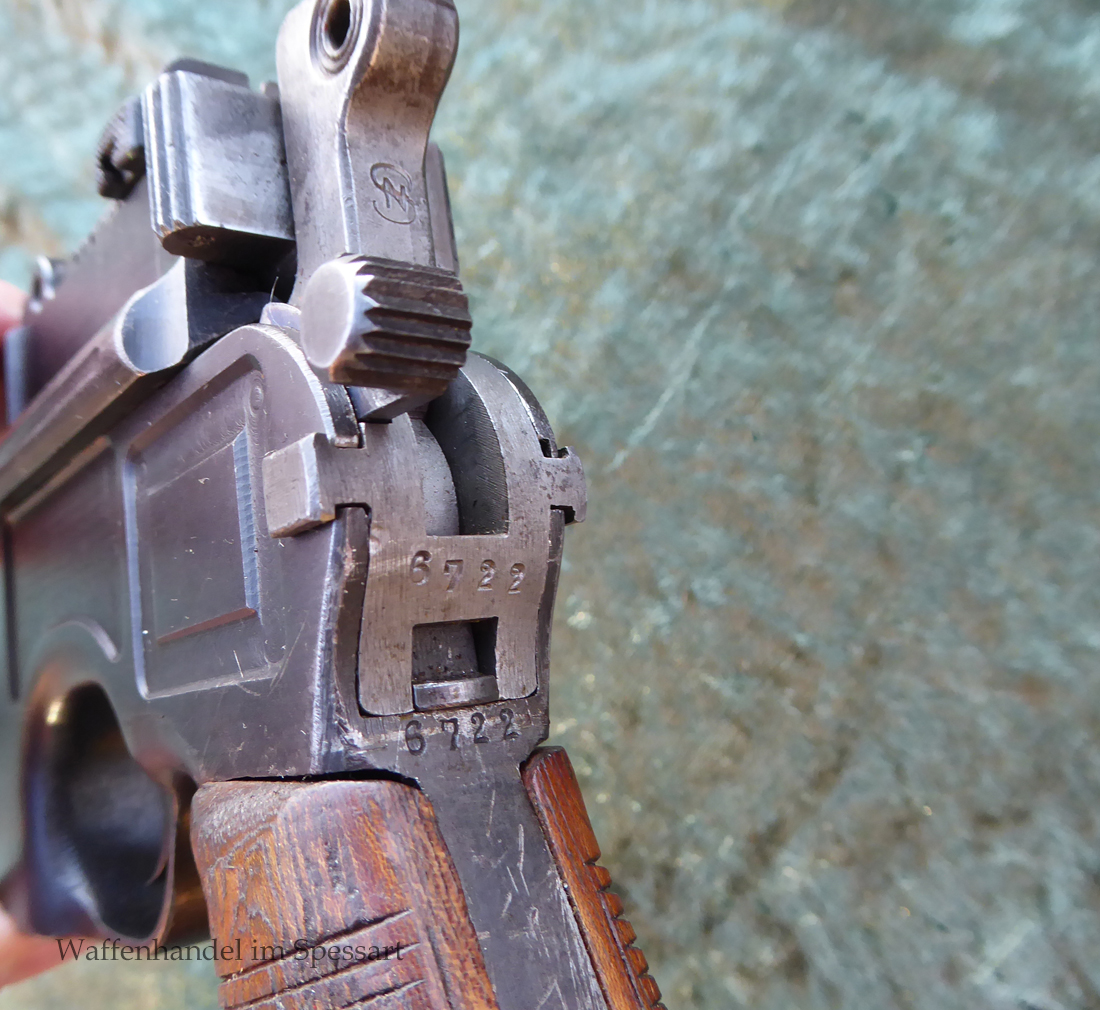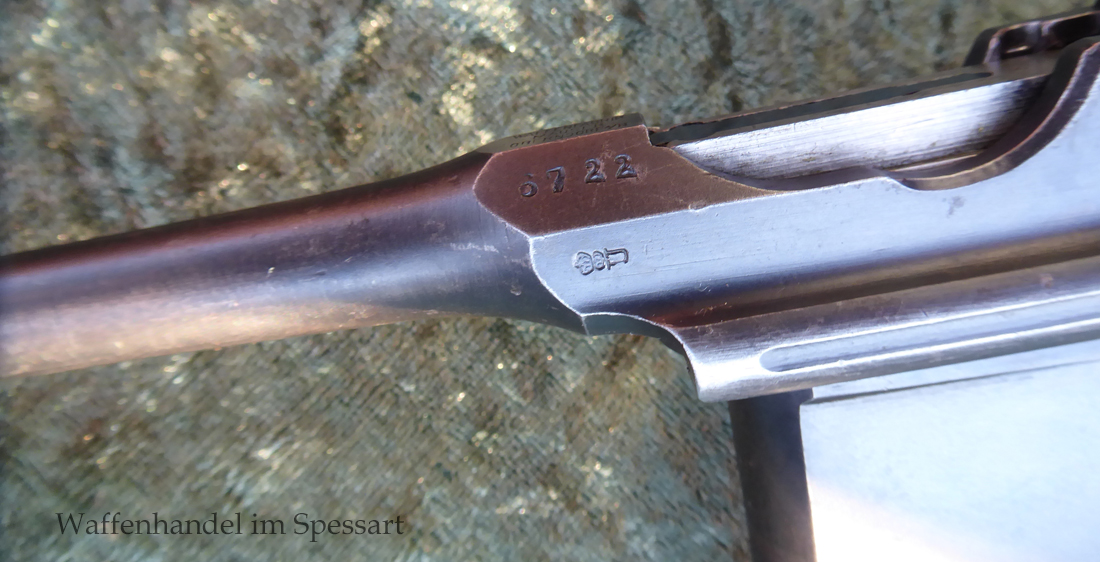 Kal.9mmLuger. Ser.Nr. 6722. Nummerngleich mit nummerngleichem Anschlagkasten. Scharfkantiges fast blankes Laufinnere. Sehr gute originale Brünierung. Gültiger kaiserlicher ziviler U unter Krone. Schiebevisier bis 500 Meter. Gute stramme Mechanik. Der nummerngleiche Anschlagkasten ist im identischen sehr gutem Zustand. Bei den Griffschalen wurden wuhl im Feld oder in einer kleinen Werstatt, die Nummer gestrichen und danach mit der 6722 geschlagen.