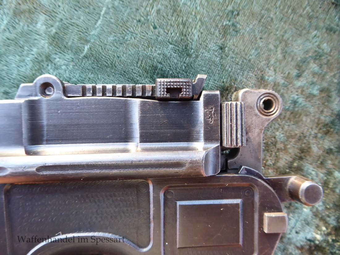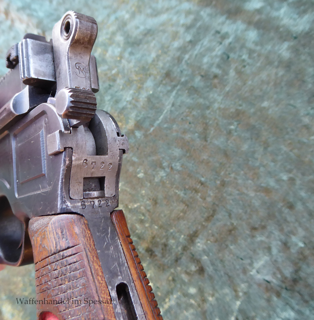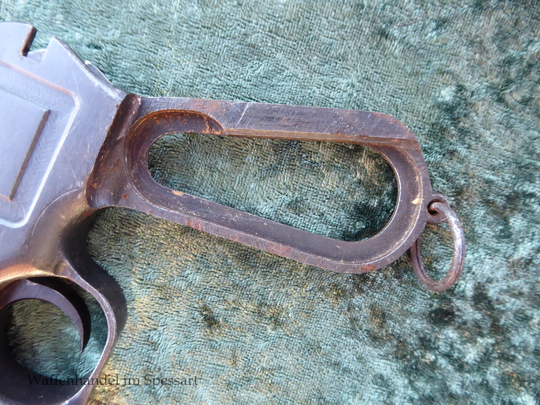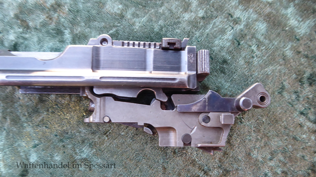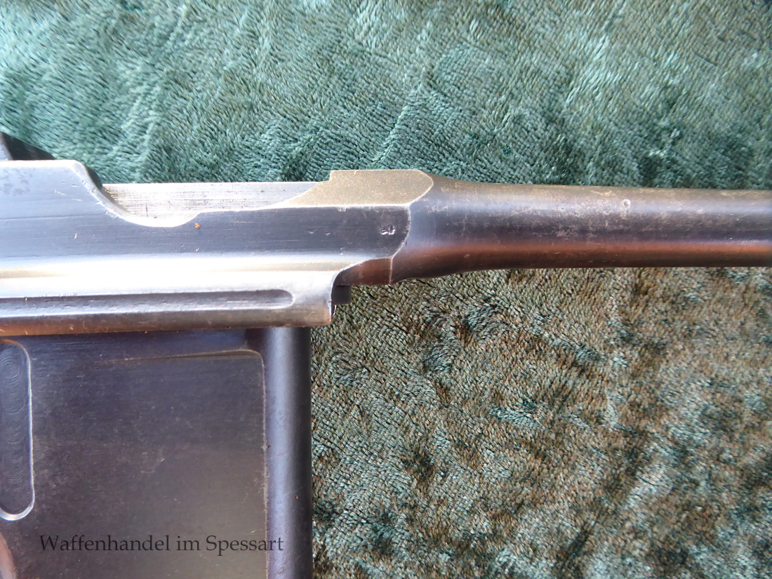 Kal.9mmLuger. Ser.Nr. 6722. Nummerngleich mit nummerngleichem Anschlagkasten. Scharfkantiges fast blankes Laufinnere. Sehr gute originale Brünierung. Gültiger kaiserlicher ziviler U unter Krone. Schiebevisier bis 500 Meter. Gute stramme Mechanik. Der nummerngleiche Anschlagkasten ist im identischen sehr gutem Zustand. Bei den Griffschalen wurden wuhl im Feld oder in einer kleinen Werstatt, die Nummer gestrichen und danach mit der 6722 geschlagen.