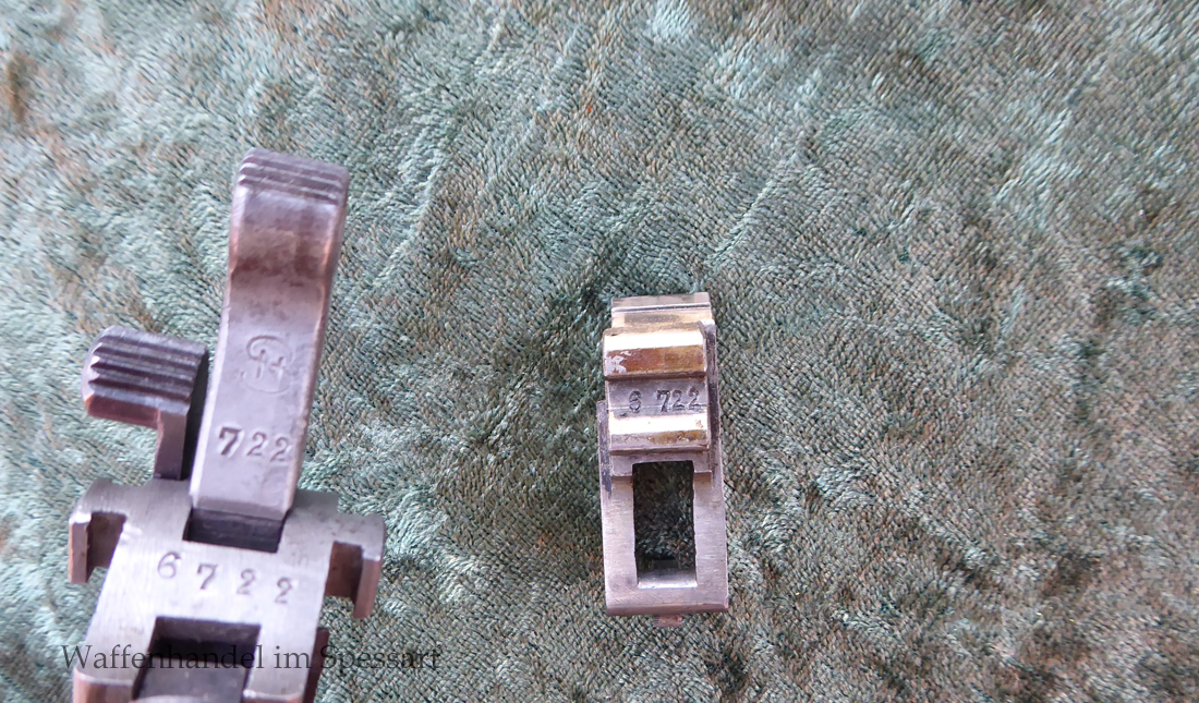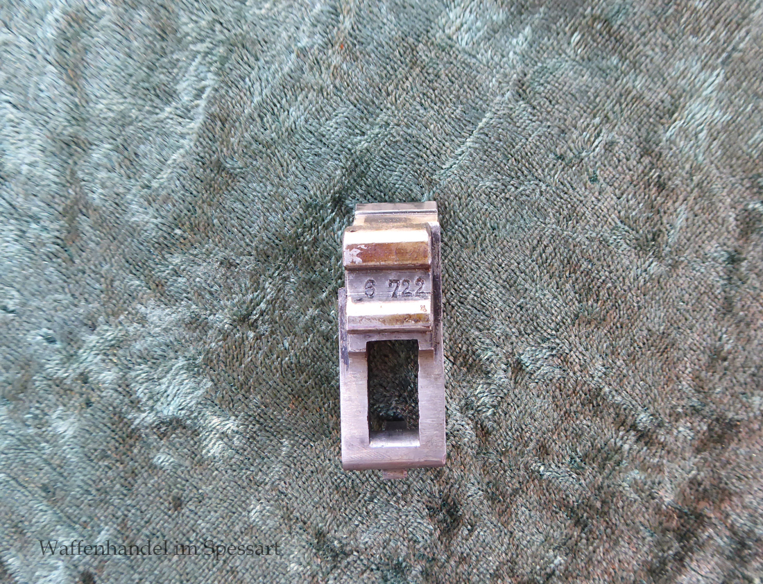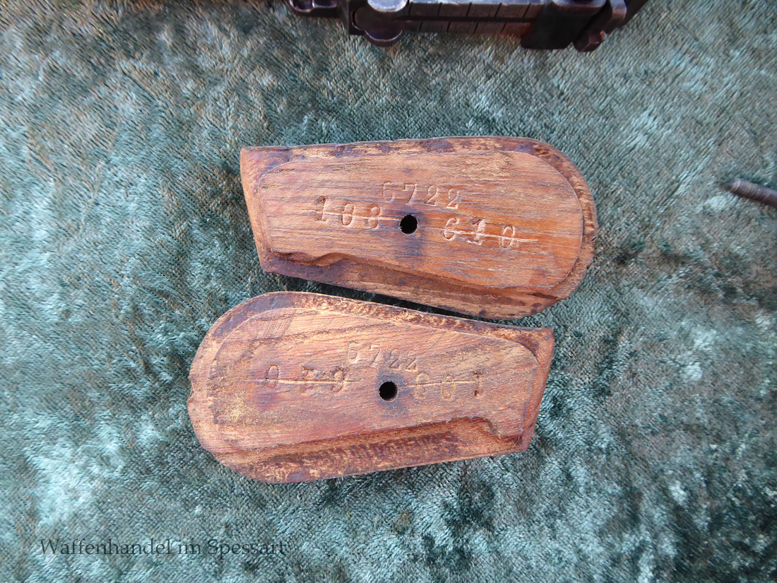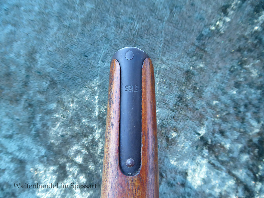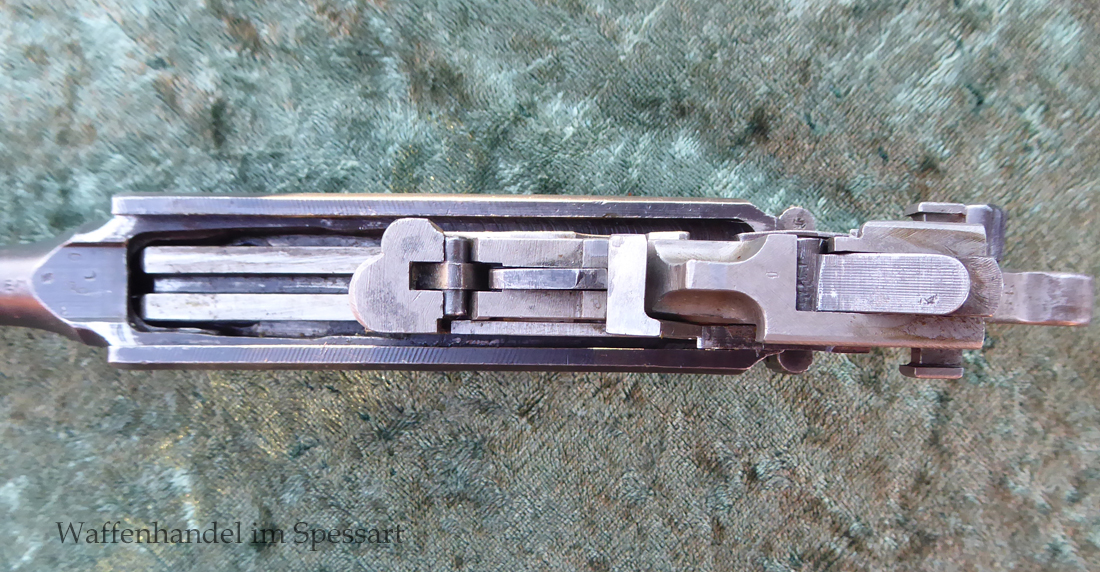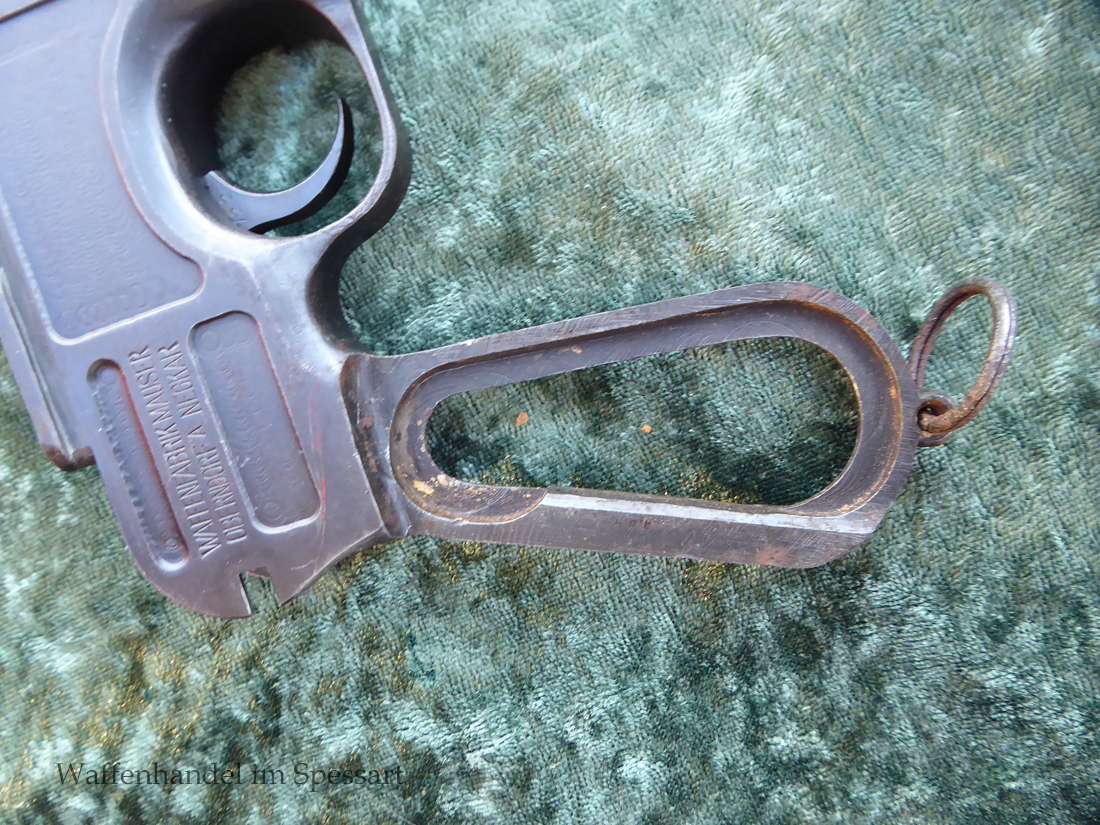 Kal.9mmLuger. Ser.Nr. 6722. Nummerngleich mit nummerngleichem Anschlagkasten. Scharfkantiges fast blankes Laufinnere. Sehr gute originale Brünierung. Gültiger kaiserlicher ziviler U unter Krone. Schiebevisier bis 500 Meter. Gute stramme Mechanik. Der nummerngleiche Anschlagkasten ist im identischen sehr gutem Zustand. Bei den Griffschalen wurden wuhl im Feld oder in einer kleinen Werstatt, die Nummer gestrichen und danach mit der 6722 geschlagen.