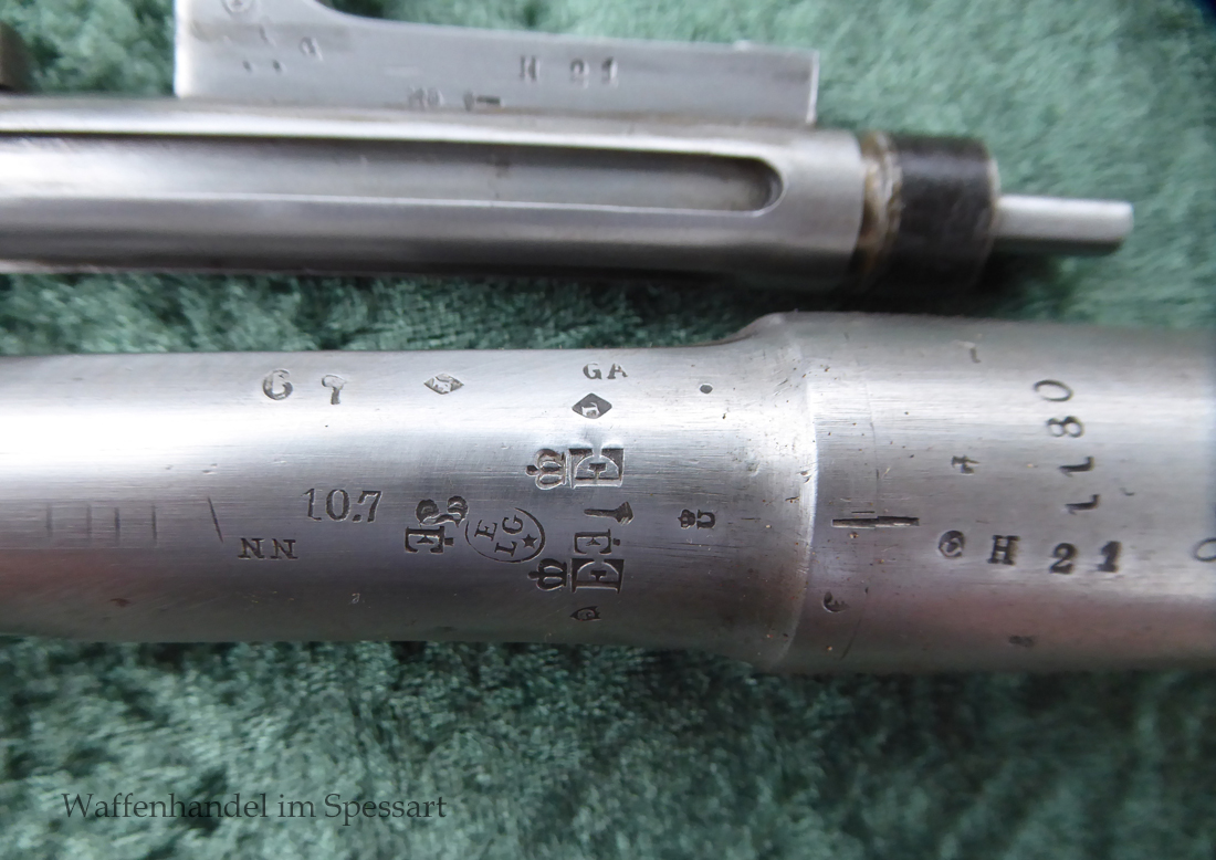 Das Gewehr hat einen heute noch gültigen belgischen Beschuß auf der Unterseite (siehe Foto). Laufunterseite und Verschluß mit dem Peron (Lütticher Vorbeschuß) und auf der Laufunterseite der Beschußstempel ELG im Oval.