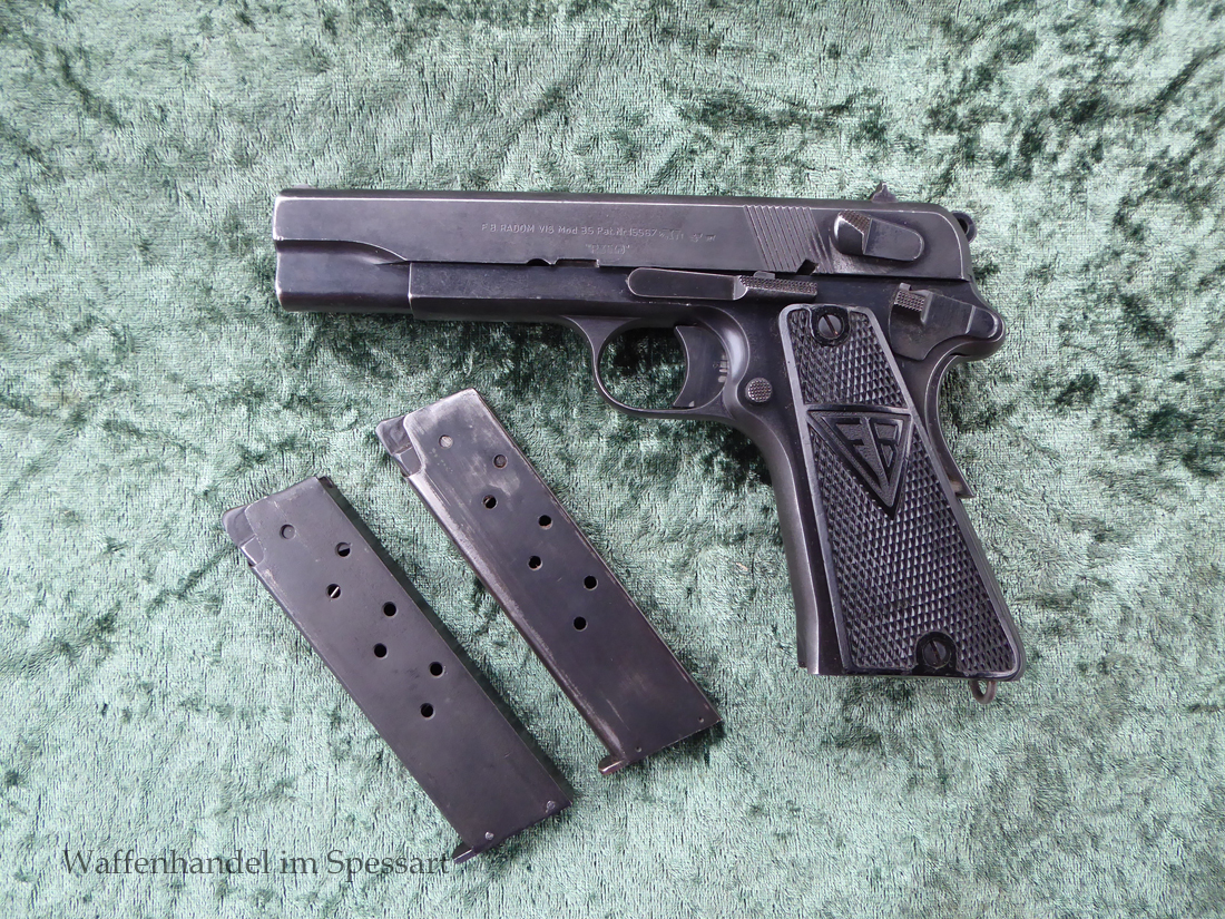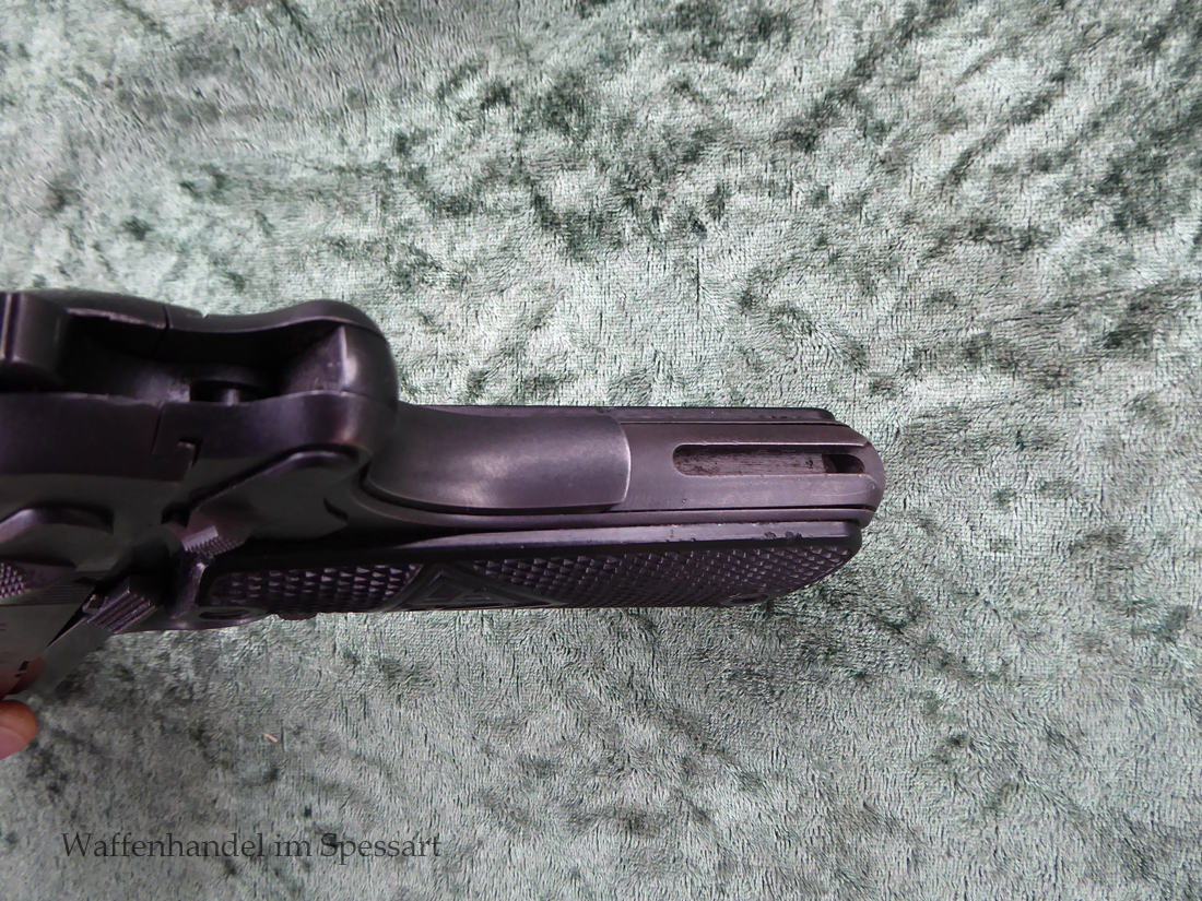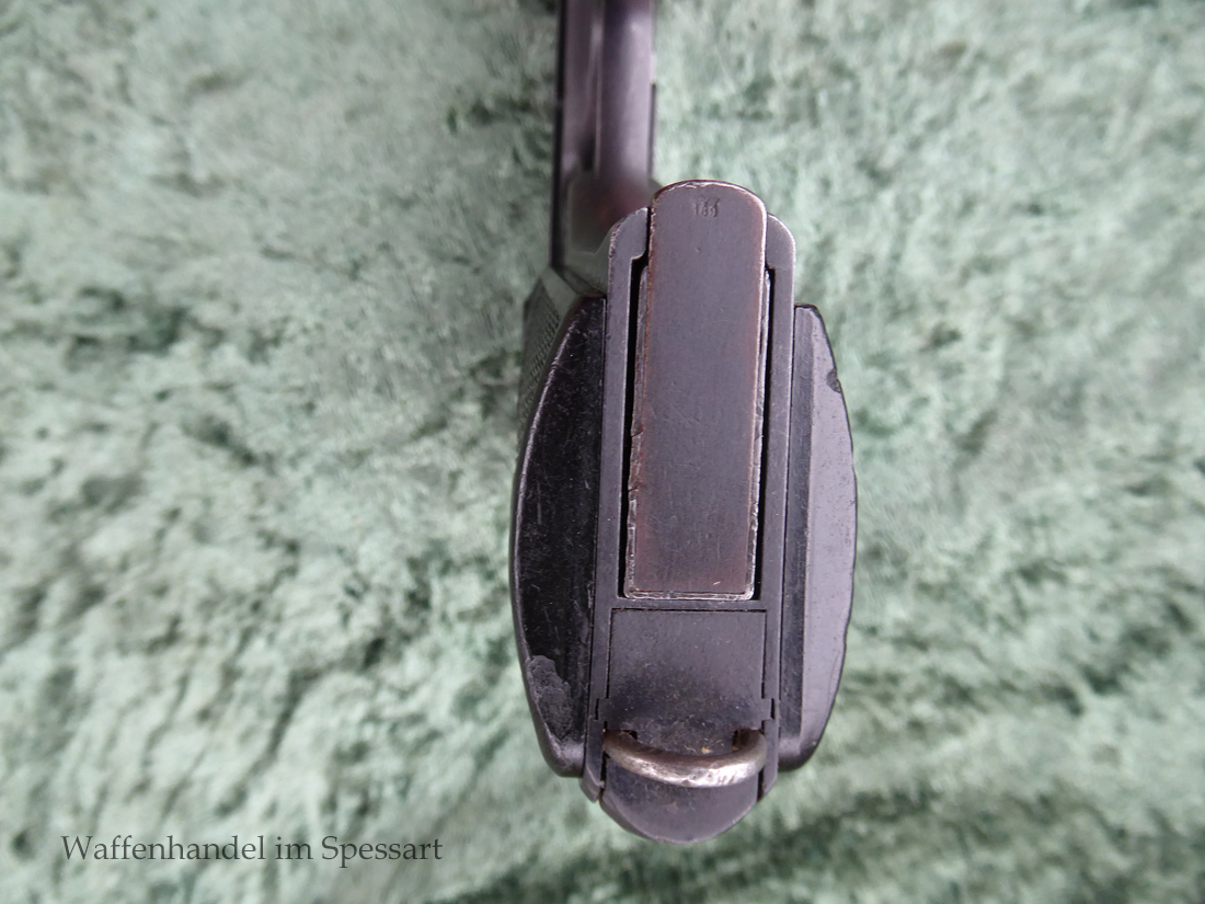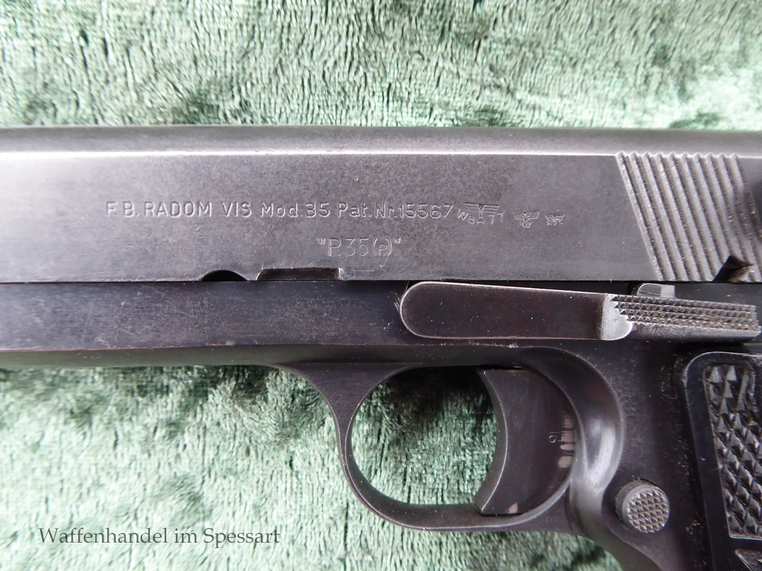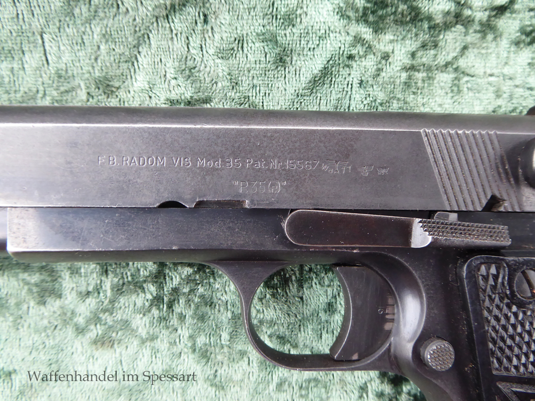 Kal.9mmLuger, Ser.Nr. 147. Baujahr 1939. Erste Serie die unter der deutschen Besetzung gefertigt wurde. Das Griffstück noch aus der polnischen Fertigung, die bei der Besetzung der Radom Werke vorgefunden wurden. Der Verschluß und Lauf wurde unter der deutschen Besetzung gefetigt und die Pistole zusammengebaut und ausgegeben. Deshalb das Griffstück ohne Waa und der Verschluß mit Waa 77. Nummerngleich, scharfkantiges fast blankes Laufinnere. Gute orig. Brünierung. Das Magazin in der Pistole ohne Waa wie es zu dieser Pistole sein muß und ein zweites mit Waa 189. Leichte Gebrauchspuren. Griffstück mit Nut für den Anschlagkasten.