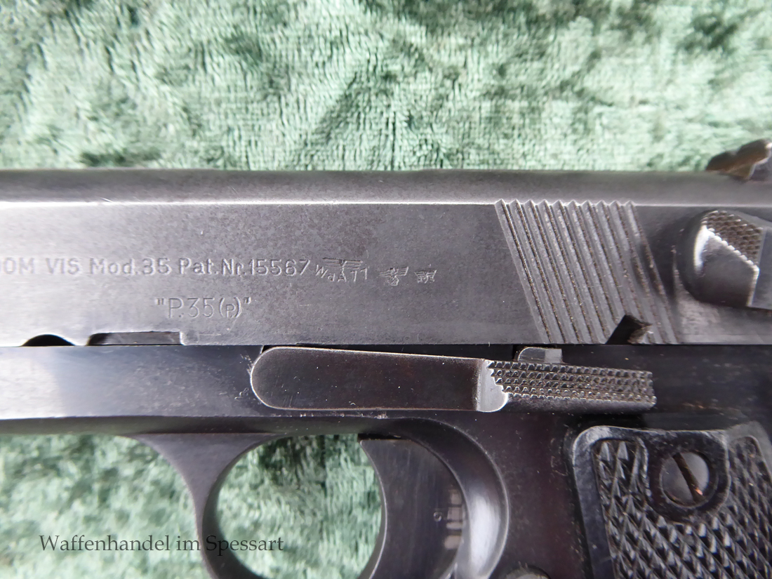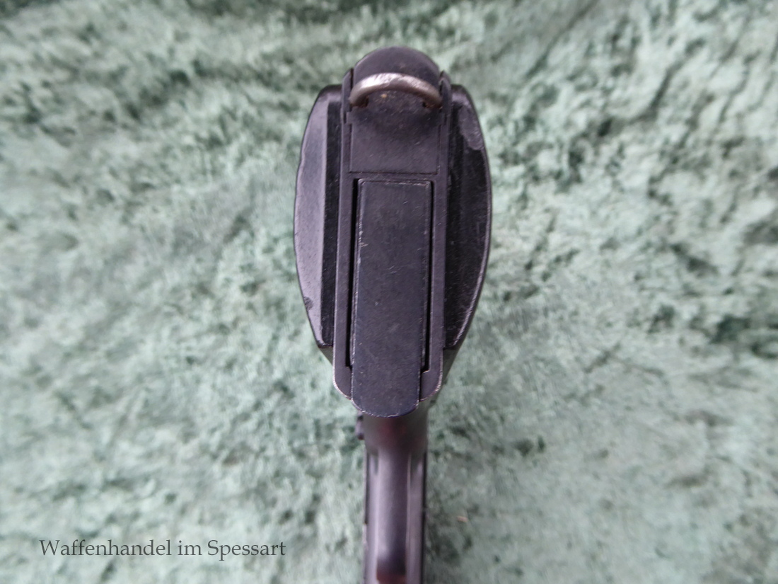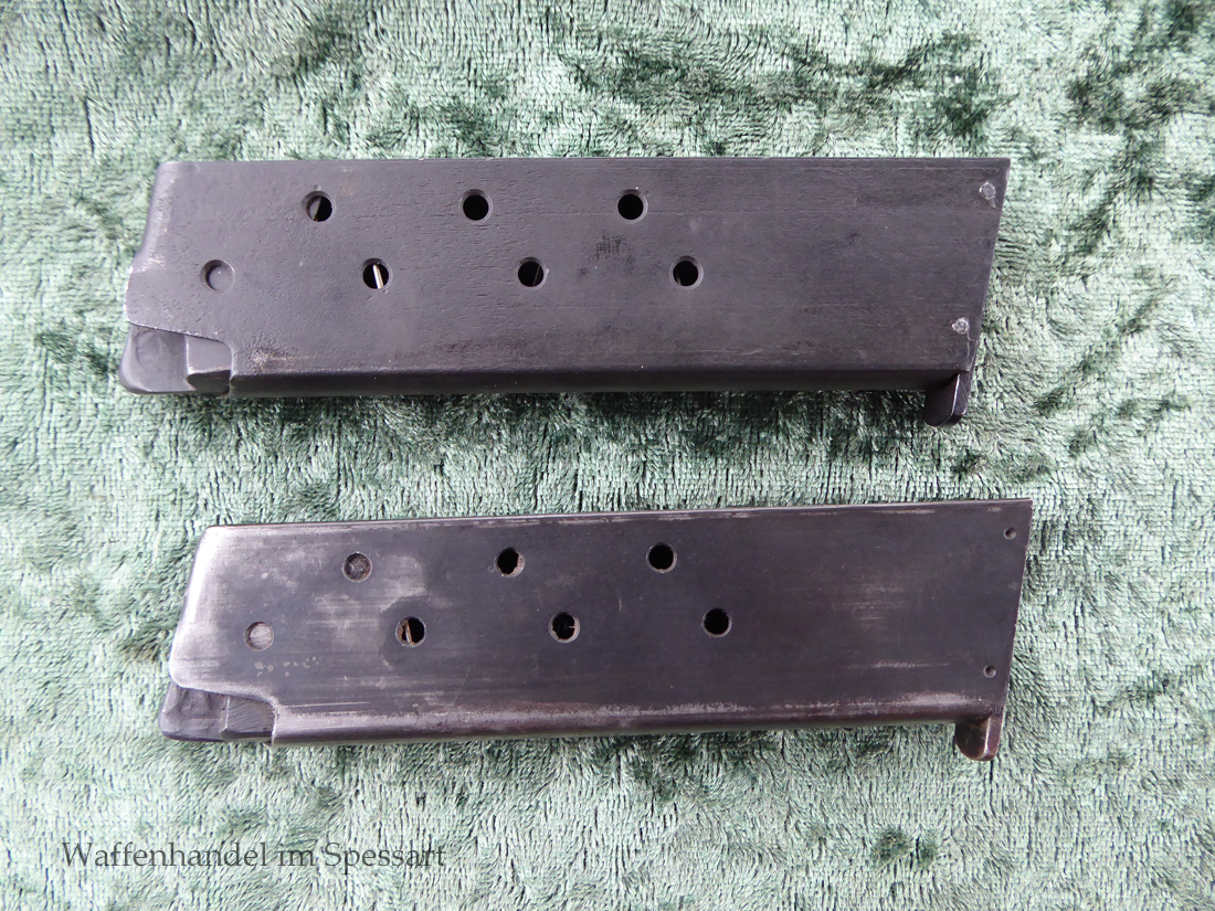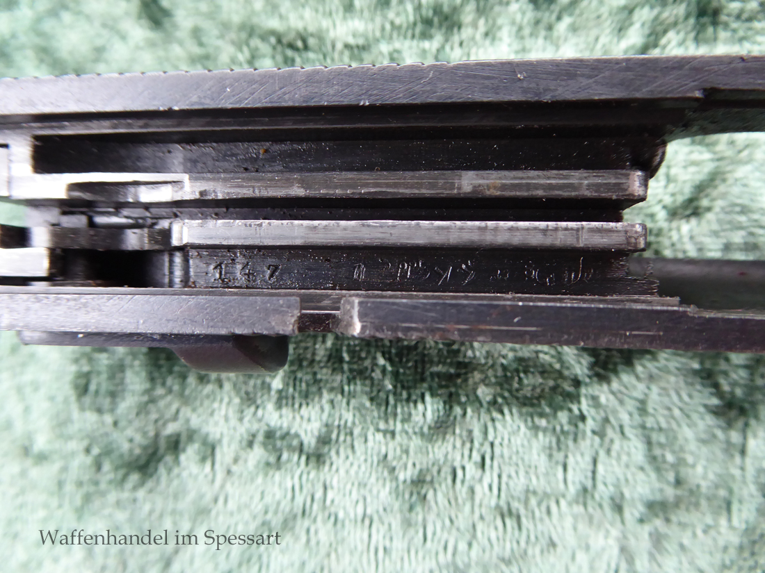 Kal.9mmLuger, Ser.Nr. 147. Baujahr 1939. Erste Serie die unter der deutschen Besetzung gefertigt wurde. Das Griffstück noch aus der polnischen Fertigung, die bei der Besetzung der Radom Werke vorgefunden wurden. Der Verschluß und Lauf wurde unter der deutschen Besetzung gefetigt und die Pistole zusammengebaut und ausgegeben. Deshalb das Griffstück ohne Waa und der Verschluß mit Waa 77. Nummerngleich, scharfkantiges fast blankes Laufinnere. Gute orig. Brünierung. Das Magazin in der Pistole ohne Waa wie es zu dieser Pistole sein muß und ein zweites mit Waa 189. Leichte Gebrauchspuren. Griffstück mit Nut für den Anschlagkasten.