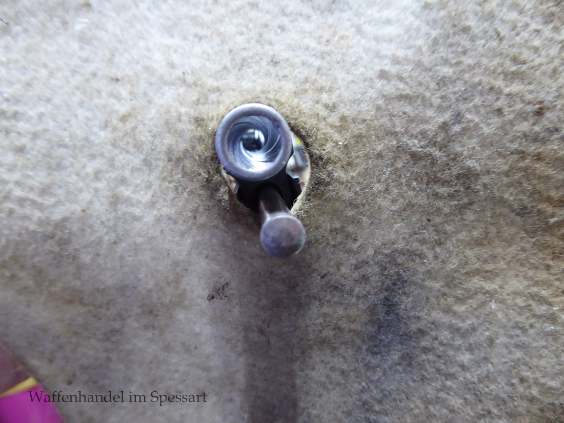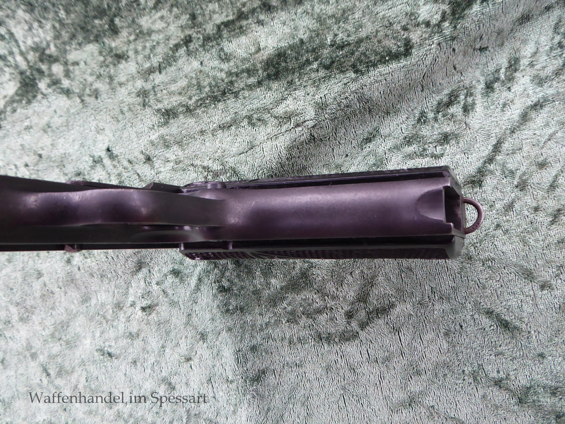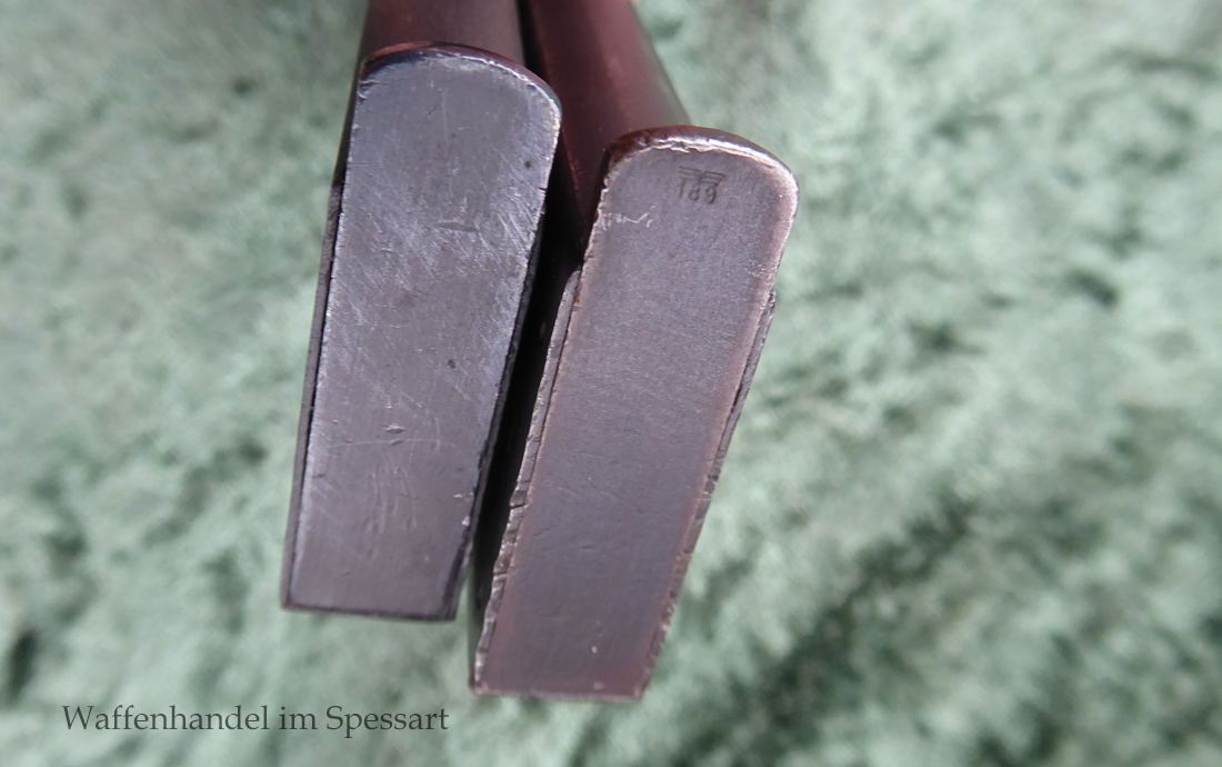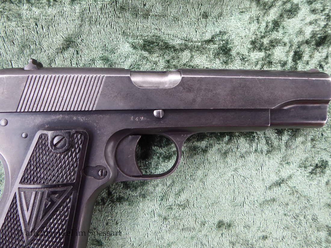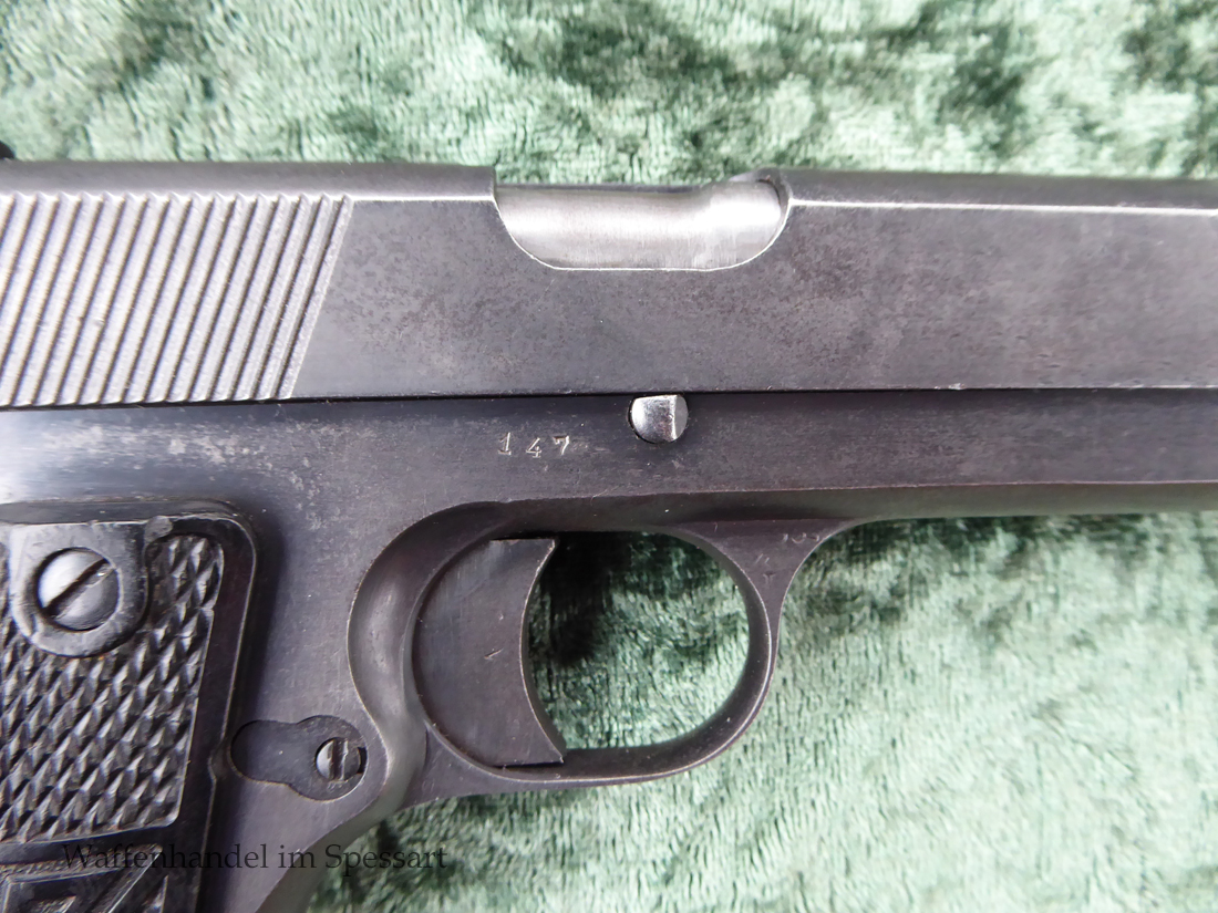 Kal.9mmLuger, Ser.Nr. 147. Baujahr 1939. Erste Serie die unter der deutschen Besetzung gefertigt wurde. Das Griffstück noch aus der polnischen Fertigung, die bei der Besetzung der Radom Werke vorgefunden wurden. Der Verschluß und Lauf wurde unter der deutschen Besetzung gefetigt und die Pistole zusammengebaut und ausgegeben. Deshalb das Griffstück ohne Waa und der Verschluß mit Waa 77. Nummerngleich, scharfkantiges fast blankes Laufinnere. Gute orig. Brünierung. Das Magazin in der Pistole ohne Waa wie es zu dieser Pistole sein muß und ein zweites mit Waa 189. Leichte Gebrauchspuren. Griffstück mit Nut für den Anschlagkasten.
