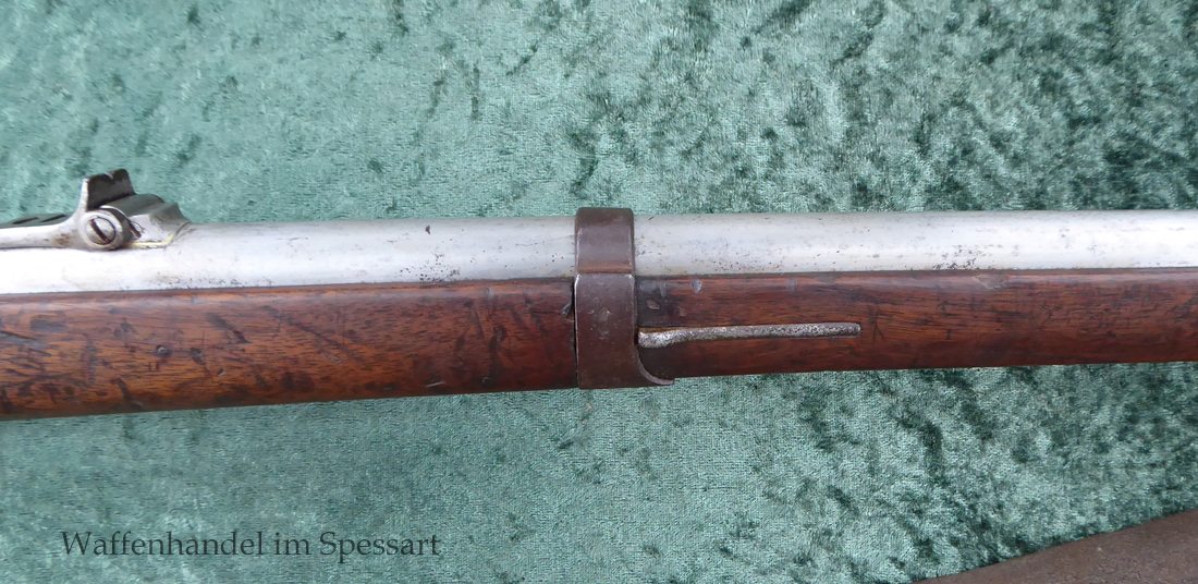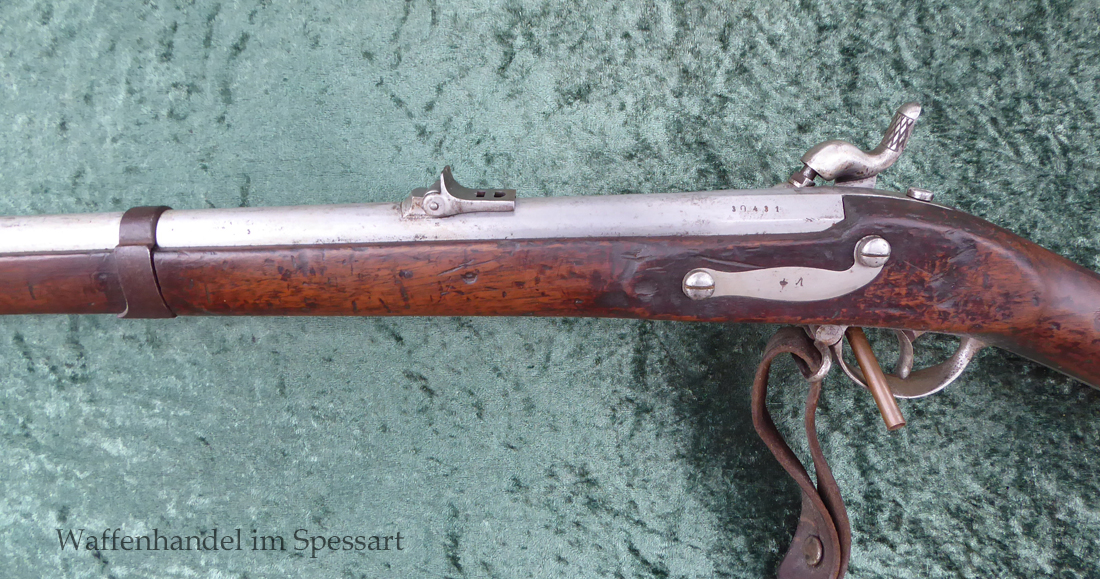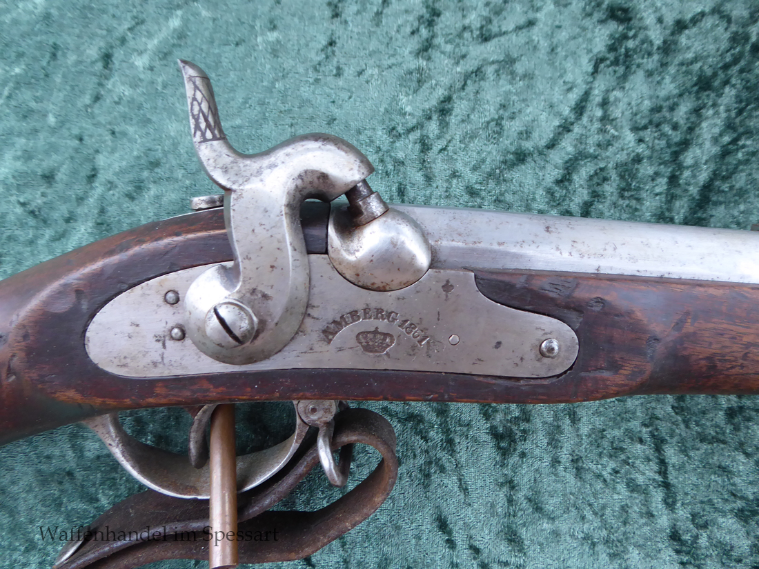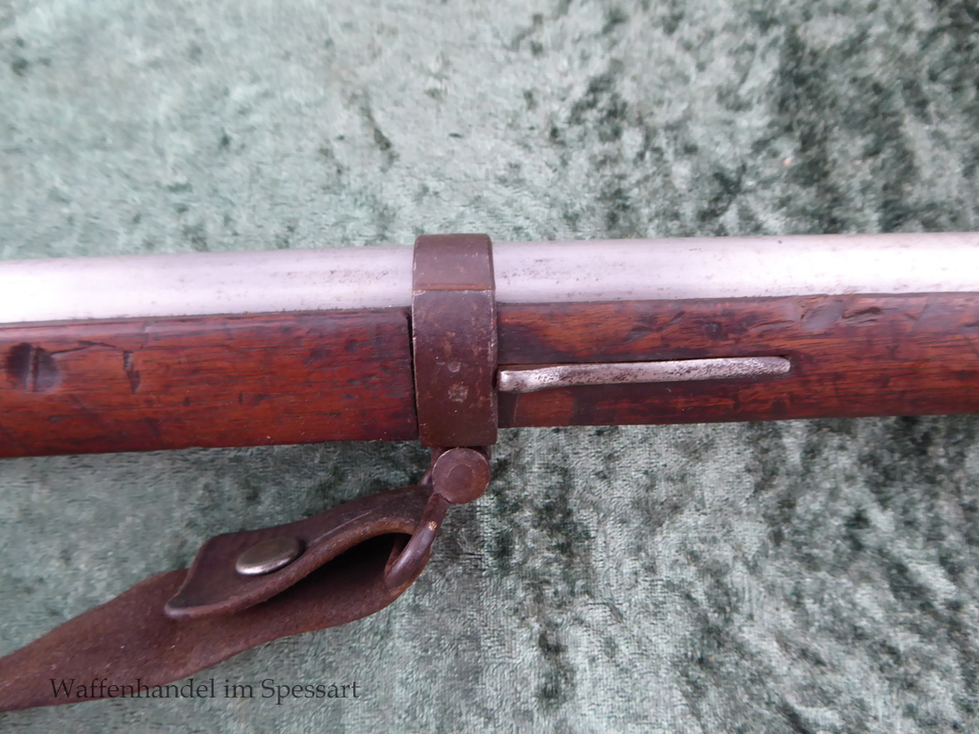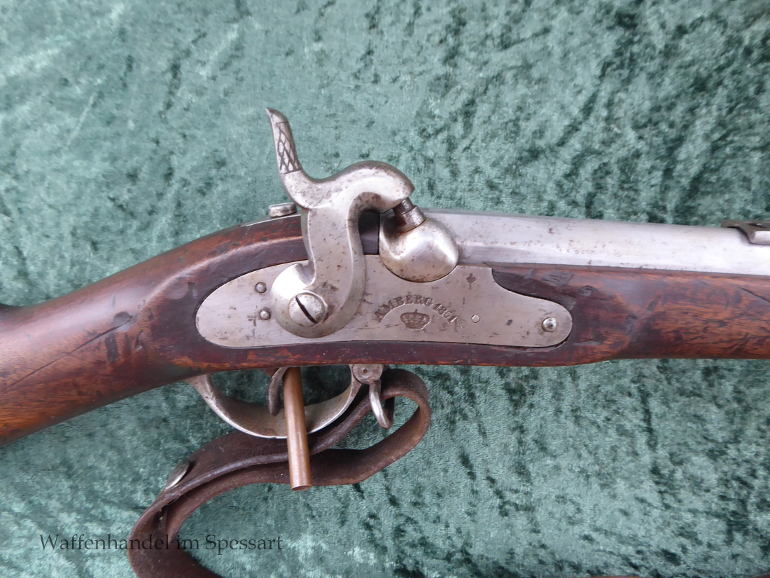 Hersteller Gewehrfabrik Amberg im Jahre 1861. Kal.13,9mm. Ser.Nr. 10431. Das vierfach gezogene Laufinnere hat sehr gute scharfkantige Felder und Züge. Die Schloßplatte ist tief und deutlich signiert. Schlossblech gemarkt "AMBERG / Krone / 1861". Das Schloß arbeute eiwandfrei.Die Bänder und der Oberring waren gebläut und sind in Patina, event. in geringen Flugrost übergegangen. Der Lauf, Abzugsbügel und Kolbenkappe sind blank mit geringer Patina. Mit dem darangewesenem originaler Riemen ohne Risse und Brüche. Durch sorgfältige Reinigung sicher zu verbessern.