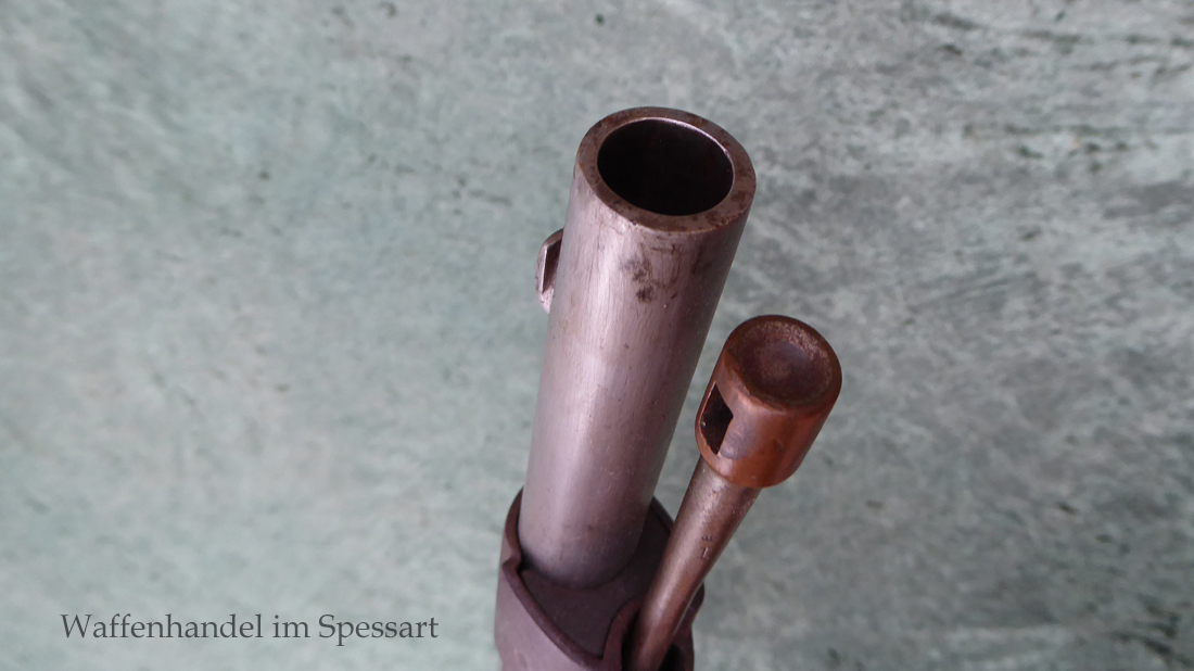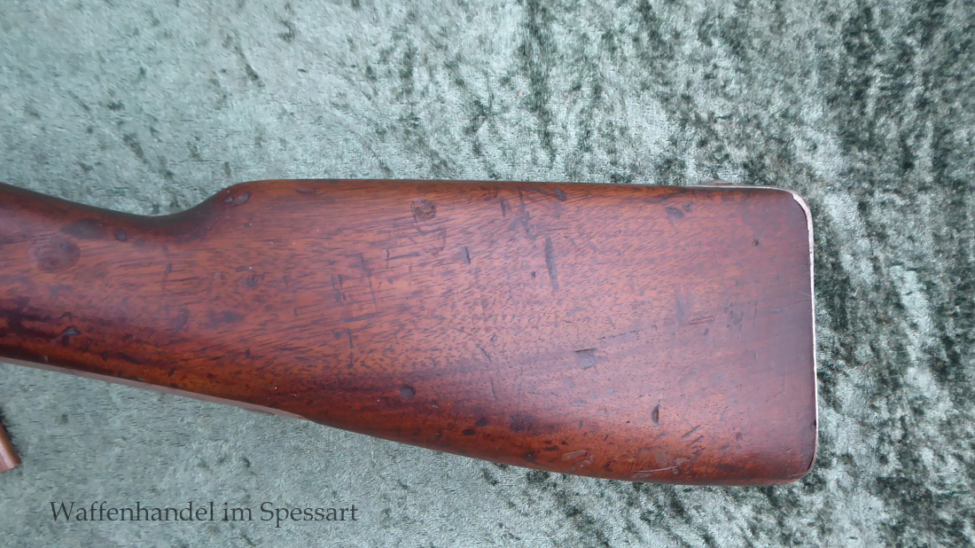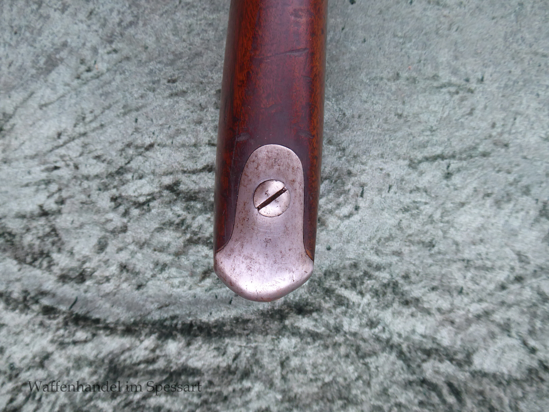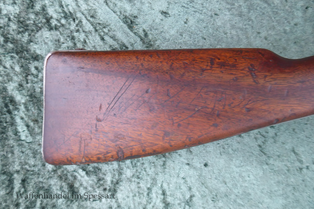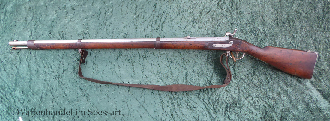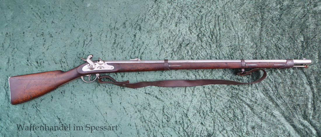 Hersteller Gewehrfabrik Amberg im Jahre 1861. Kal.13,9mm. Ser.Nr. 10431. Das vierfach gezogene Laufinnere hat sehr gute scharfkantige Felder und Züge. Die Schloßplatte ist tief und deutlich signiert. Schlossblech gemarkt "AMBERG / Krone / 1861". Das Schloß arbeute eiwandfrei.Die Bänder und der Oberring waren gebläut und sind in Patina, event. in geringen Flugrost übergegangen. Der Lauf, Abzugsbügel und Kolbenkappe sind blank mit geringer Patina. Mit dem darangewesenem originaler Riemen ohne Risse und Brüche. Durch sorgfältige Reinigung sicher zu verbessern.
