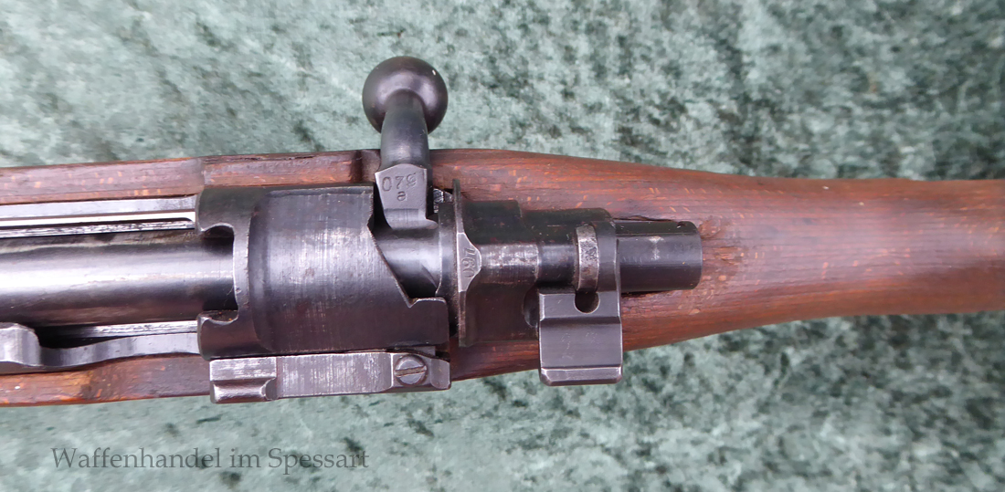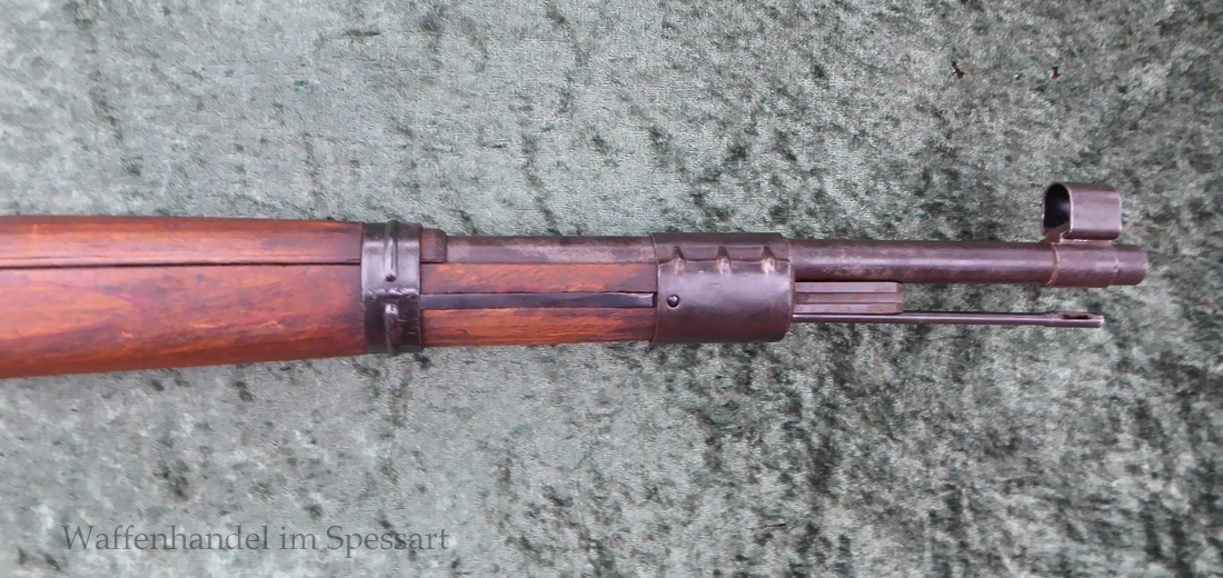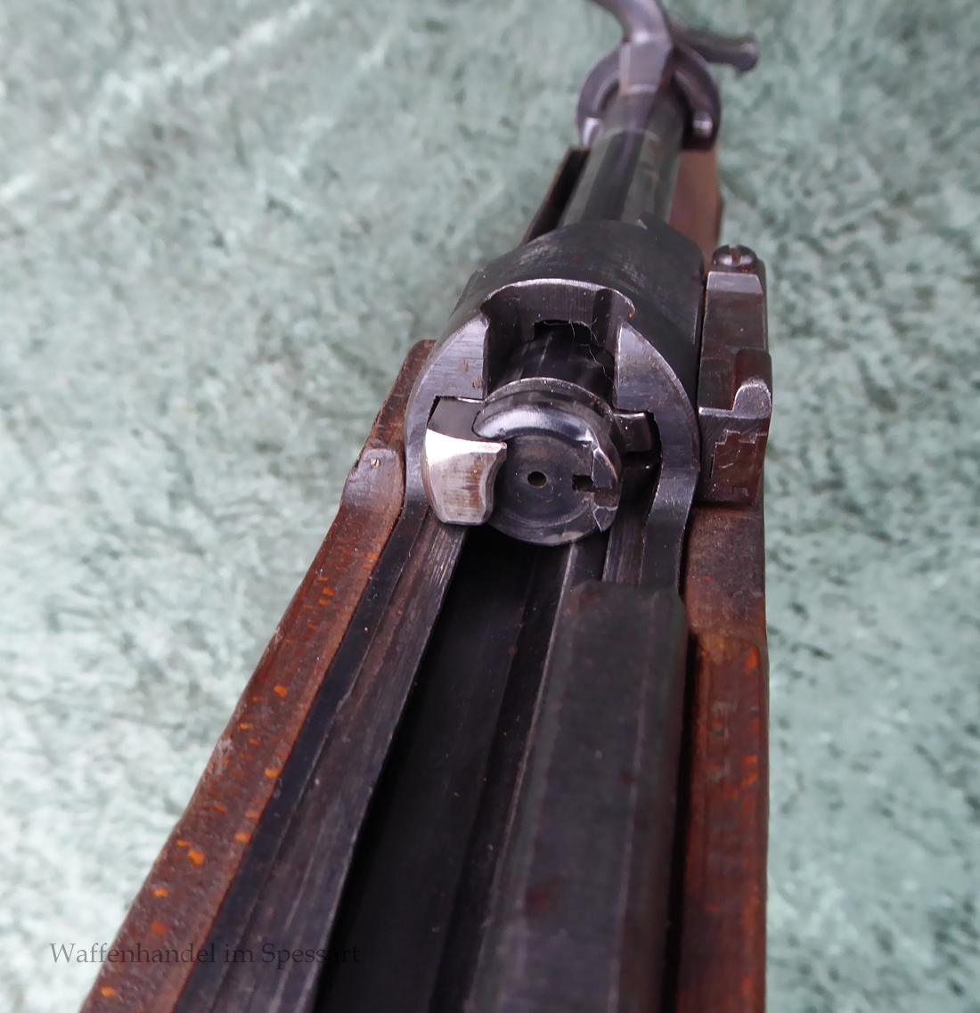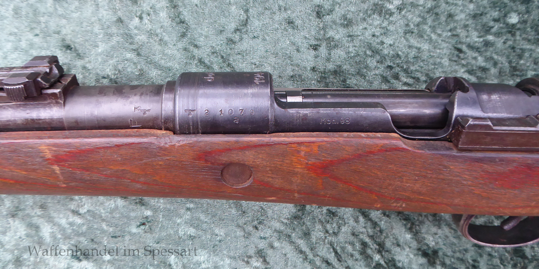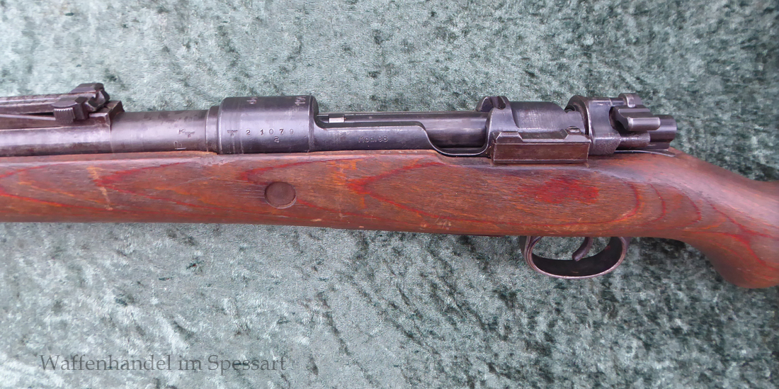 Kal.8x57is. Ser.Nr. 21079a. Nummerngleich. Das Laufinnere hat sehr gute scharfkantige Felder und Züge und ist fast blank (geringe Anhaftungen im Mündungsbereich). Gute orig. Brünierung mit geringen Alterspuren! Guter Schichtholzschaft, der innen nummeriert ist.