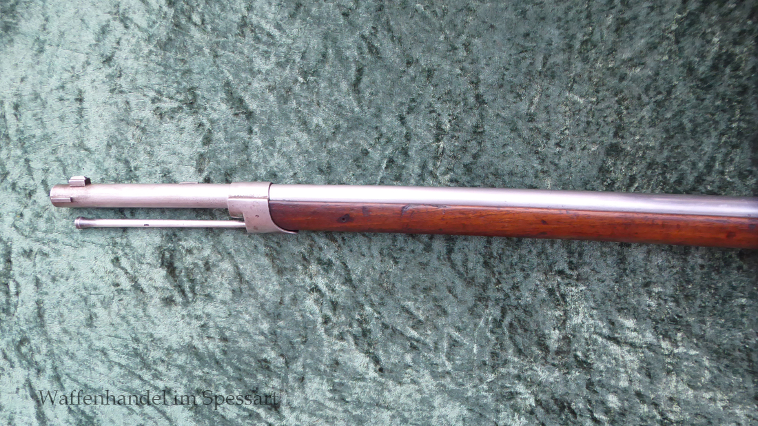 Kal.11mmChassepot Zündnadelpatrone. Ser.Nr. X6414. Nummerngleich. Sogar der Entladestock hat die gleiche Nummer!. Das Laufinnere ist scharfkantig und nur gering matt. Die Metallteile haben äußerlich nur geringe Patina. Alle Stempel im Metall sind tief und deutlich. Der schöne Schaft mit sehr gut erhaltenen tiefen Abnahmen! Dieser 1872 bei seiner Überholung gestempelt mit der gleichen Nummer. Er hat auch mehere Abnahmen im Holz. Auf der Kolbenkappe 4Z für das 4. Zuaven Regiment gestempelt. Es hat bei seiner Überholung 1872 ein langes Visier erhalten. Die Dichtung ist orignal. Die Dichtung ist neu. Gut funktionierendes Schloß mit strammer Feder. Voll funktionsfähiges Gewehr.