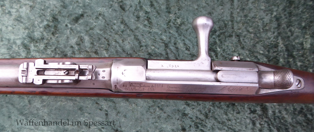 Hergestellt von A. Francotte in Liege. Die Signaturen auf der linkes Systemhülse: Es wurde in der Gewehrfabrik in Châtellerault 1872 überholt. (Epreuve de Etat Châtellerault 1872) Die Rüstungs Kommissions Beschrifftung die die ausländischen Waffen prüfte während des Konflikts von 1870-1871 (Commission d Armement Commerce 1870-1871).