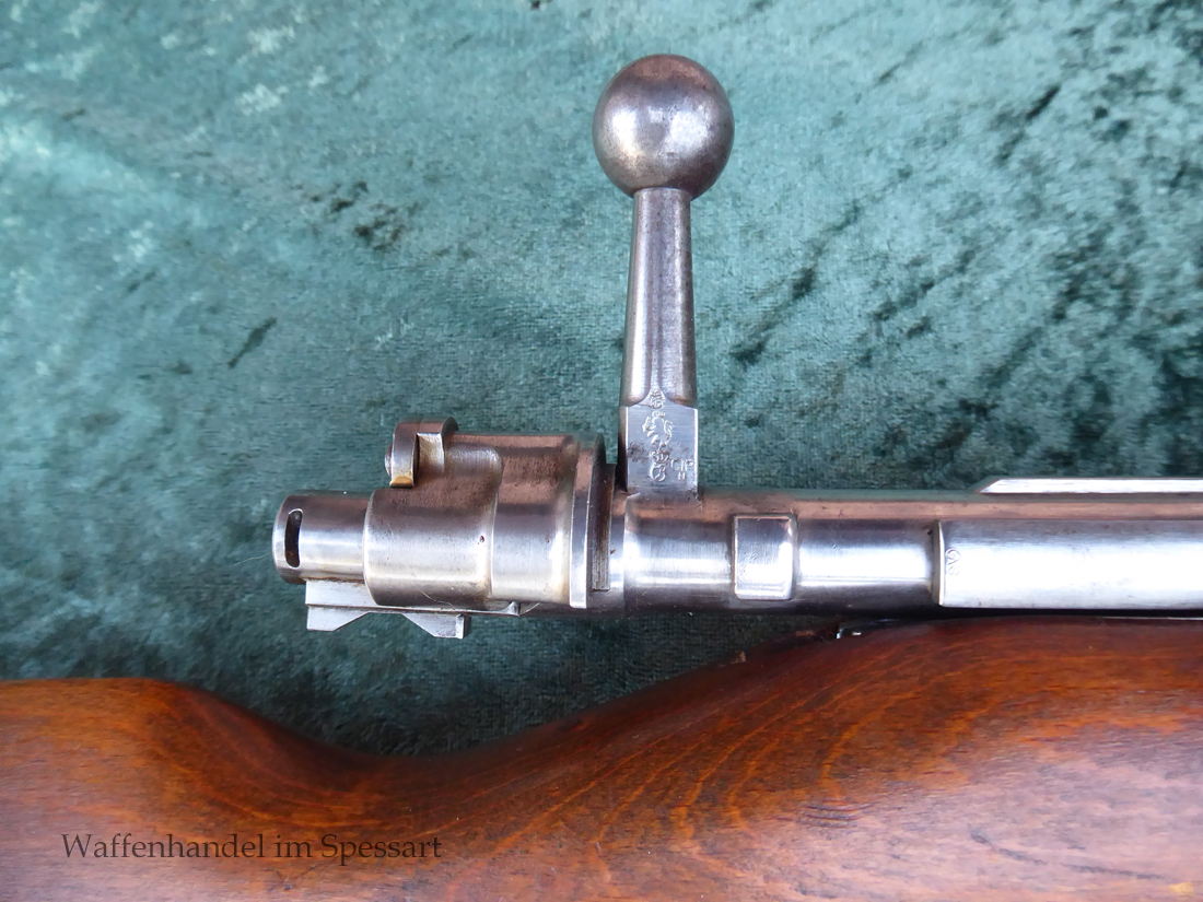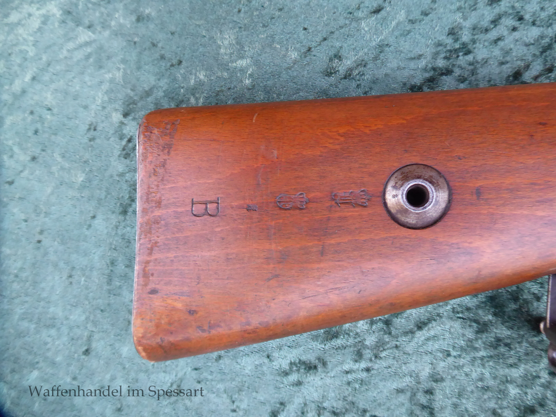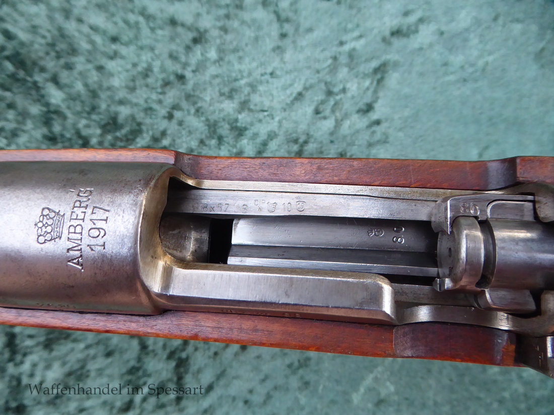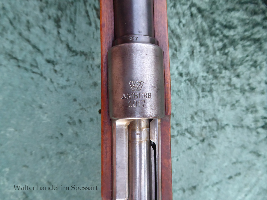 Hersteller Gewehrfabrik Amberg im Jahr 1917. Kal.8x57is, Ser.Nr.2680f. Nummerngleich inkl. Reinigungsstab. Das Laufinnere hat scharfkantige Felder und Züge. Es ist blank! Die originale Brünierung ist sehr gut erhalten. Das blanke Hülsensystem und der verschluß hat eine hauch von Patina, kein Rost! Schöner heller Schaft mit geringen Gebrauchsspuren. Die Abnahmestempel im Schaft sind tief und sehr gut erhalten. EWB Schaftstempel für Einwohnerwehr Bayern.