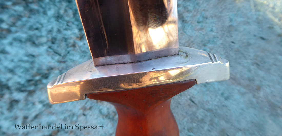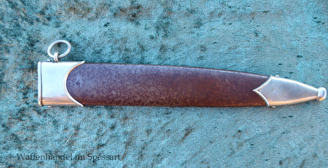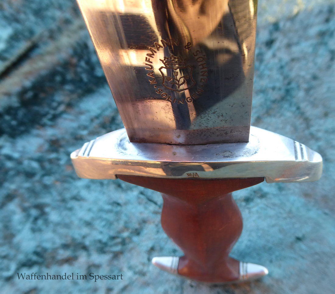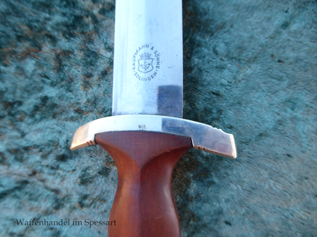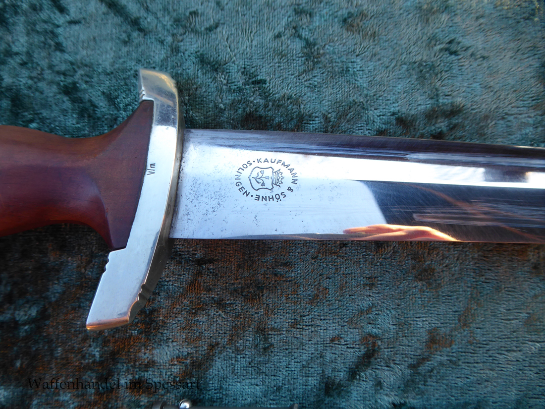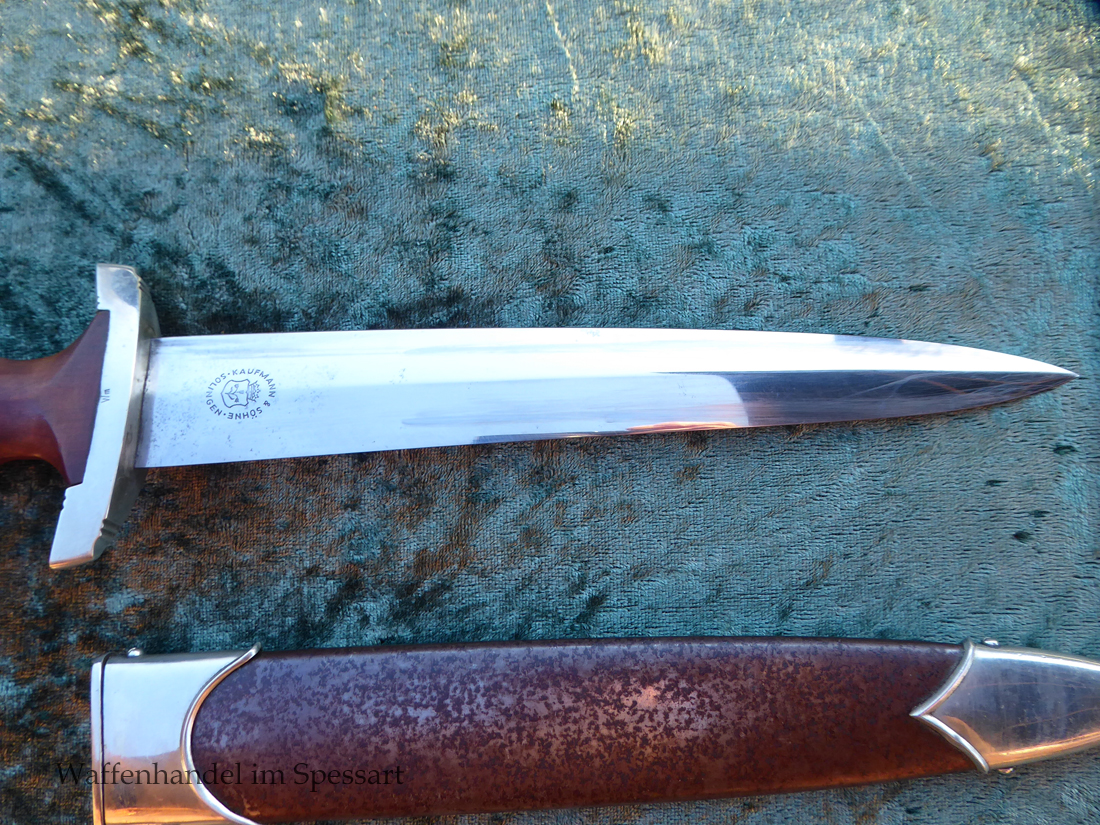 Hersteller Kaufmann & Söhne Solingen. Gaustempel Wm für Gau Westmark auf der Parierstange geschlagen. Die Griff- und Scheidenbeschläge sind aus Neusilber. Der Adler ist in Neusilberausführung. Die Scheide ist original bräuniert und hat altersbedingt Flecken aber keine Rostnarben.. Die Klinge ist geätzter Devise Alles für Deutschland. Die Klinge ist orginal blank erhalten!. Der Dolch geht gleitend und saugend in die Scheide.